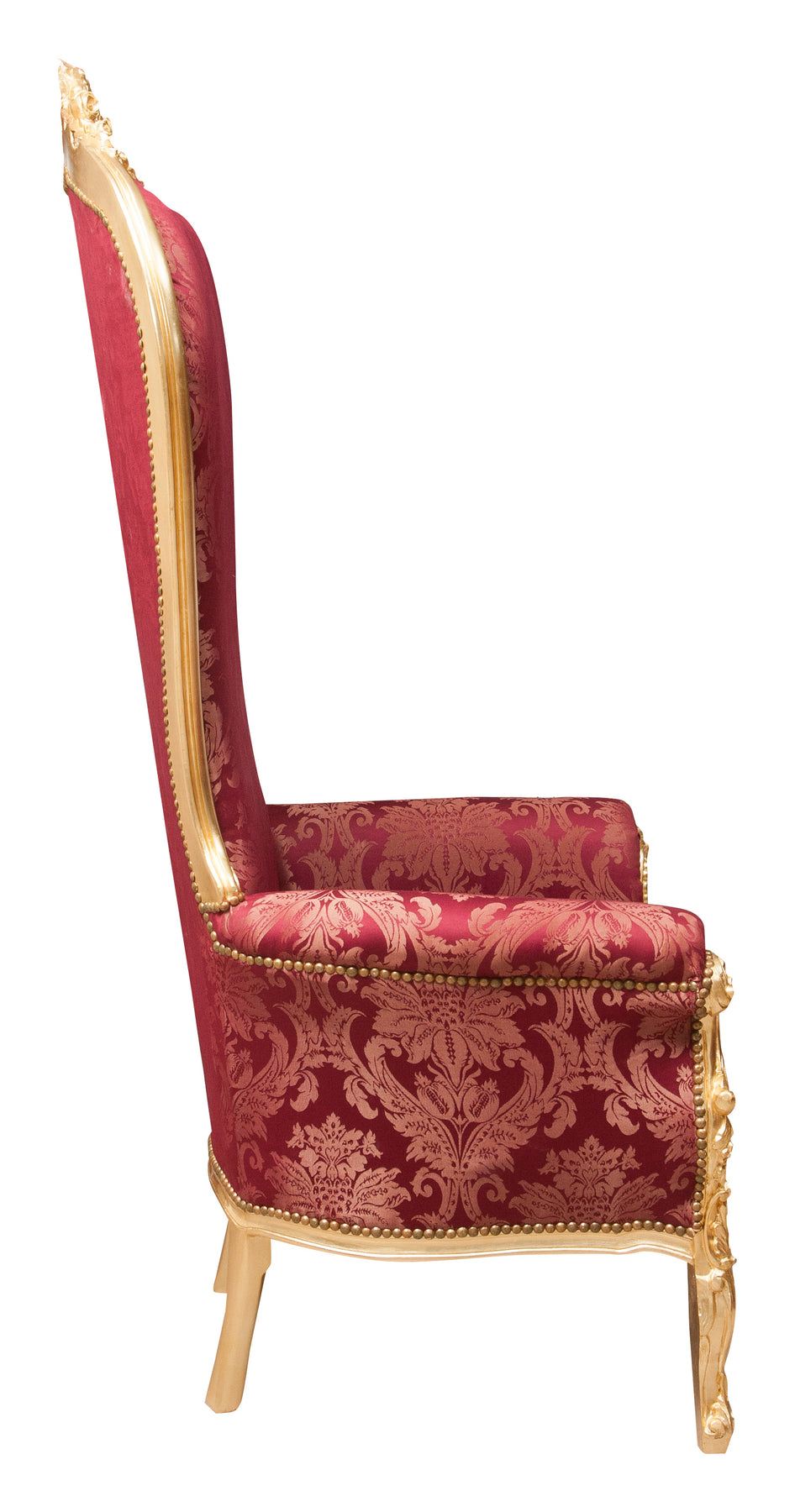 Opulenta, ricca, fastosa, decisamente intrigante, è la poltrona a trono stile francese Luigi XVI, in legno massello di faggio, intagliata e finita a mano con patina in foglia oro di dimensioni larghezza 95 cm, profondità 90 cm, altezza 185 cm. Seduta e schienale imbottiti artigianalmente.