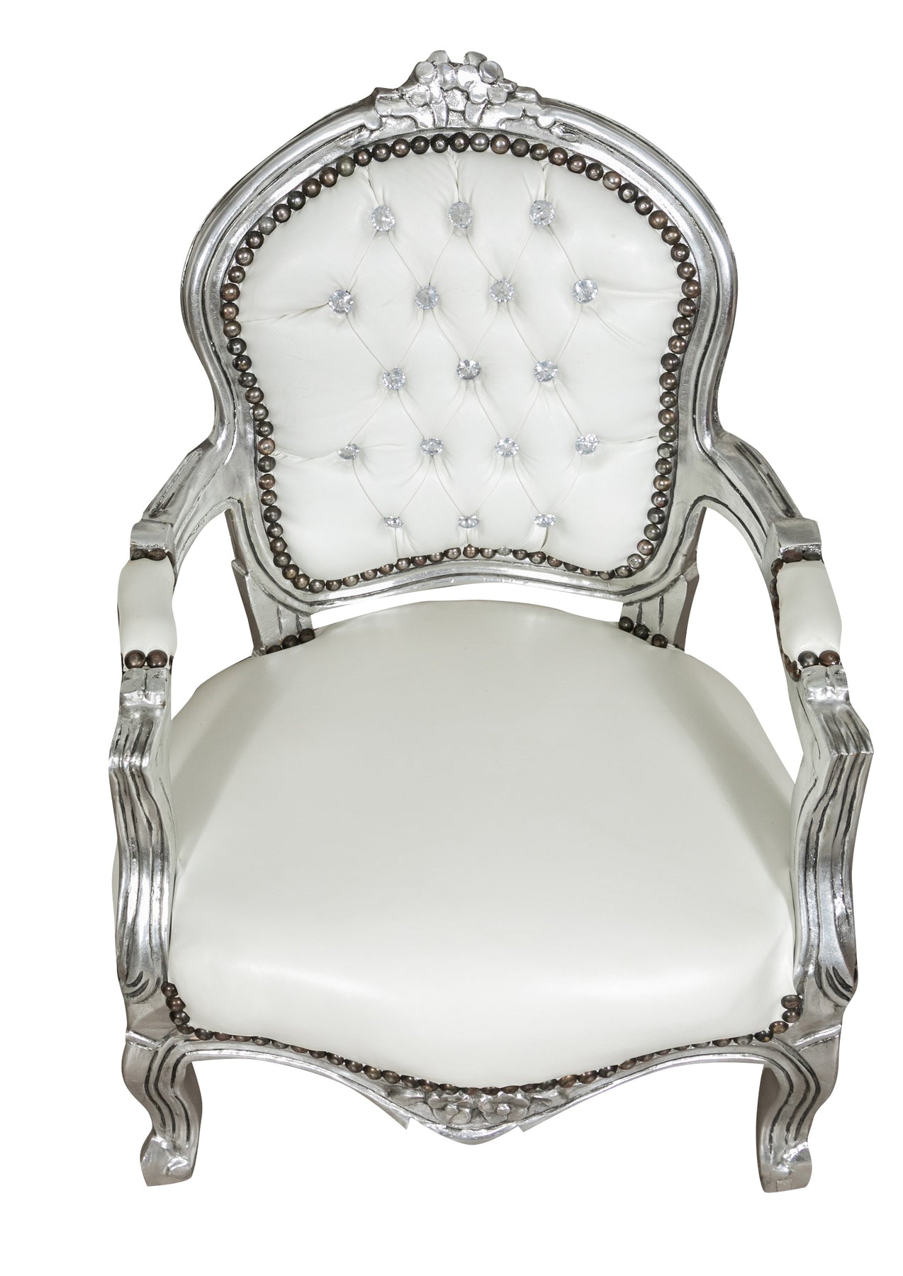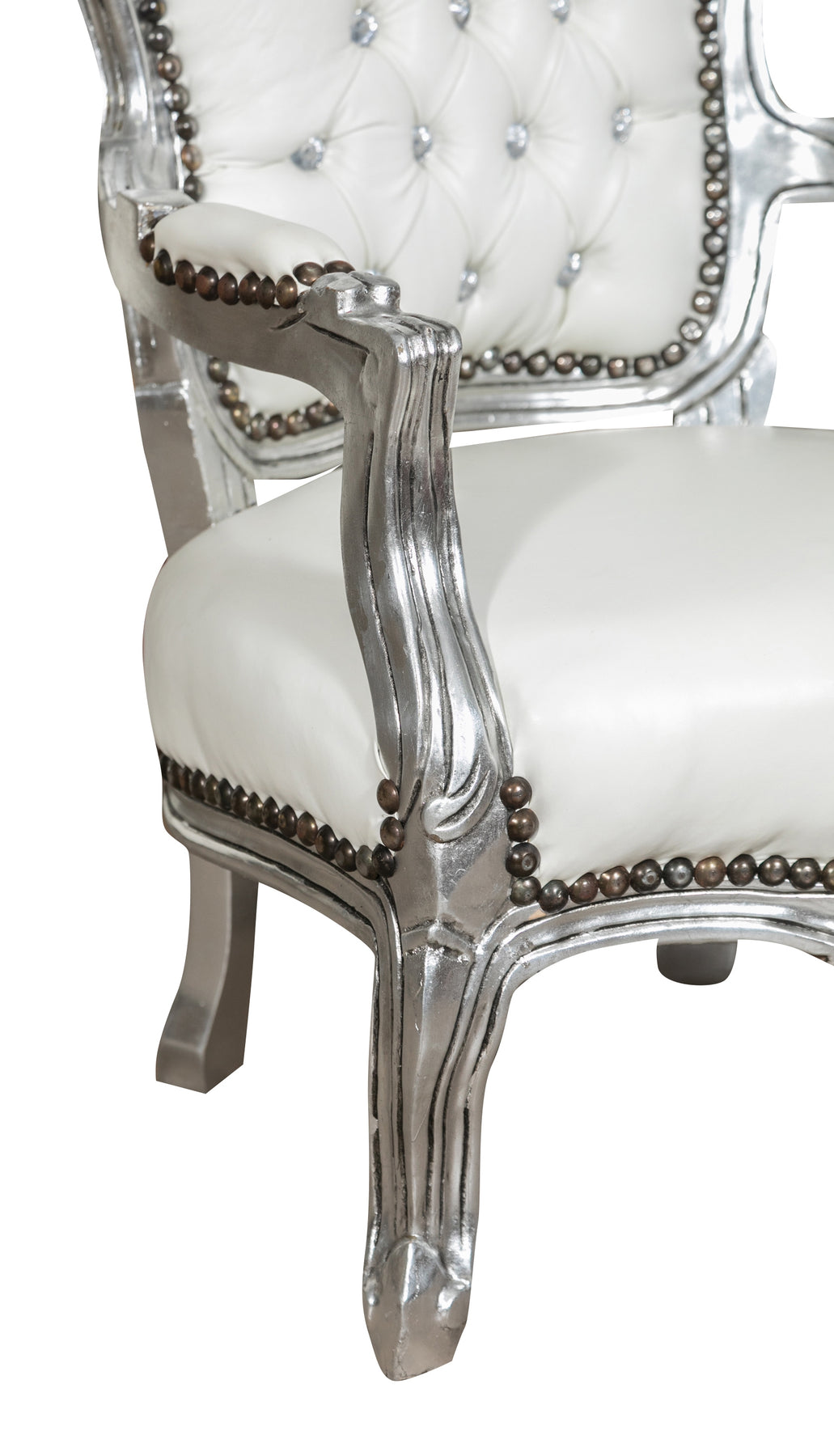 Poltrona stile francese Luigi XVI, in legno massello di faggio, intagliata a mano. Finitura argento anticato di dimensioni larghezza 51 cm, profondità 50 cm, altezza 73 cm. Seduta e schienale imbottiti artigianalmente.