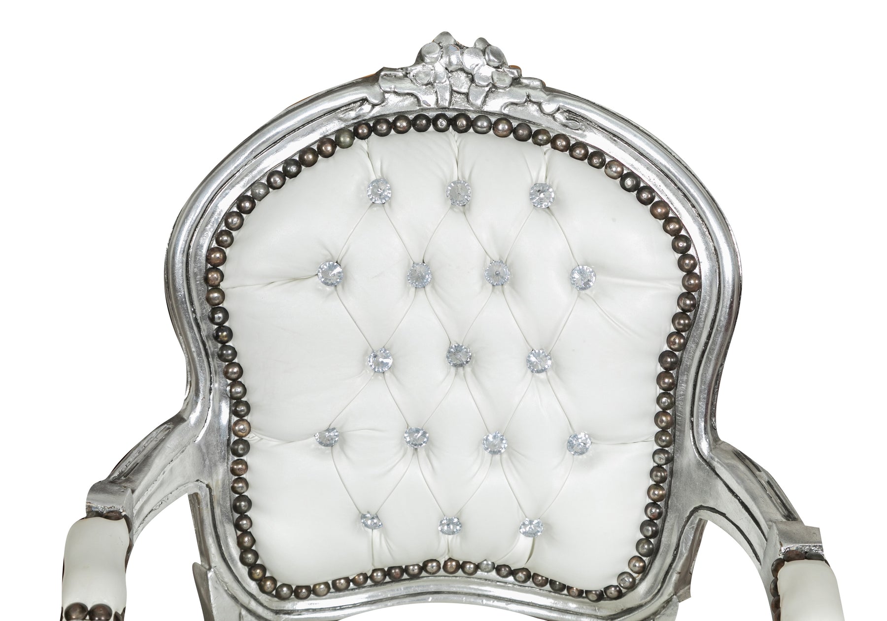 Poltrona stile francese Luigi XVI, in legno massello di faggio, intagliata a mano. Finitura argento anticato di dimensioni larghezza 51 cm, profondità 50 cm, altezza 73 cm. Seduta e schienale imbottiti artigianalmente.
