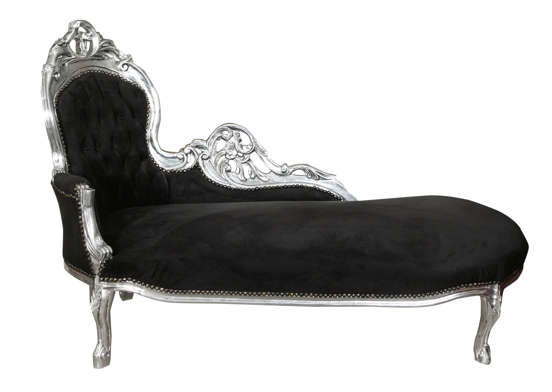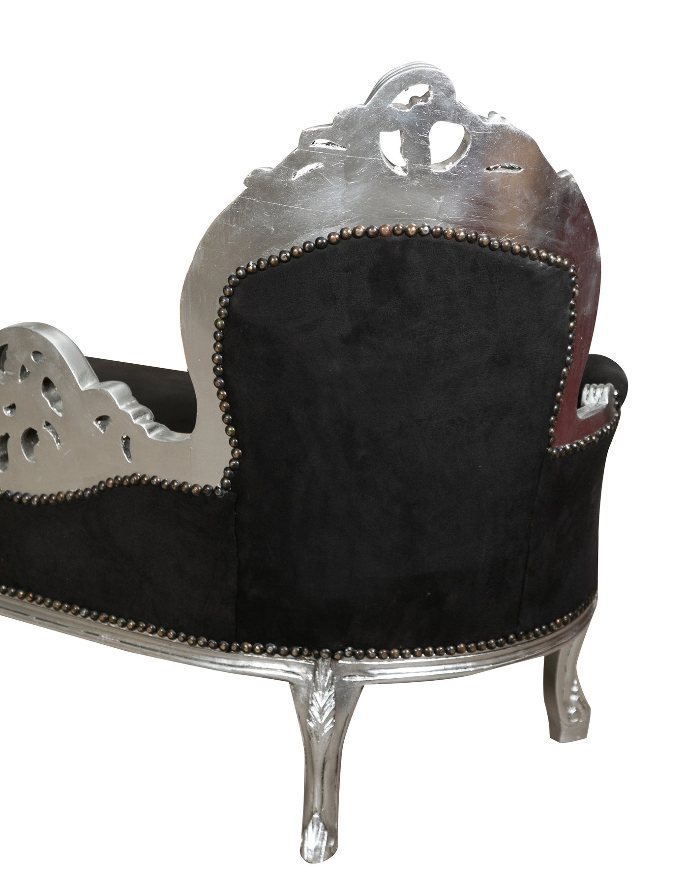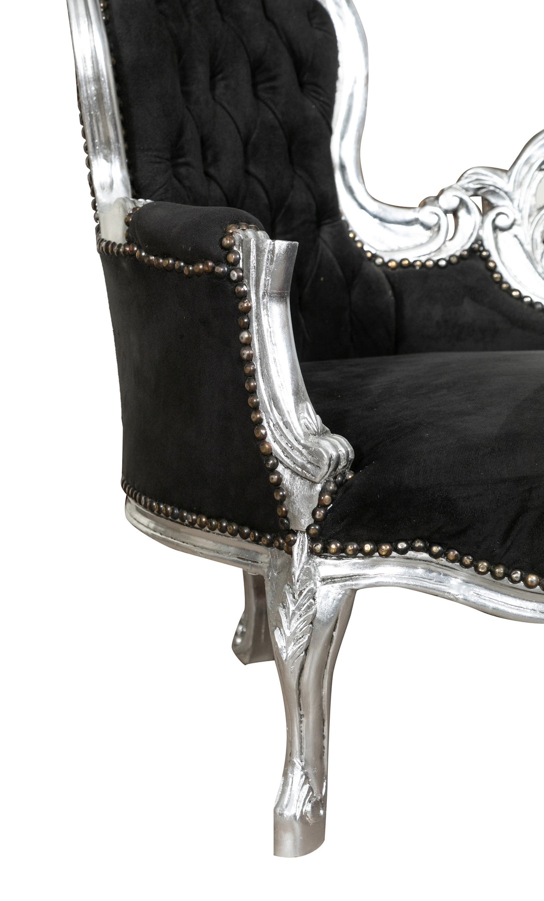Poltrona paolina in stile francese Luigi XVI, in legno massello di faggio, intagliata e finita a mano con patina in foglia argento e seduta nera. Larghezza 76 cm, profondità 155 cm, altezza 98 cm. Seduta e schienale imbottiti artigianalmente.