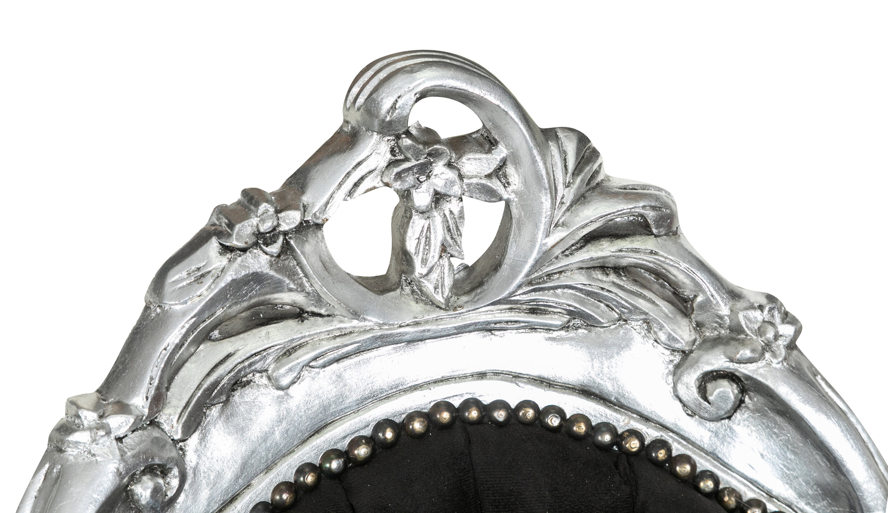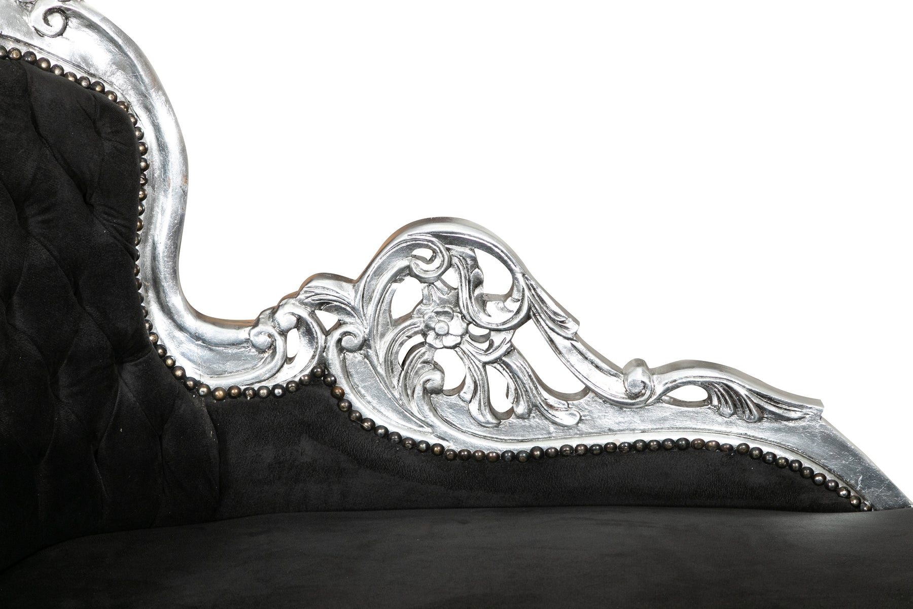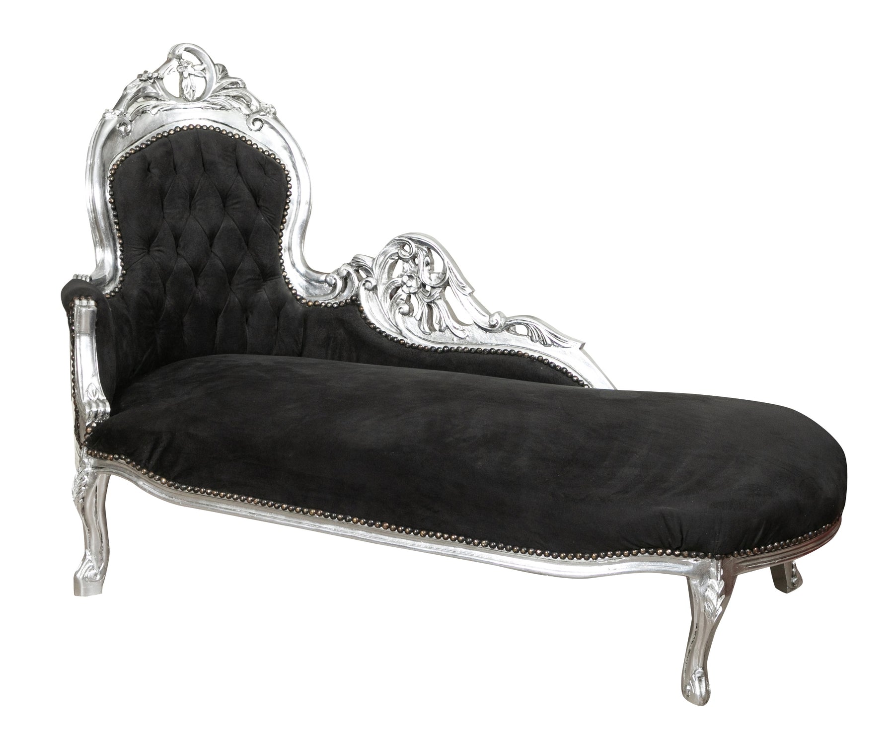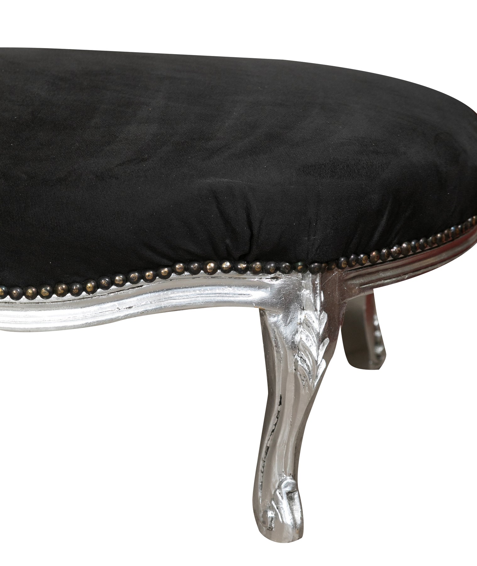 Poltrona paolina in stile francese Luigi XVI, in legno massello di faggio, intagliata e finita a mano con patina in foglia argento e seduta nera. Larghezza 76 cm, profondità 155 cm, altezza 98 cm. Seduta e schienale imbottiti artigianalmente.