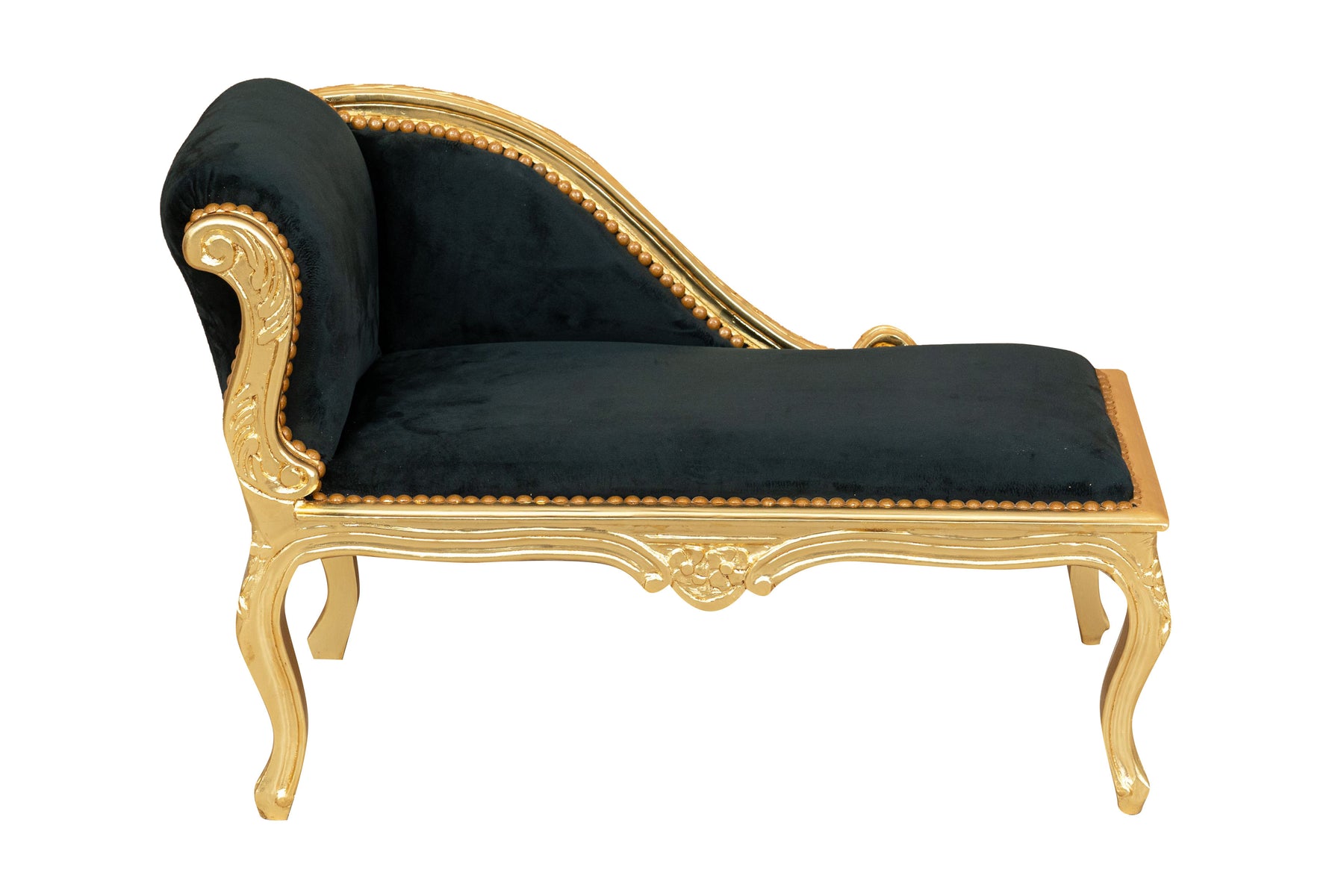 Poltrona paolina in stile francese Luigi XVI, in legno massello di faggio, intagliata e finita a mano con patina in foglia oro e seduta nera. Larghezza 94 cm, profondità 48 cm, altezza 68 cm. Seduta e schienale imbottiti artigianalmente.
