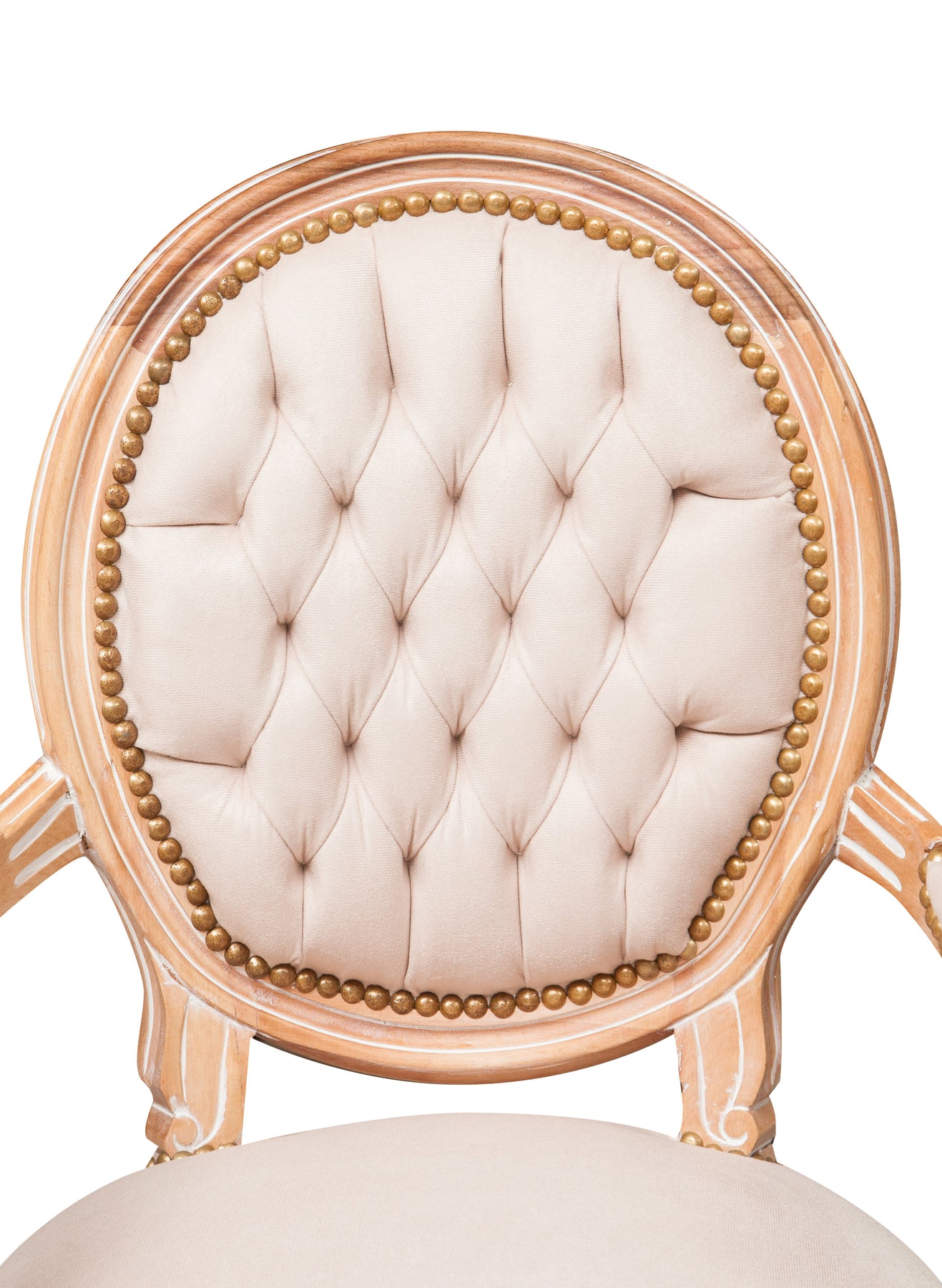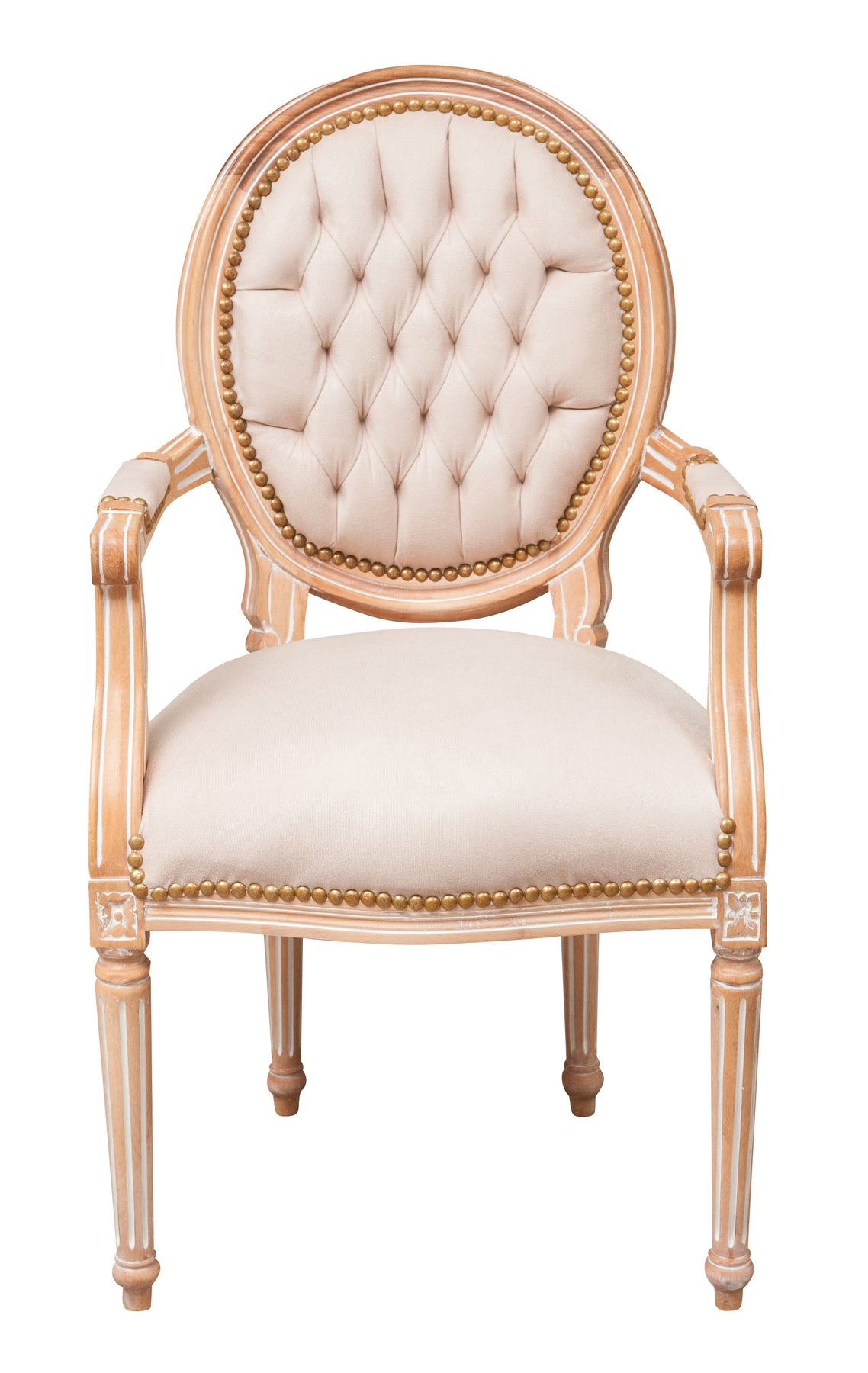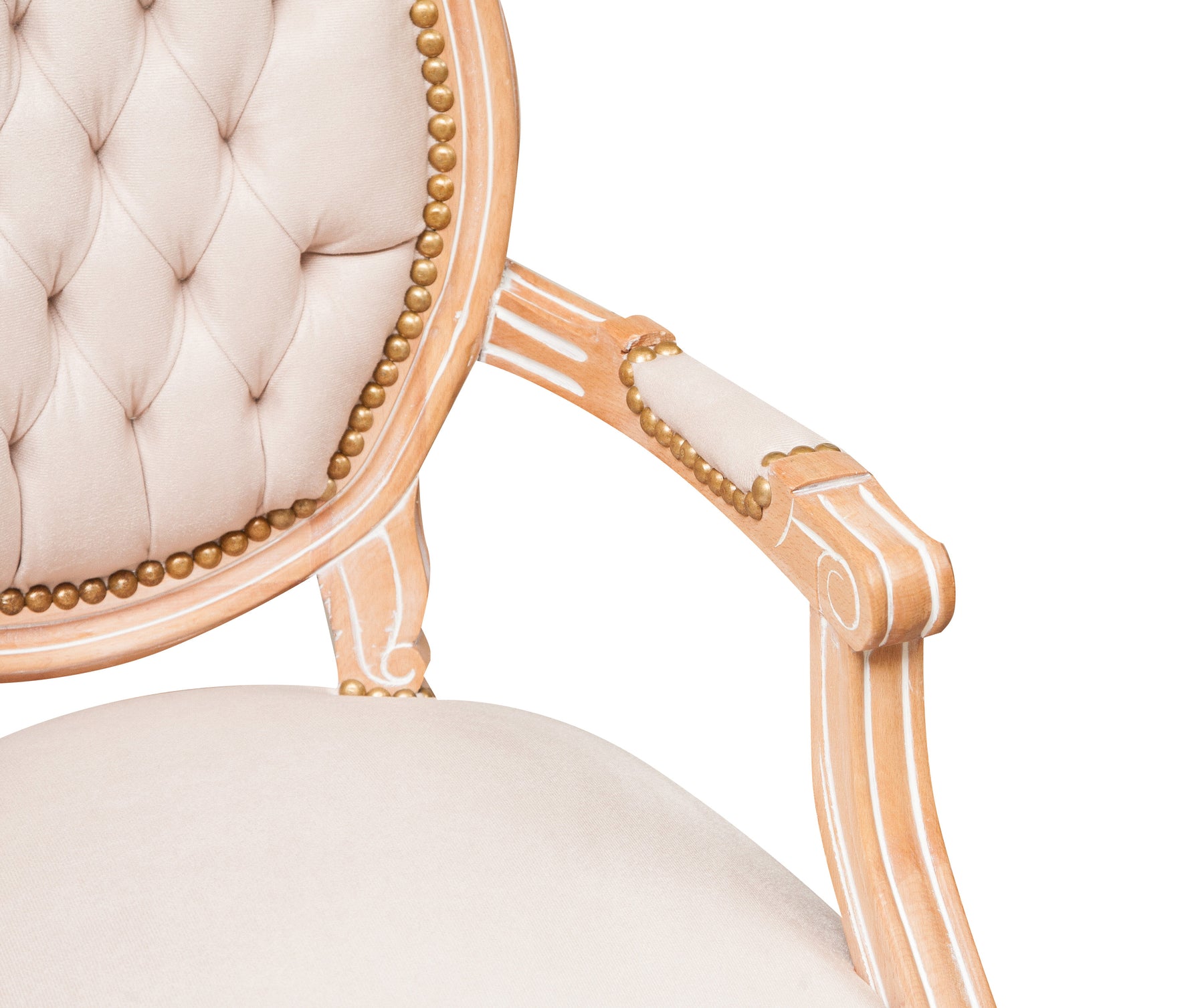 Poltrona stile francese Luigi XVI, in legno massello di faggio, intagliata a mano di dimensioni larghezza 58 cm, profondità 56 cm, altezza 101 cm. Finitura naturale trattata, leggermente patinata bianco Shabby. Seduta e schienale imbottiti artigianalmente.