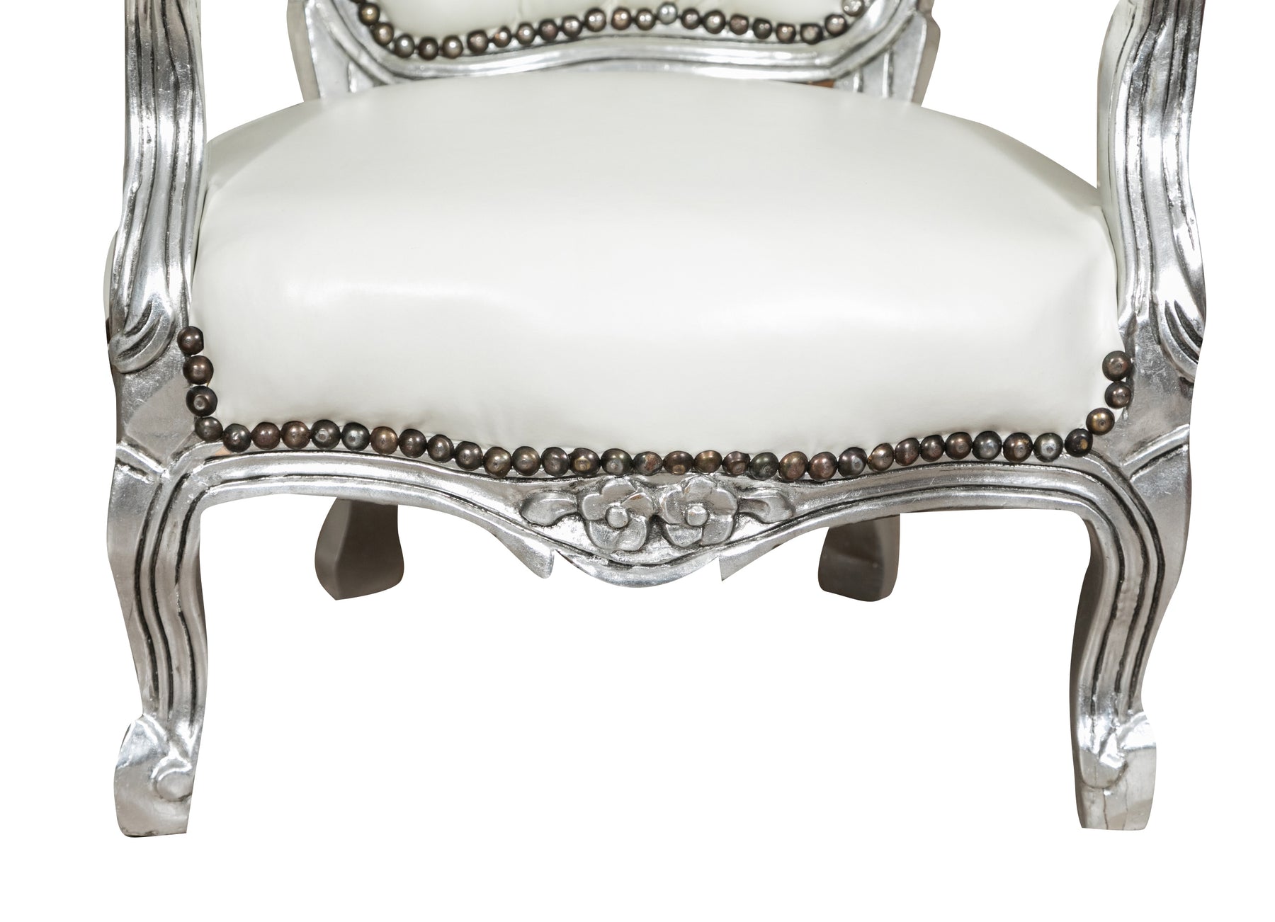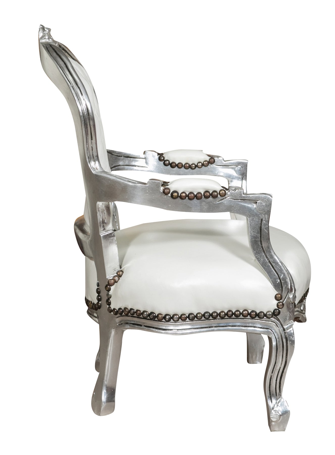 Poltrona stile francese Luigi XVI, in legno massello di faggio, intagliata a mano. Finitura argento anticato di dimensioni larghezza 51 cm, profondità 50 cm, altezza 73 cm. Seduta e schienale imbottiti artigianalmente in alcantara.