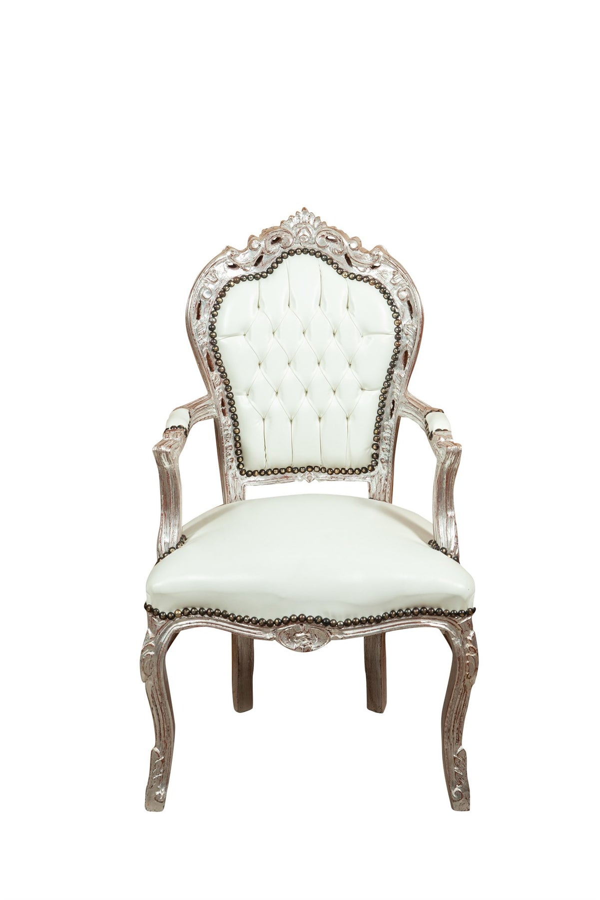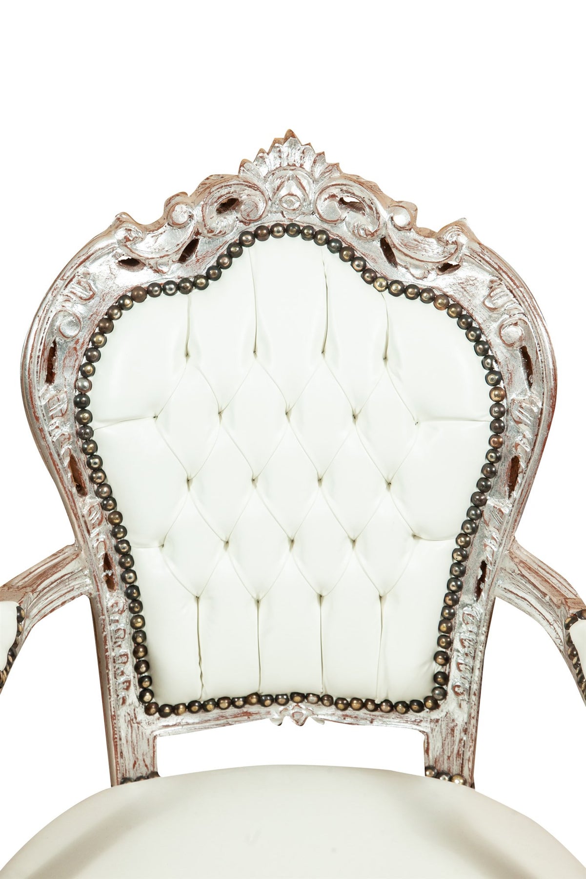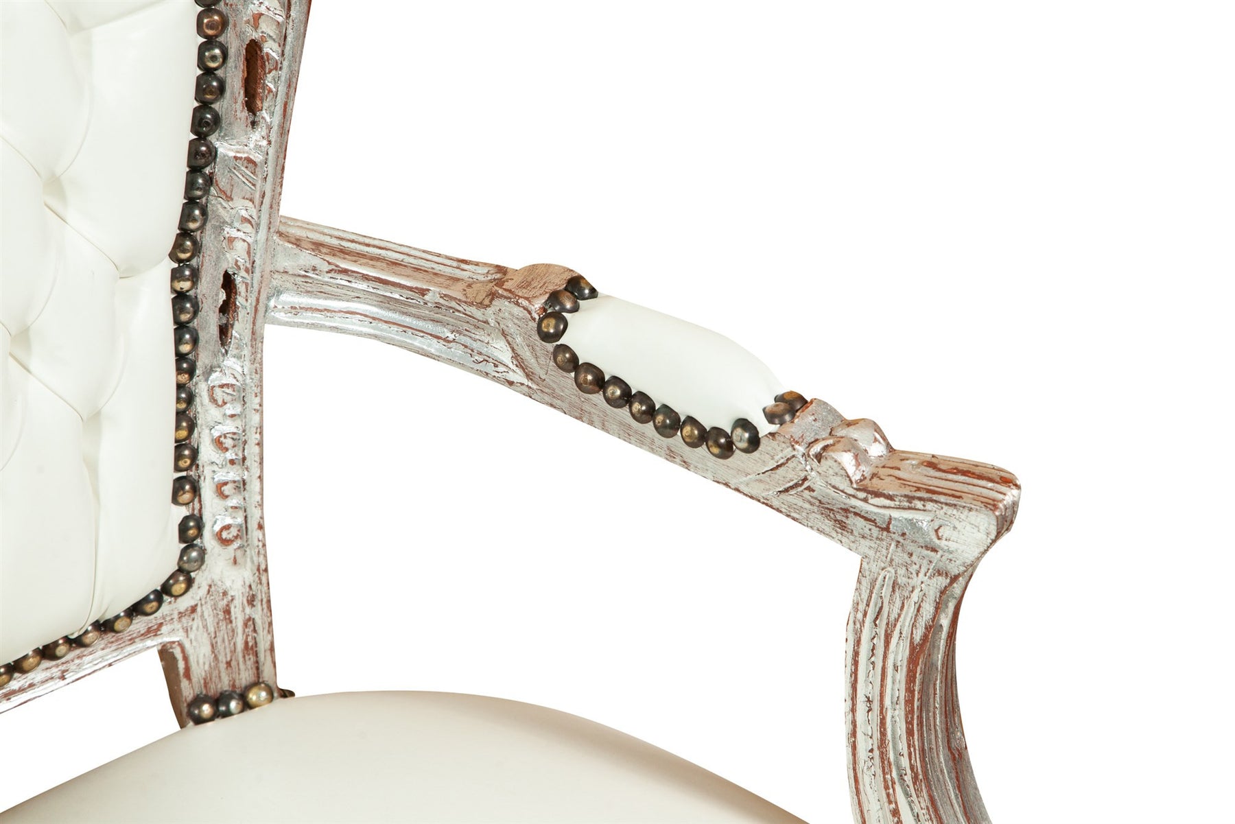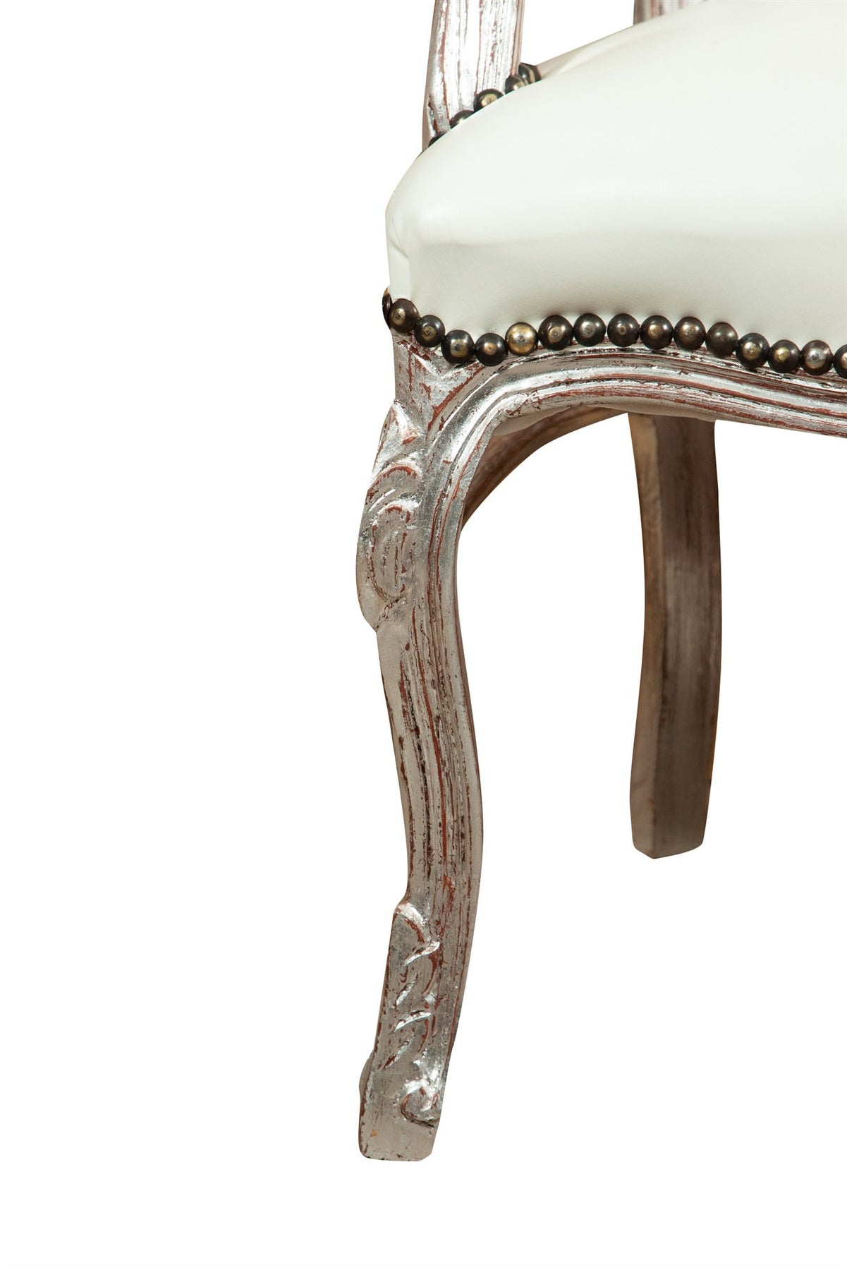 | Poltrona stile francese Luigi XVI, in legno massello di faggio, intagliata e finita a mano con patina in foglia argento di dimensioni lunghezza 60 cm, profondità 60 cm, altezza 107 cm. Seduta e schienale imbottiti artigianalmente. |