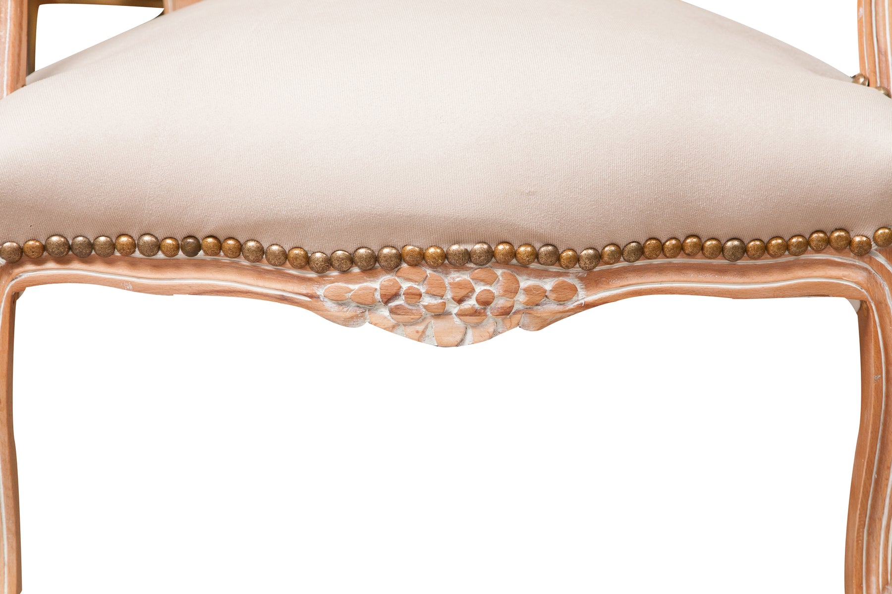 Poltrona stile francese Luigi XVI, in legno massello di faggio, intagliata a mano di dimensioni larghezza 63 cm, profondità 65 cm, altezza 100 cm. Finitura naturale trattata, leggermente patinata bianco Shabby. Seduta e schienale imbottiti artigianalmente.