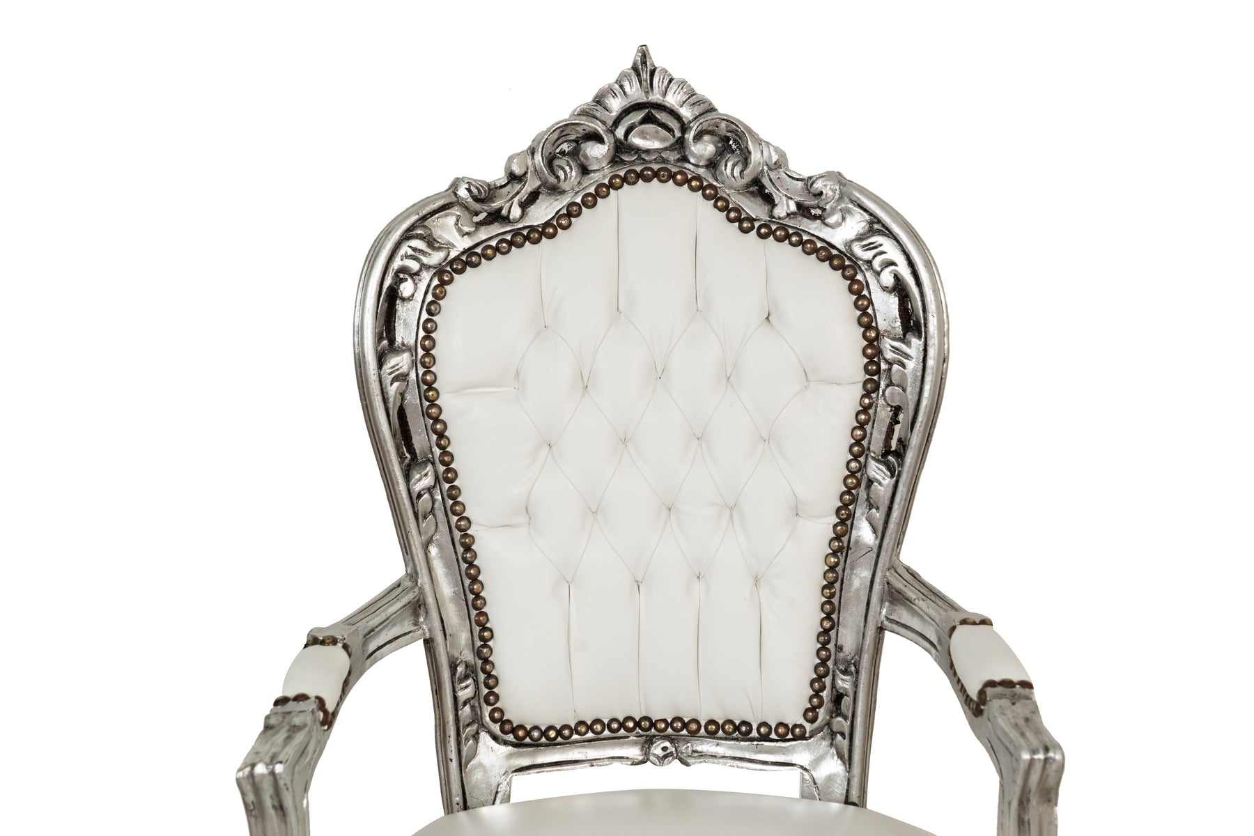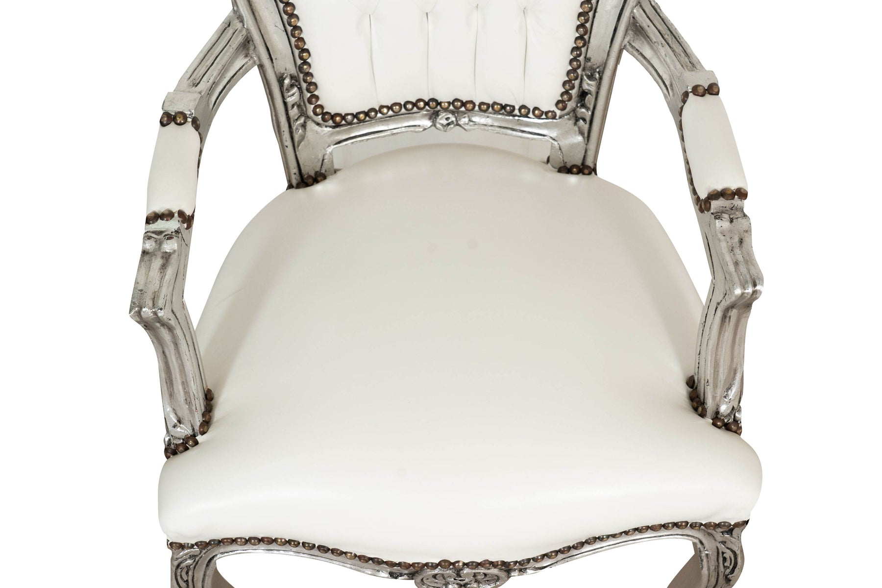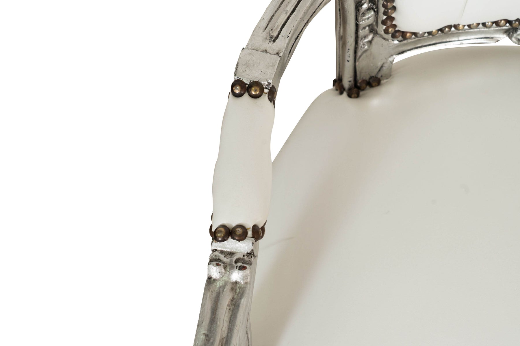 Poltrona stile francese Luigi XVI, in legno massello di faggio, intagliata e finita a mano con patina in foglia argento di dimensioni larghezza 60 cm, profondità 107 cm, altezza 60 cm. Seduta e schienale imbottiti artigianalmente arricchiti con strass inseriti nella lavorazione di capitonnè.