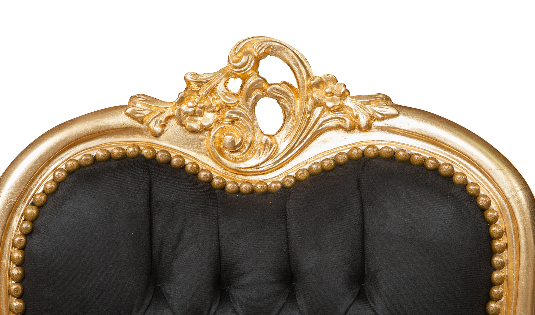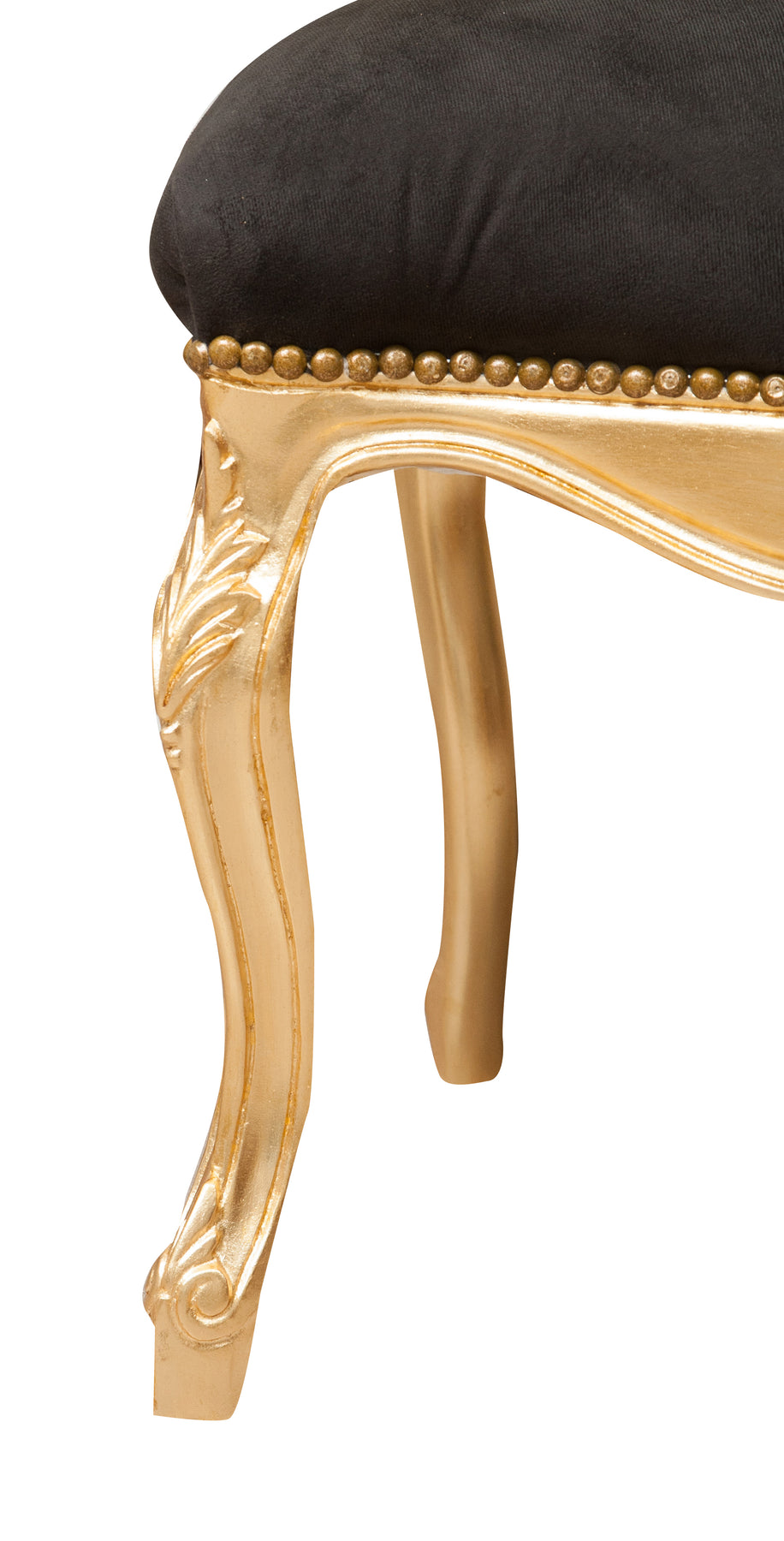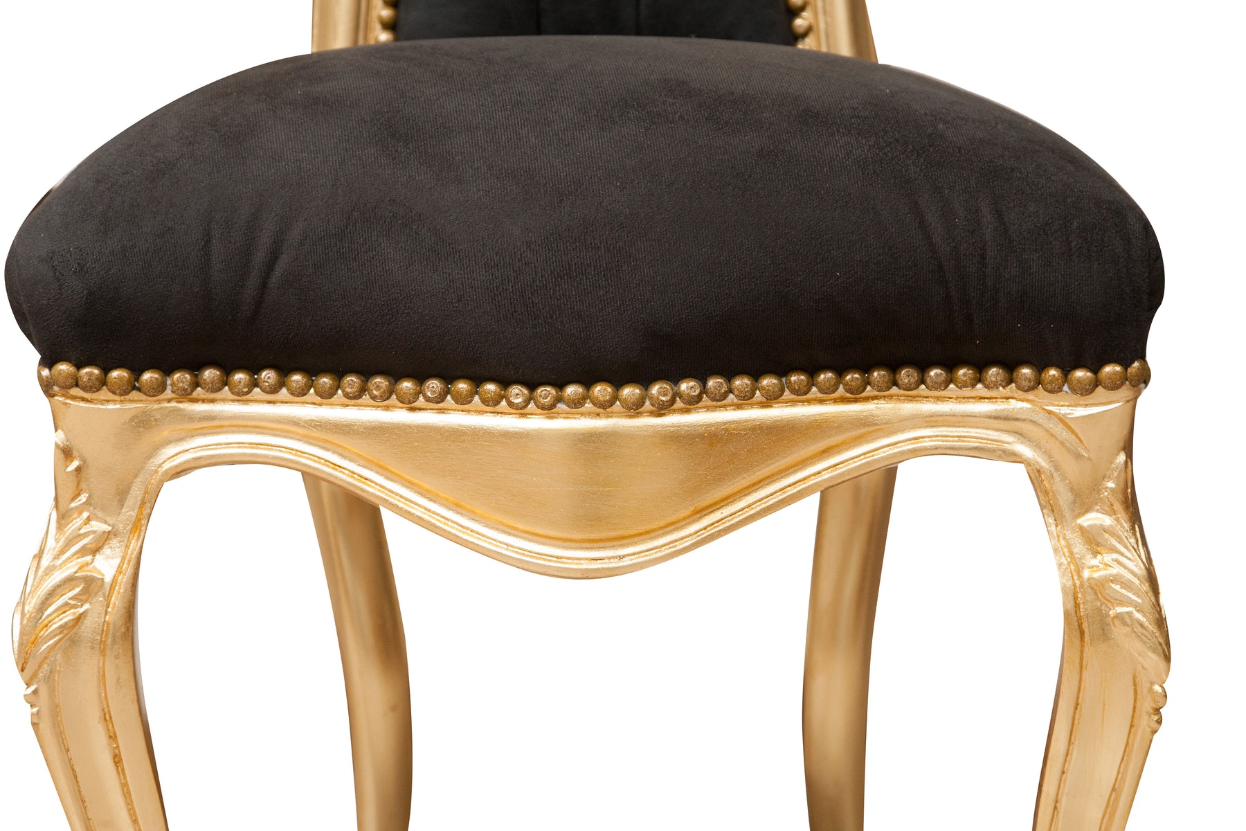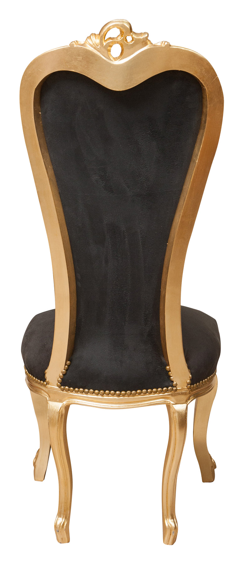 Poltrona stile francese Luigi XVI, in legno massello di faggio, intagliata e finita a mano con patina in foglia oro di dimensioni larghezza 56 cm, profondità 55 cm, altezza 137 cm. Seduta e schienale imbottiti artigianalmente.