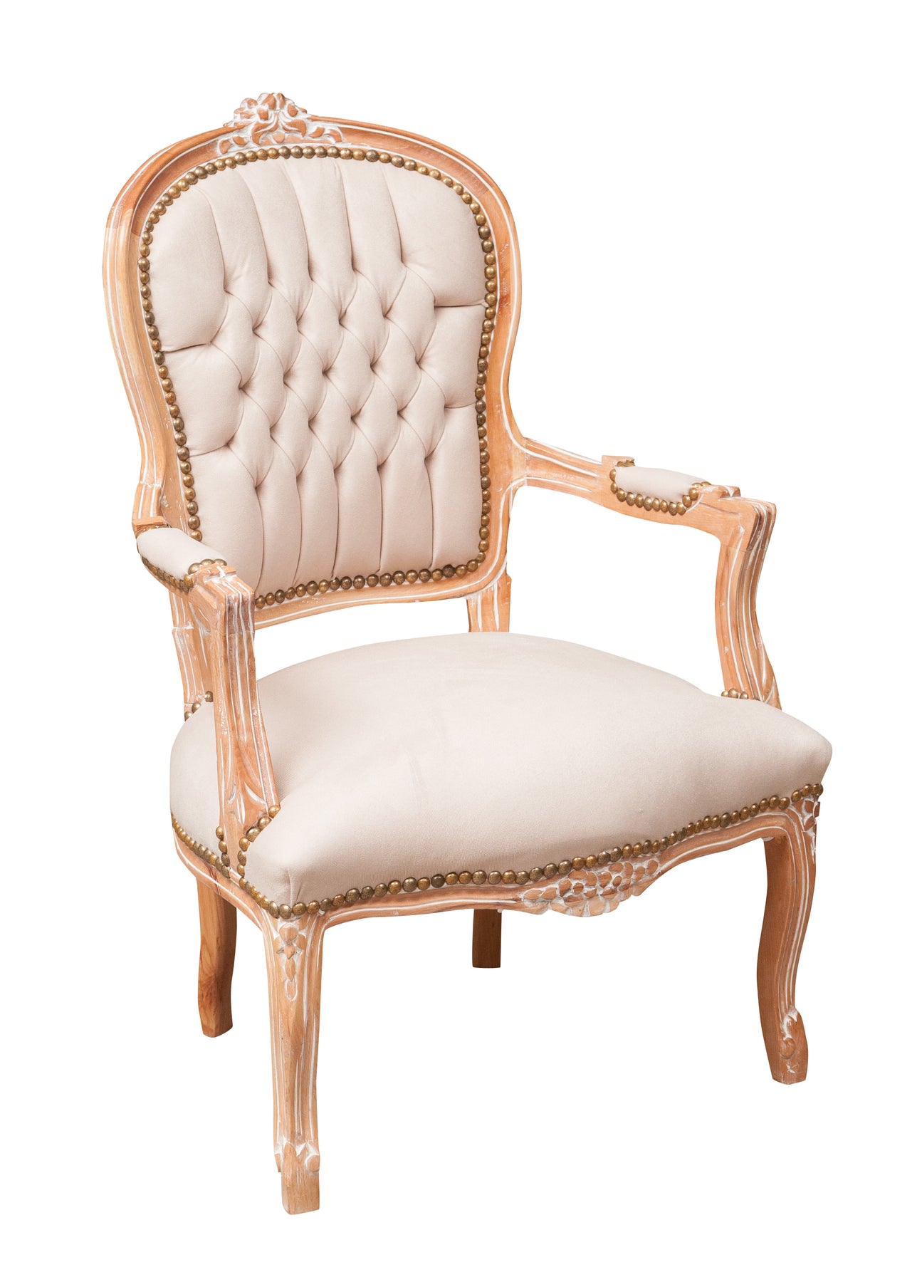 Poltrona stile francese Luigi XVI, in legno massello di faggio, intagliata a mano di dimensioni larghezza 63 cm, profondità 65 cm, altezza 100 cm. Finitura naturale trattata, leggermente patinata bianco Shabby. Seduta e schienale imbottiti artigianalmente.