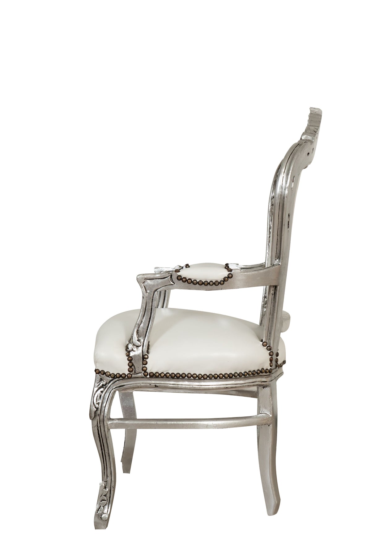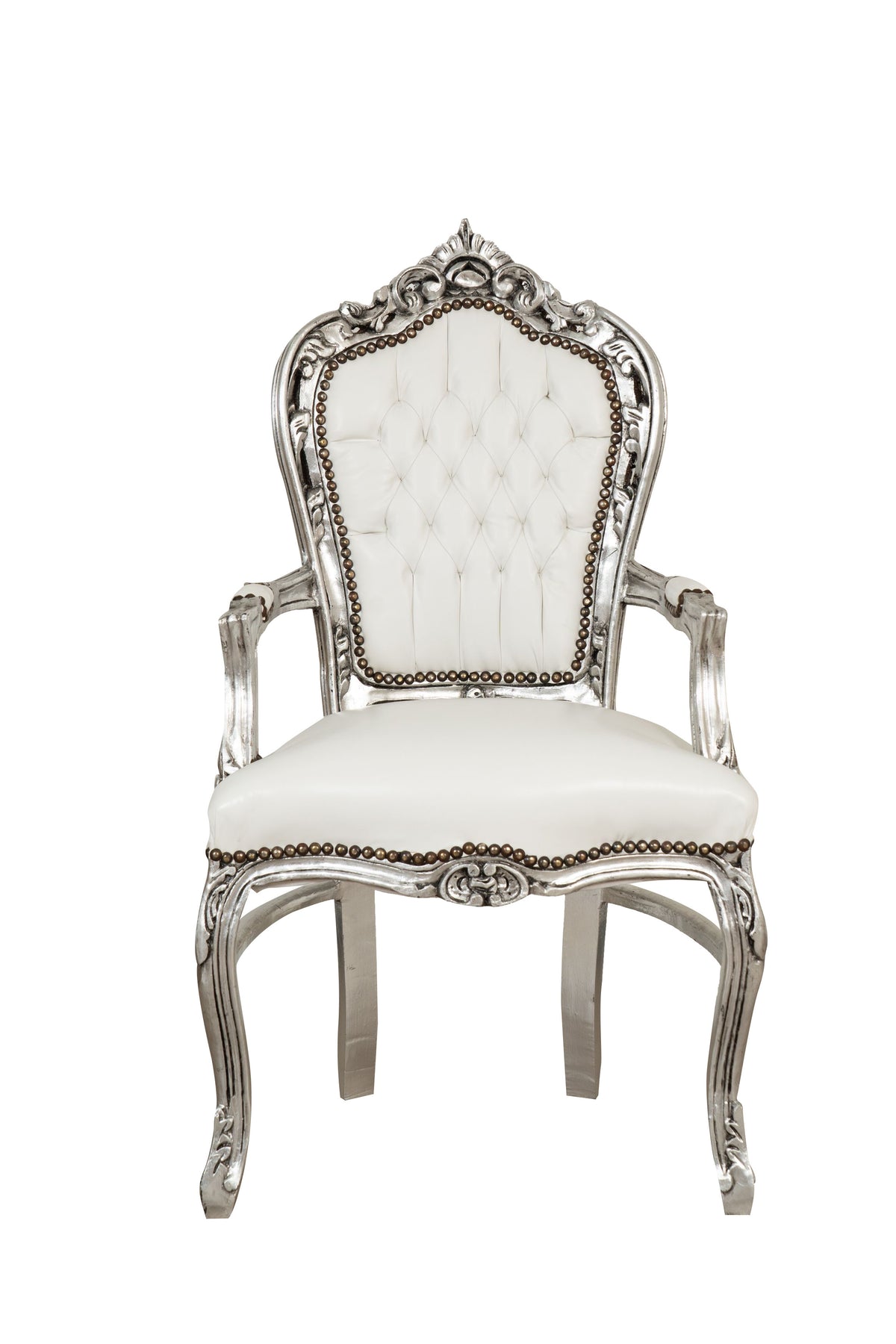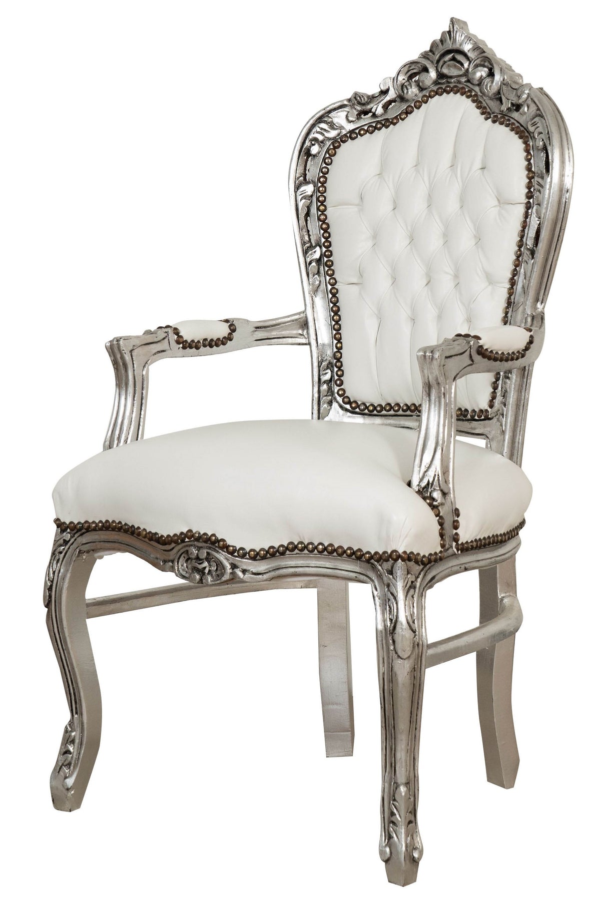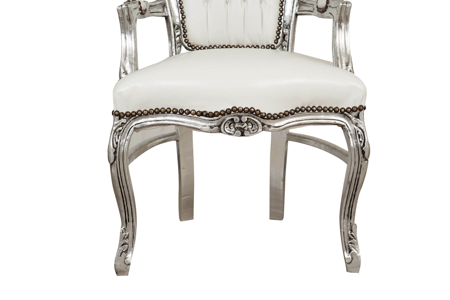 Poltrona stile francese Luigi XVI, in legno massello di faggio, intagliata e finita a mano con patina in foglia argento di dimensioni larghezza 60 cm, profondità 107 cm, altezza 60 cm. Seduta e schienale imbottiti artigianalmente arricchiti con strass inseriti nella lavorazione di capitonnè.