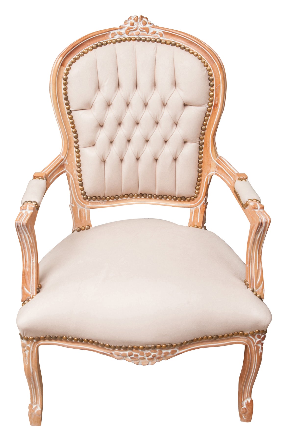 Poltrona stile francese Luigi XVI, in legno massello di faggio, intagliata a mano di dimensioni larghezza 63 cm, profondità 65 cm, altezza 100 cm. Finitura naturale trattata, leggermente patinata bianco Shabby. Seduta e schienale imbottiti artigianalmente.