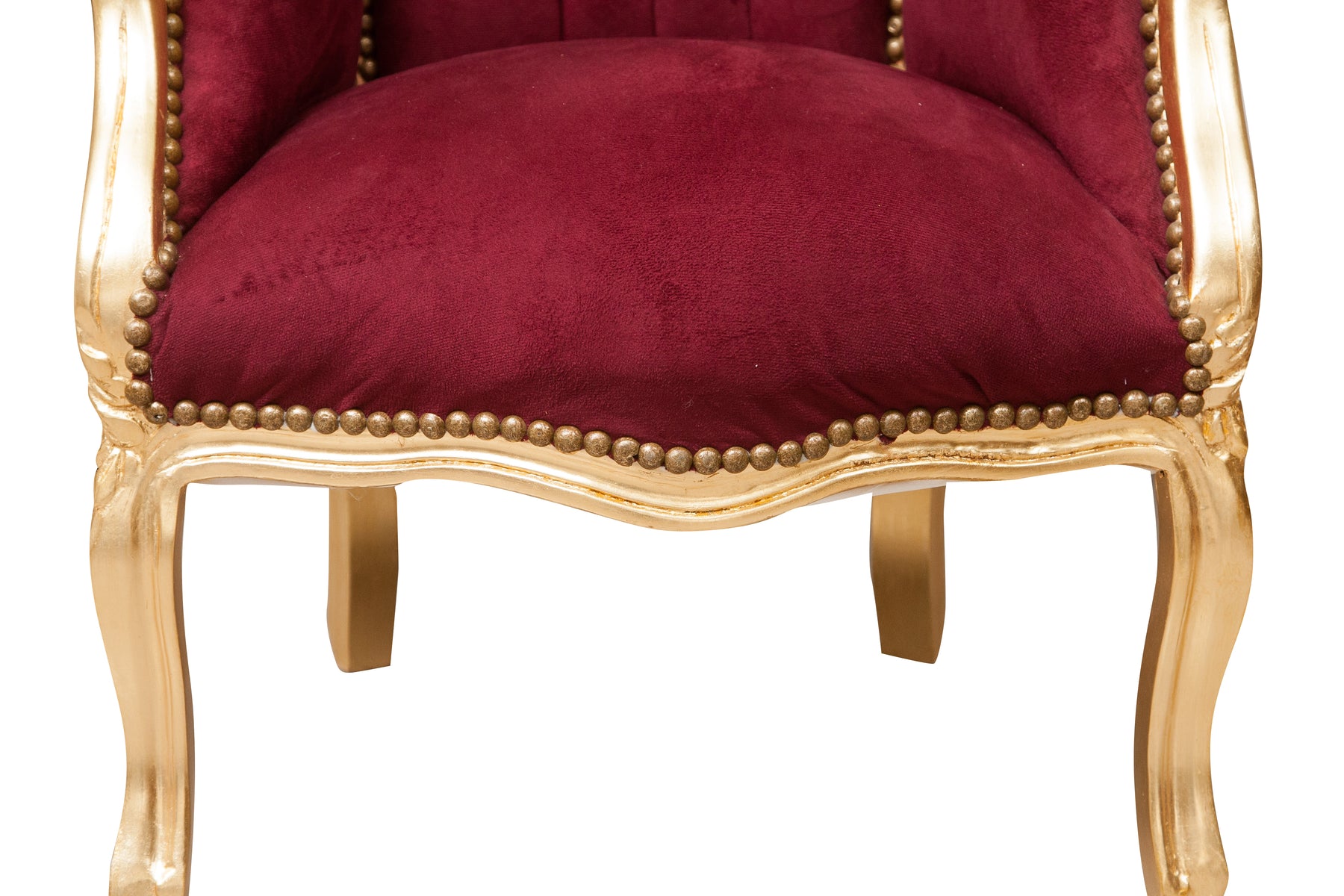 Poltrona stile francese Luigi XVI, in legno massello di faggio, intagliata e finita a mano con patina in foglia oro di dimensioni larghezza 63 cm, profondità 57 cm, altezza 80 cm. Seduta e schienale imbottiti artigianalmente.