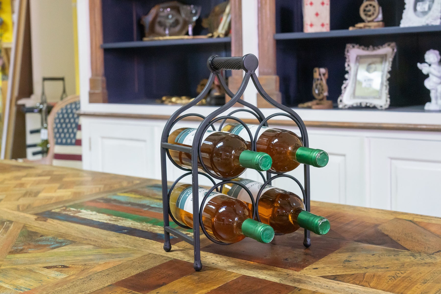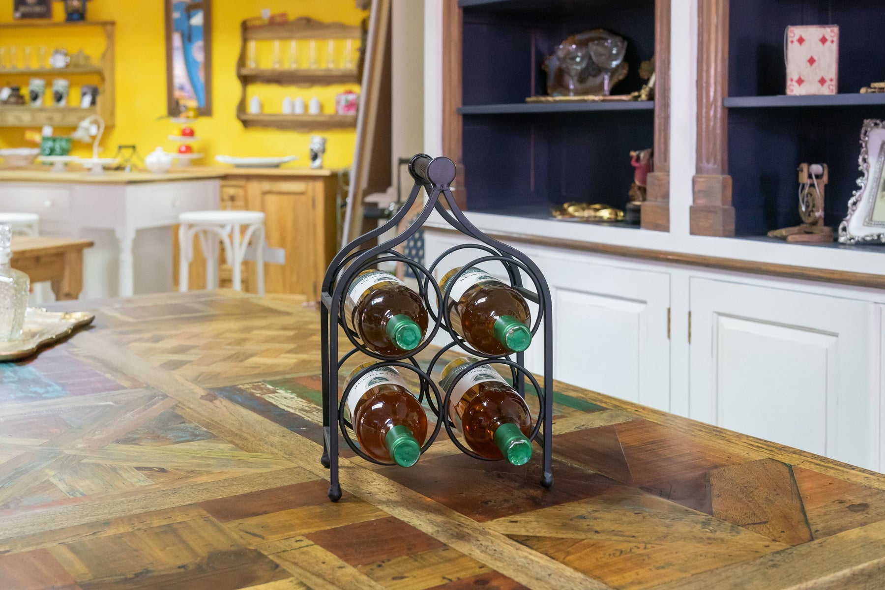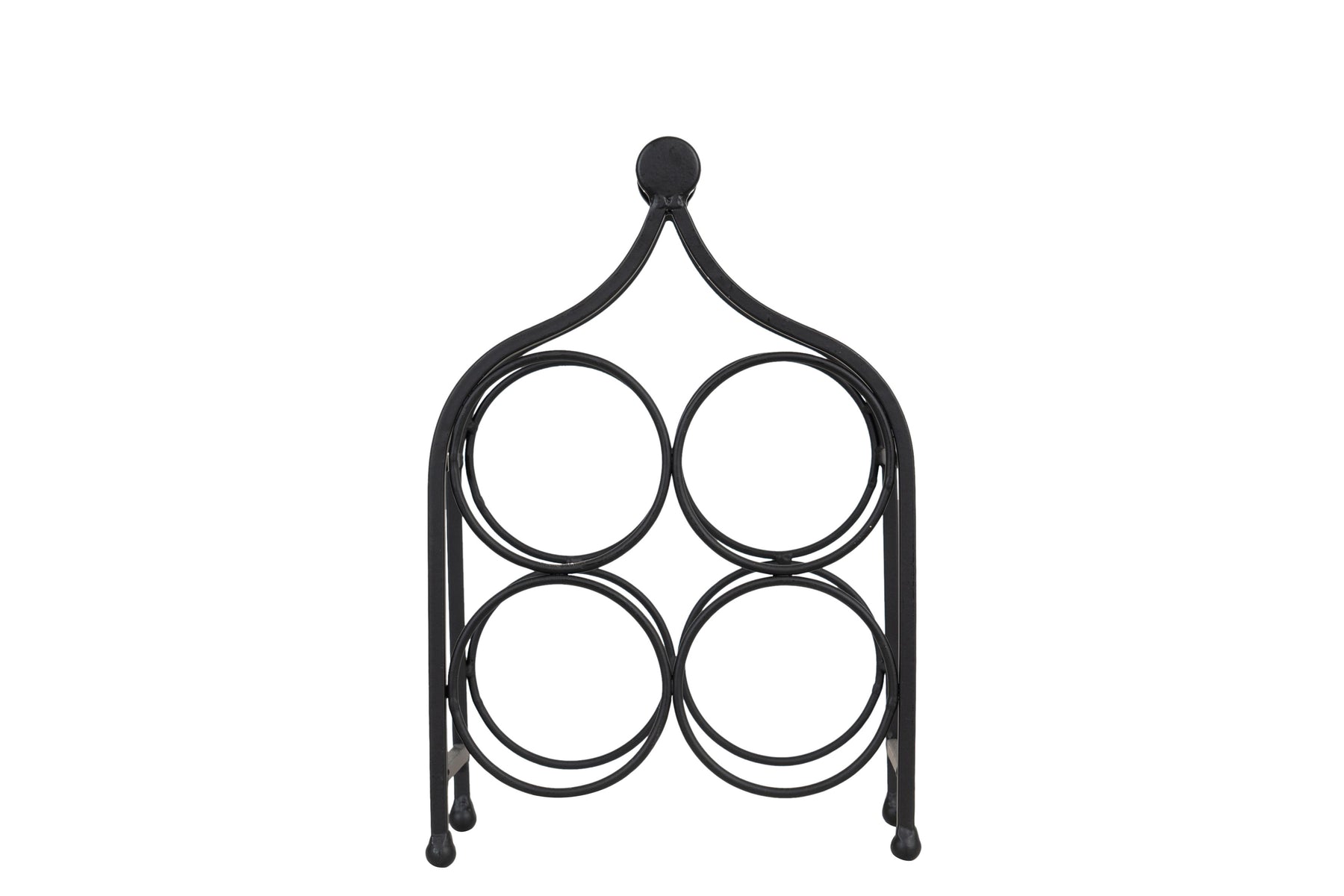Cantinetta portabottiglie di dimensioni larghezza 24 cm, profondità 14 cm, altezza 35 cm realizzata in ferro battuto pieno. Con una capienza di 4 bottiglie, la cantinetta rappresenta un funzionale e pratico complemento d'arredo per ogni ambiente.