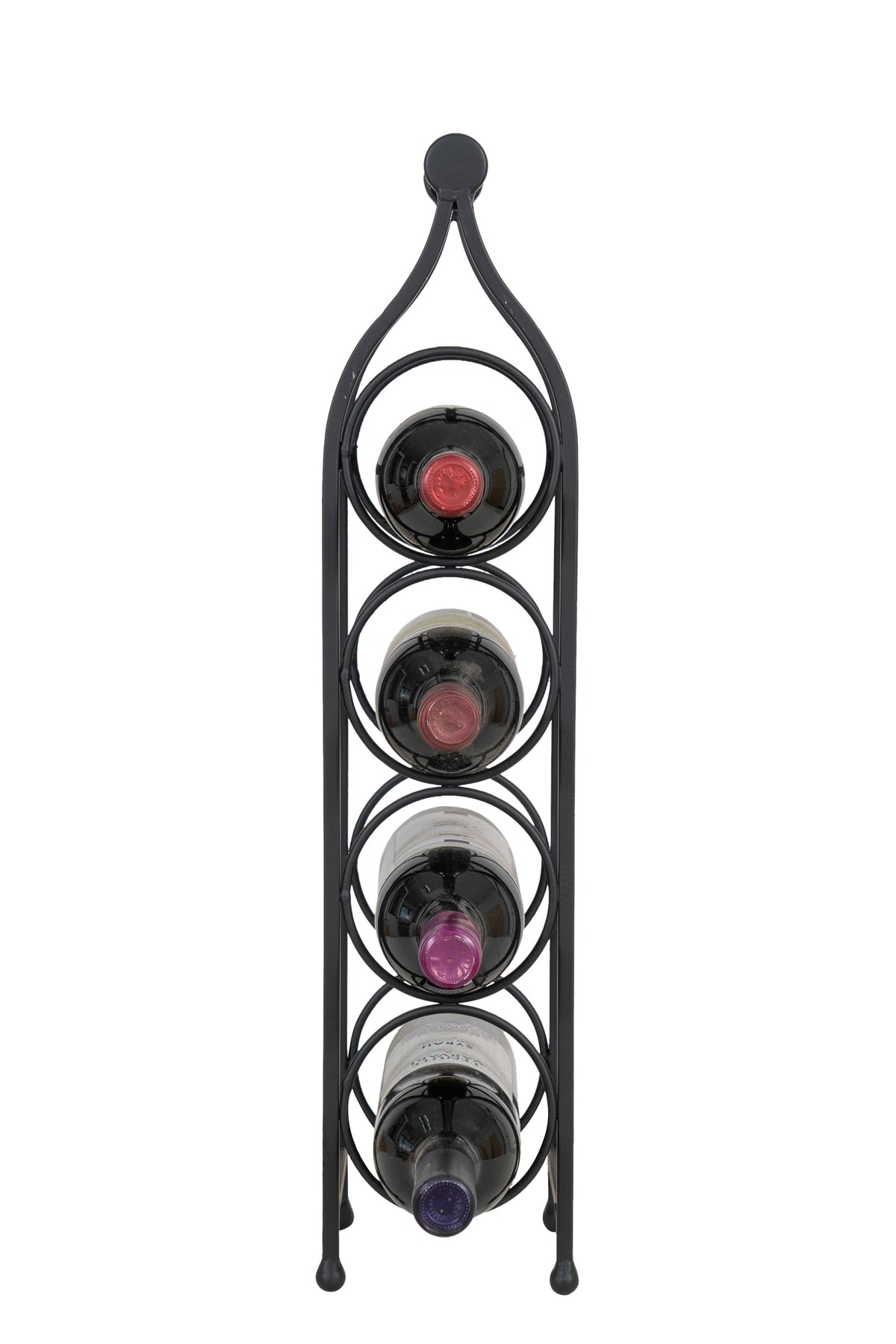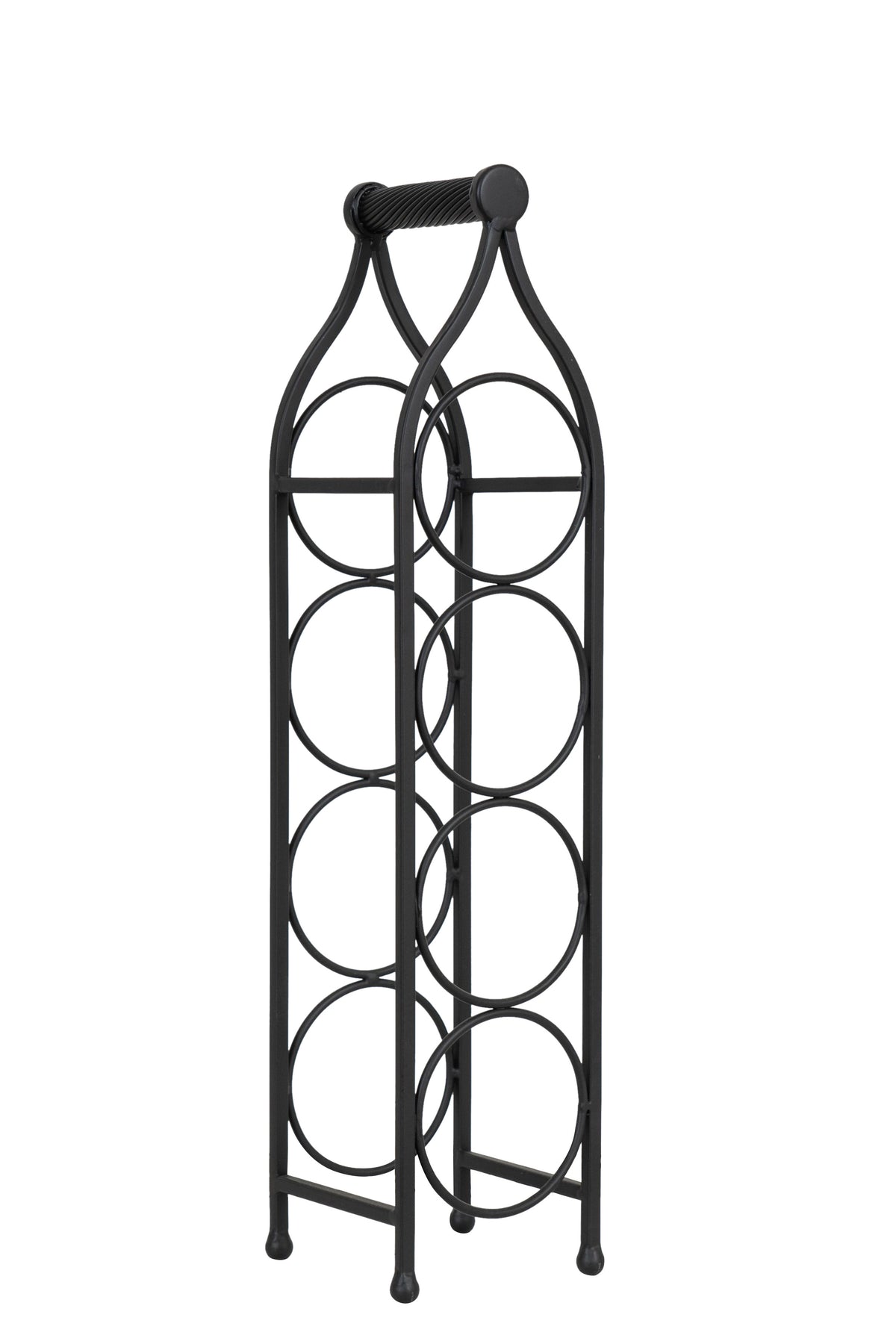 Cantinetta portabottiglie di dimensioni larghezza 13 cm, profondità 14 cm, altezza 58 cm realizzata in ferro battuto pieno. Con una capienza di 4 bottiglie, la cantinetta rappresenta un funzionale e pratico complemento d'arredo per ogni ambiente.