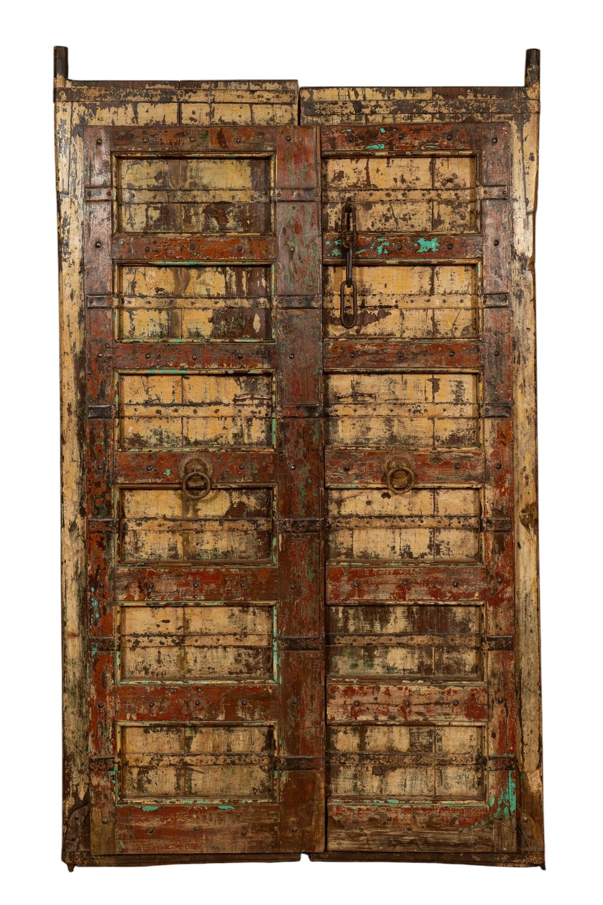 Portone/porta antica in legno massello di teak di dimensioni lunghezza 128 cm, profondità  10 cm, altezza 204 cm. Questo portone deriva da demolizioni e recuperi di antichi ed importanti fabbricati. Finemente restaurato e trattato anche per uso esterna, ogni porta è un pezzo di vero ed unico antiquariato. Tutte le misure si riferiscono all'ingombro massimo dell'articolo.