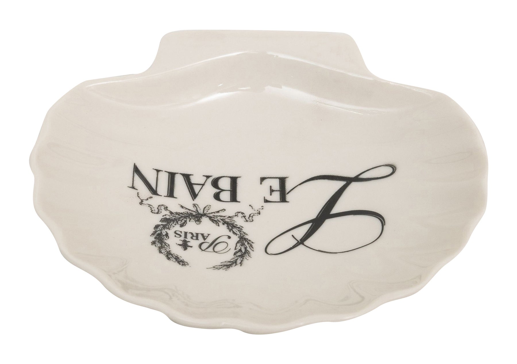 Porta saponetta svuotatasche a forma di conchiglia L12xPR12xH2,5 cm realizzata in porcellana bianca con decoro.