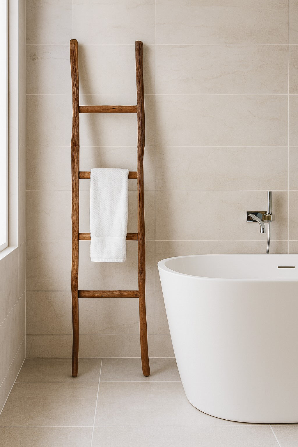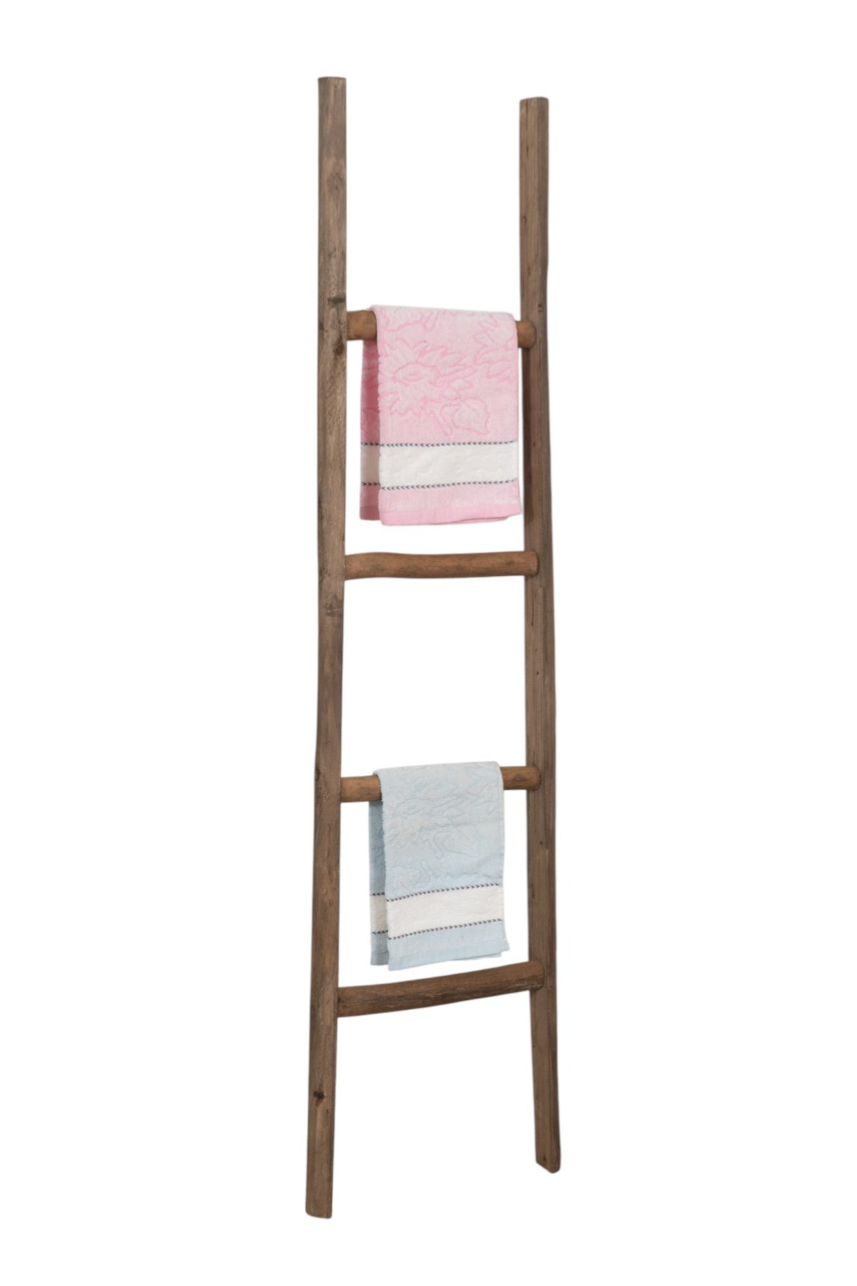 Scala portasciugamani da bagno in legno di dimensioni 40x8x150 cm. Riproduce fedelmente sia per estetica sia per costruzione le vecchie scale, con i laterali ricavati da un unico tronco di albero tagliato a metà. Un complemento di arredo molto versatile, oltre che a un funzionale attrezzo per la vita quotidiana. Essendo realizzate artigianalmente, ciascuna scala può essere leggermente differente l’una dall’altra per quanto riguarda la finitura.