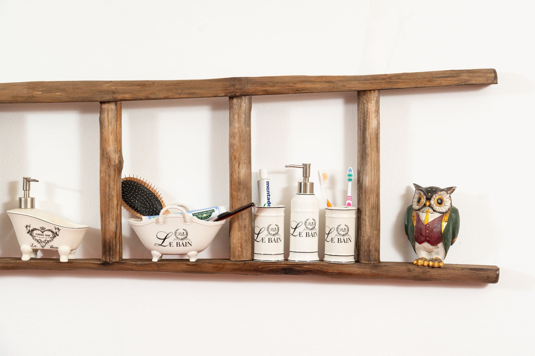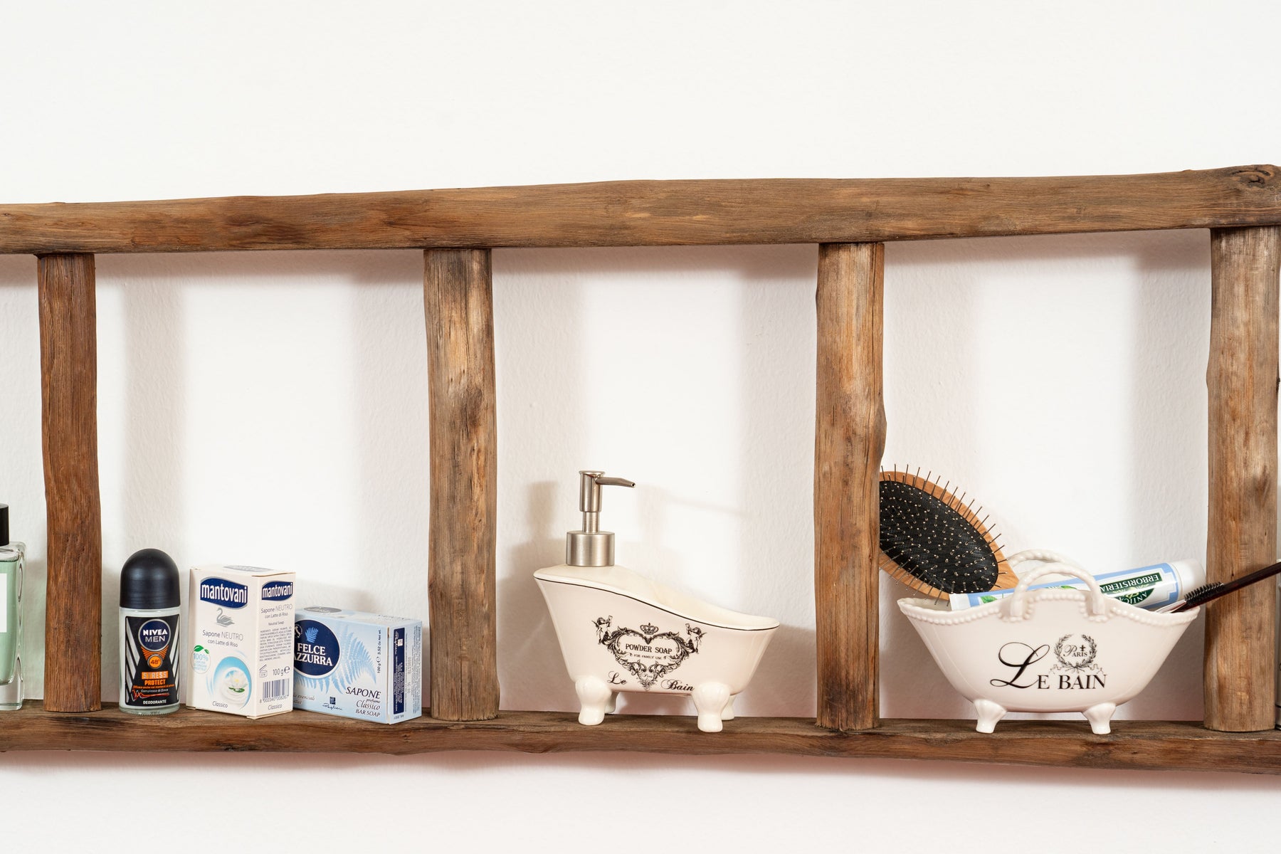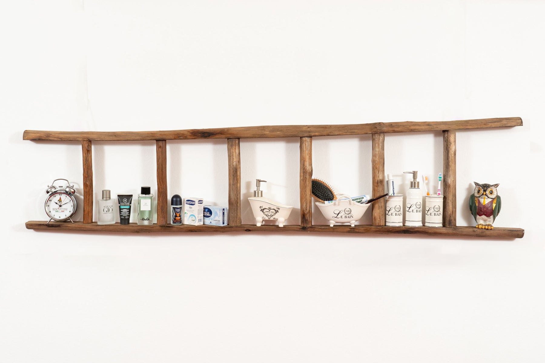 Scala portasciugamani da bagno in legno di dimensioni 44x8x180 cm. Riproduce fedelmente sia per estetica sia per costruzione le vecchie scale, con i laterali ricavati da un unico tronco di albero tagliato a metà. Un complemento di arredo molto versatile, oltre che a un funzionale attrezzo per la vita quotidiana. Essendo realizzate artigianalmente, ciascuna scala può essere leggermente differente l’una dall’altra per quanto riguarda la finitura.