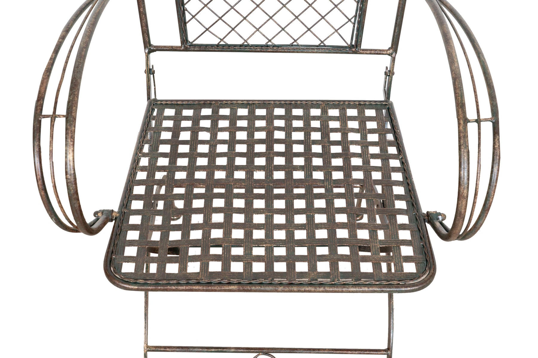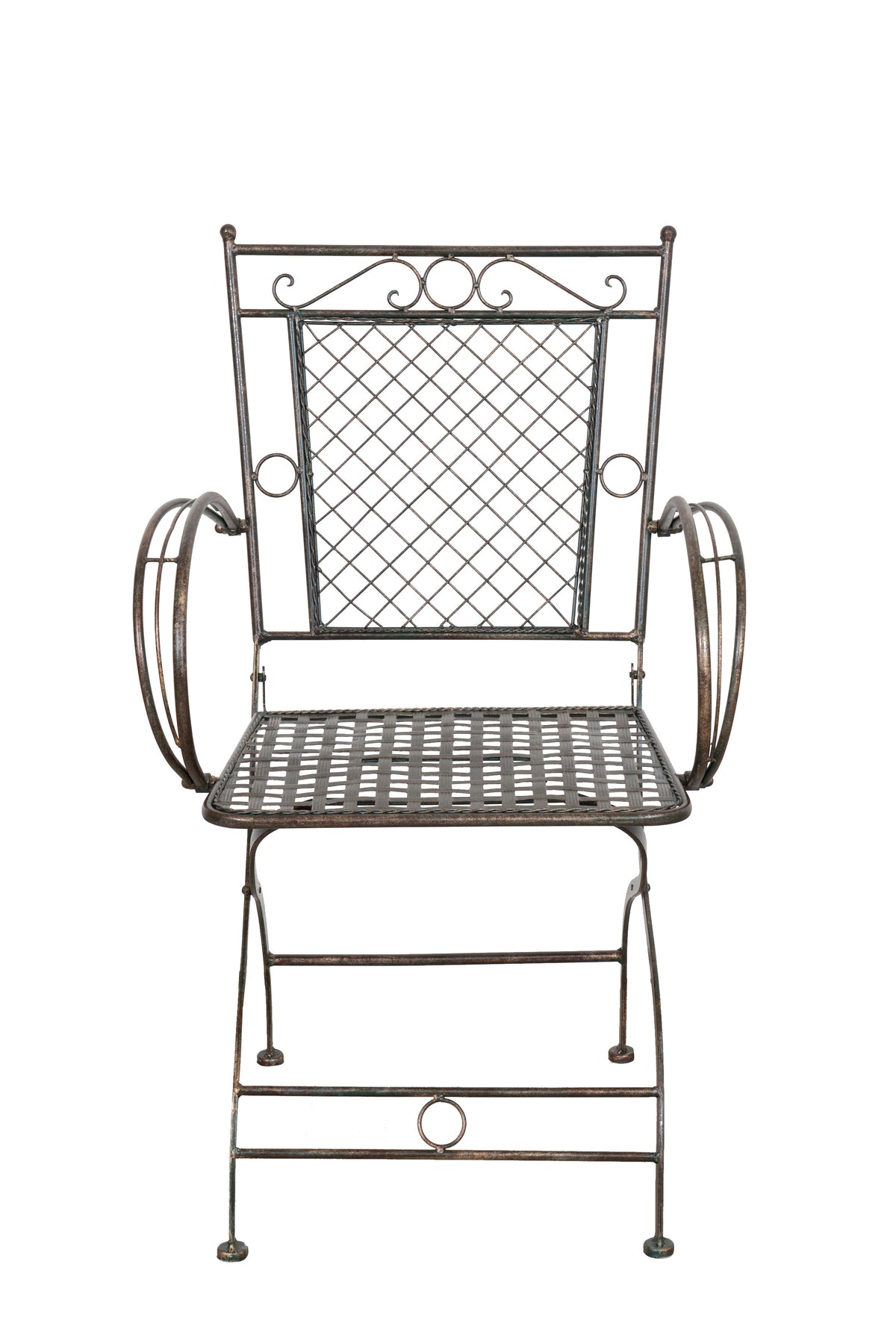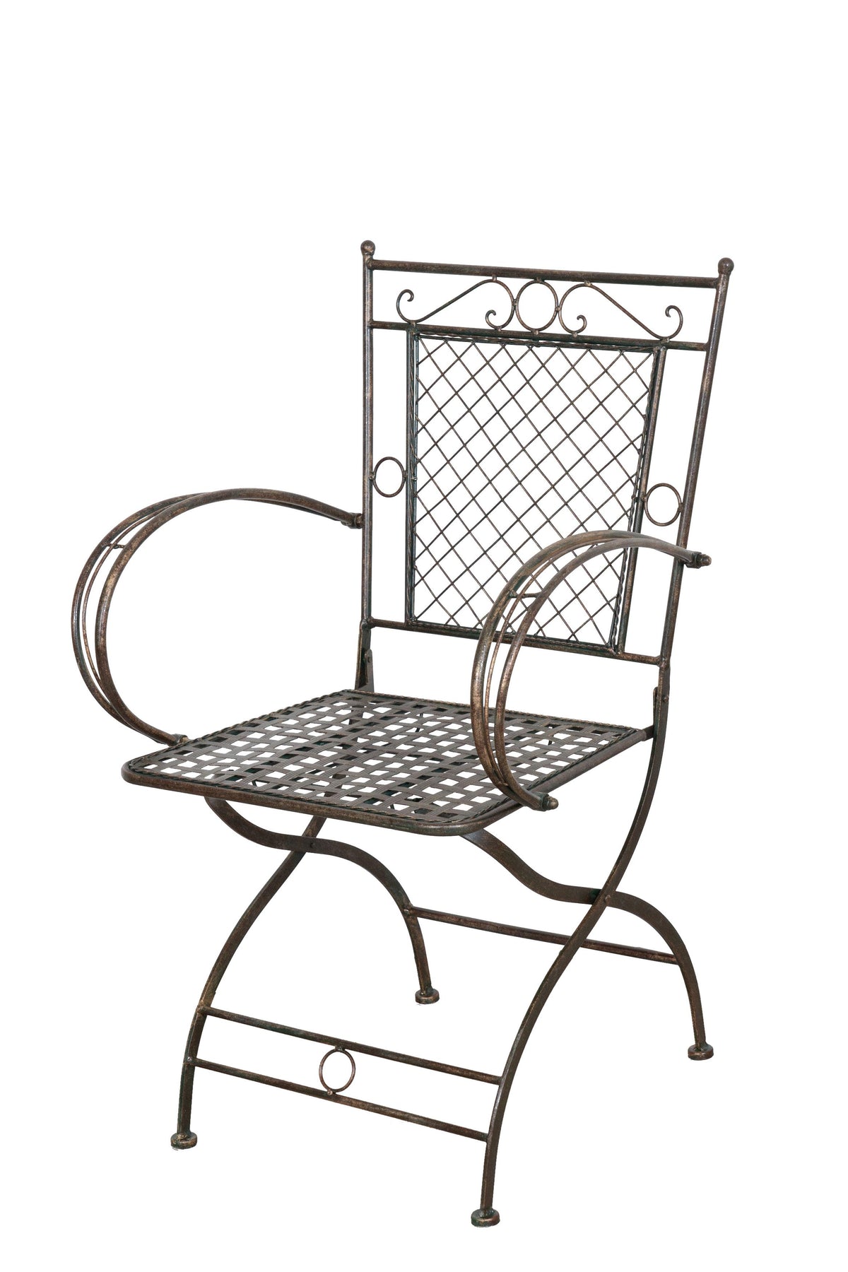Sedia/poltrona con braccioli con seduta quadrata larghezza 60 cm, profondità 51 cm, altezza 95 cm realizzata in ferro battuto. Caratterizzata da una minuziosa lavorazione ad intreccio è ideale sia per ambienti esterni che per gli interni.