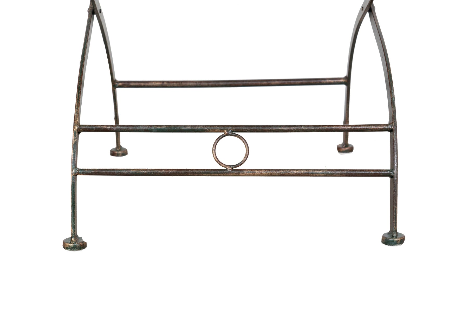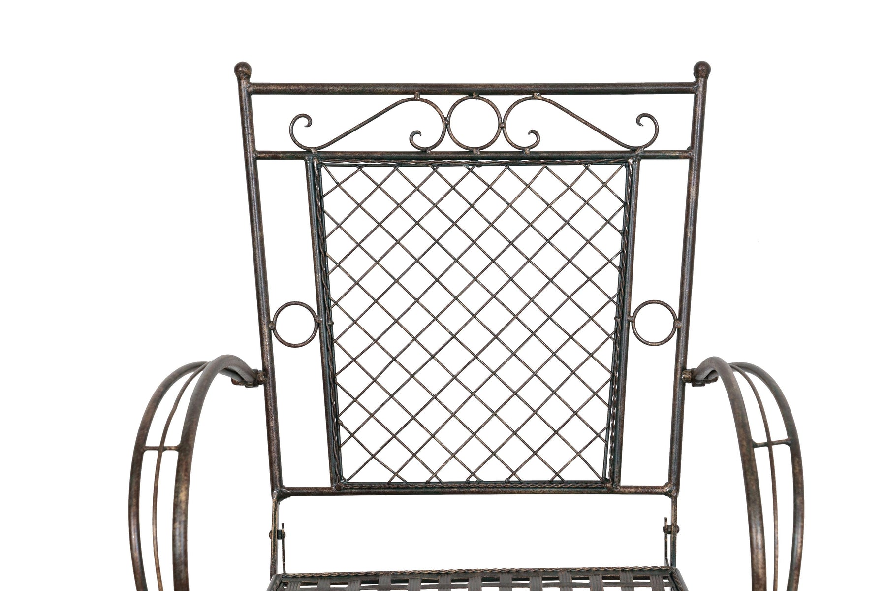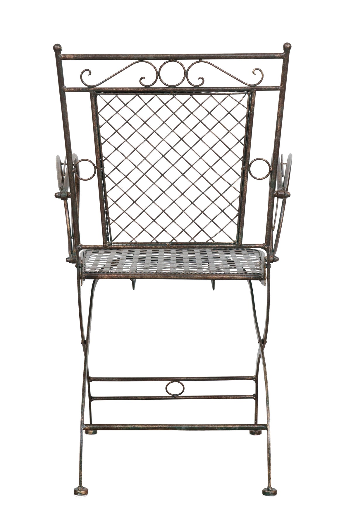 Sedia/poltrona con braccioli con seduta quadrata larghezza 60 cm, profondità 51 cm, altezza 95 cm realizzata in ferro battuto. Caratterizzata da una minuziosa lavorazione ad intreccio è ideale sia per ambienti esterni che per gli interni.