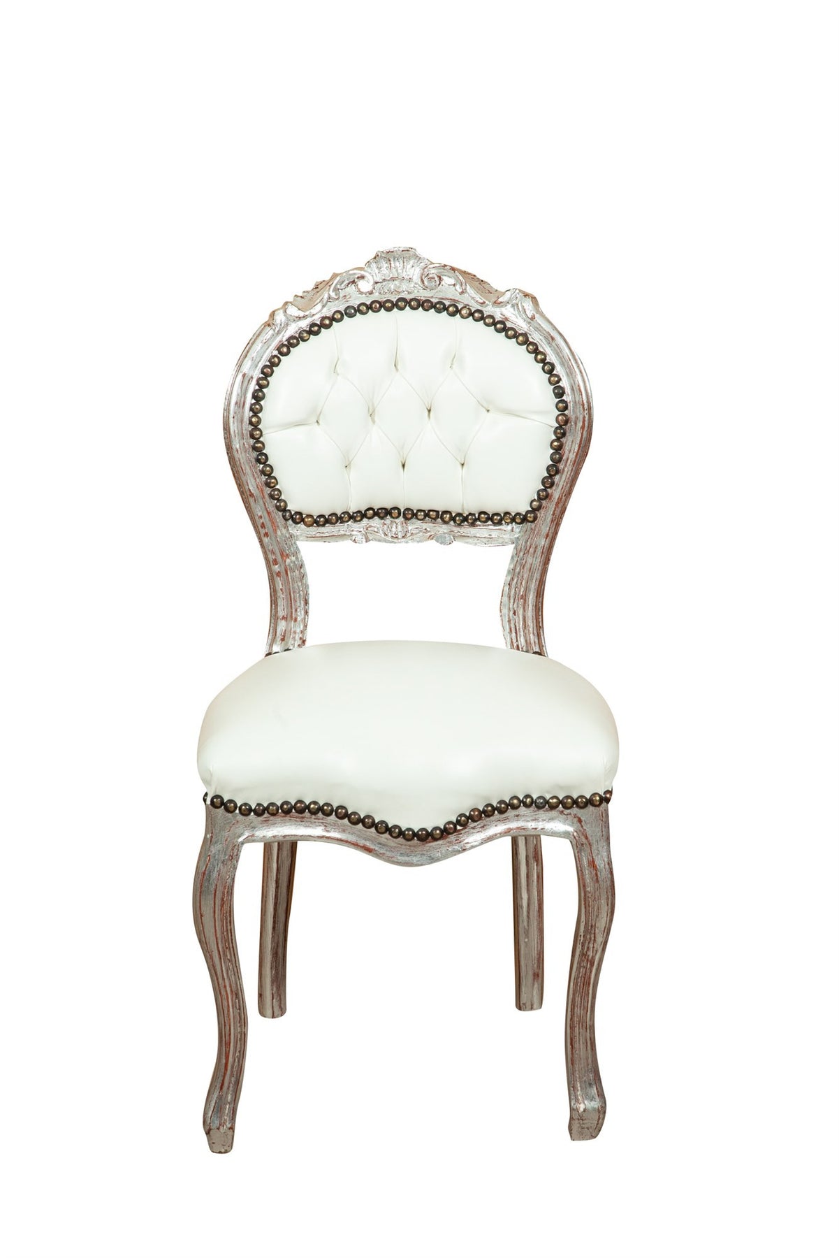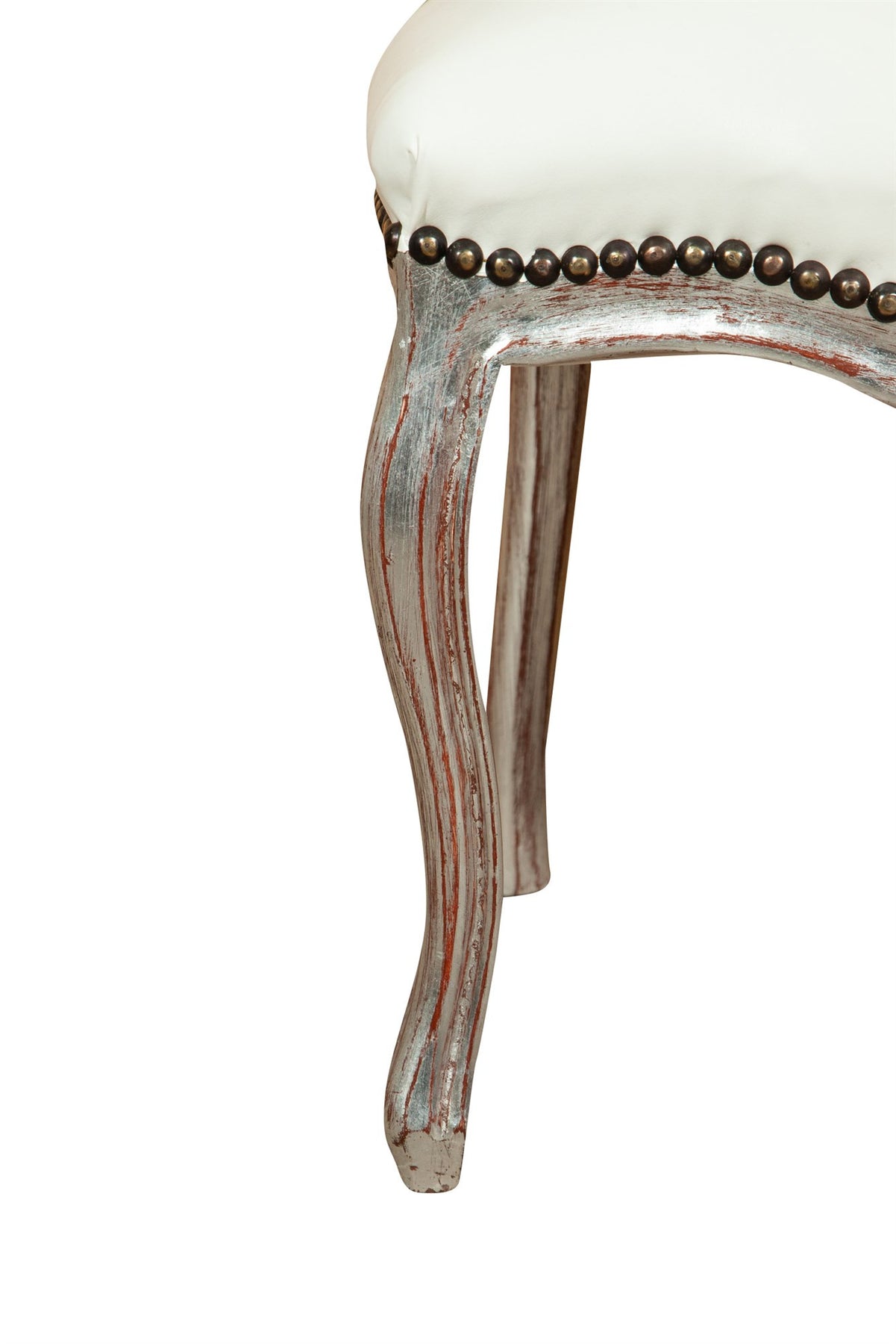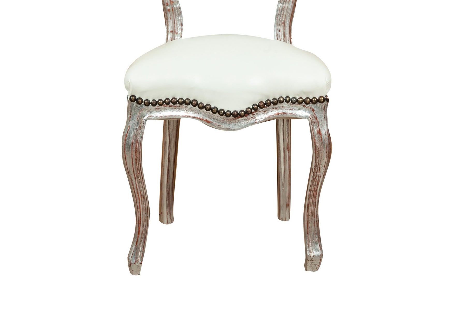 Sedia poltroncina stile francese Luigi XVI, in legno massello di faggio, intagliate a mano di dimensioni larghezza 45 cm, profondità 42 cm, altezza 90 cm. Finitura argento anticata. Seduta e schienale imbottiti artigianalmente in pelle.