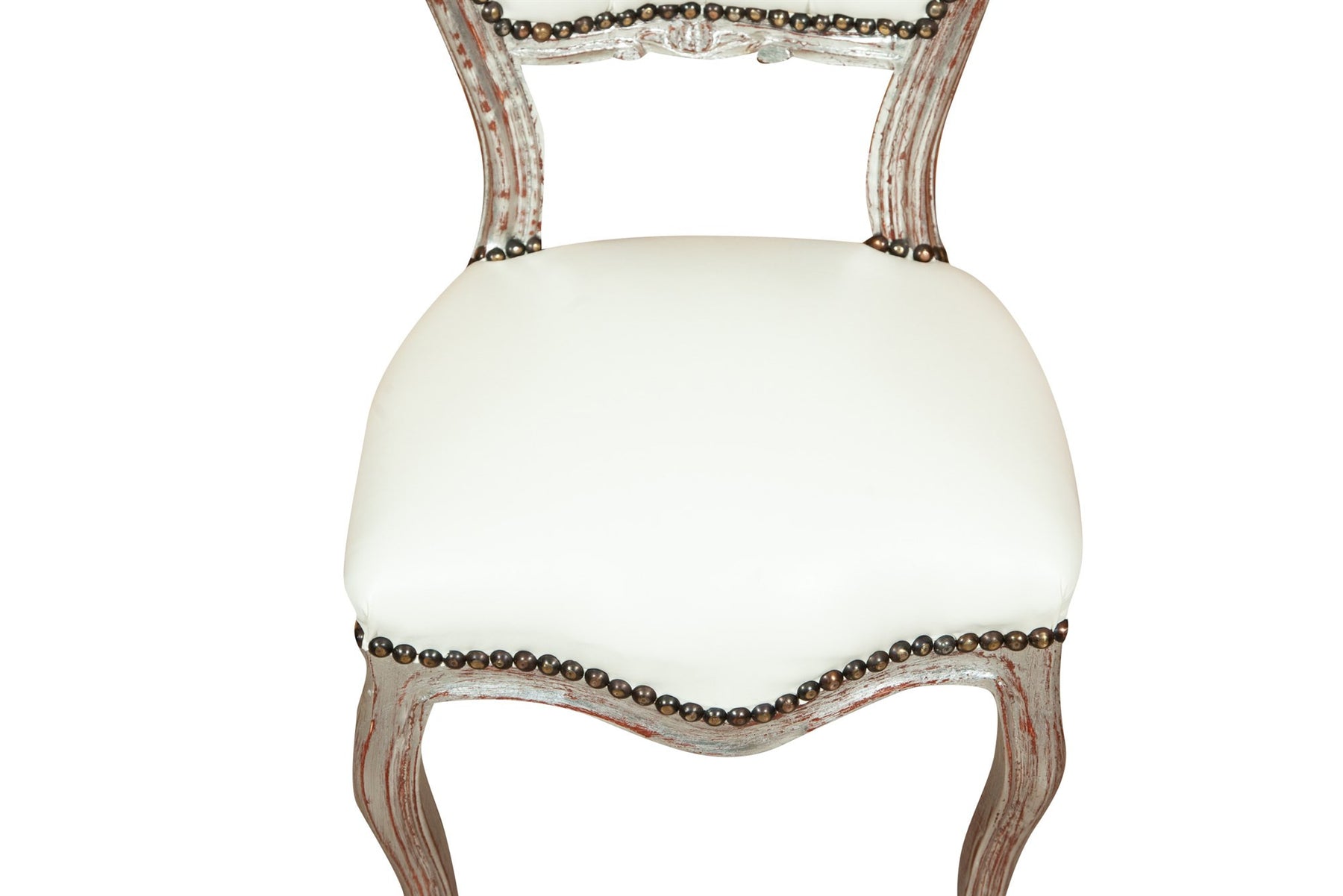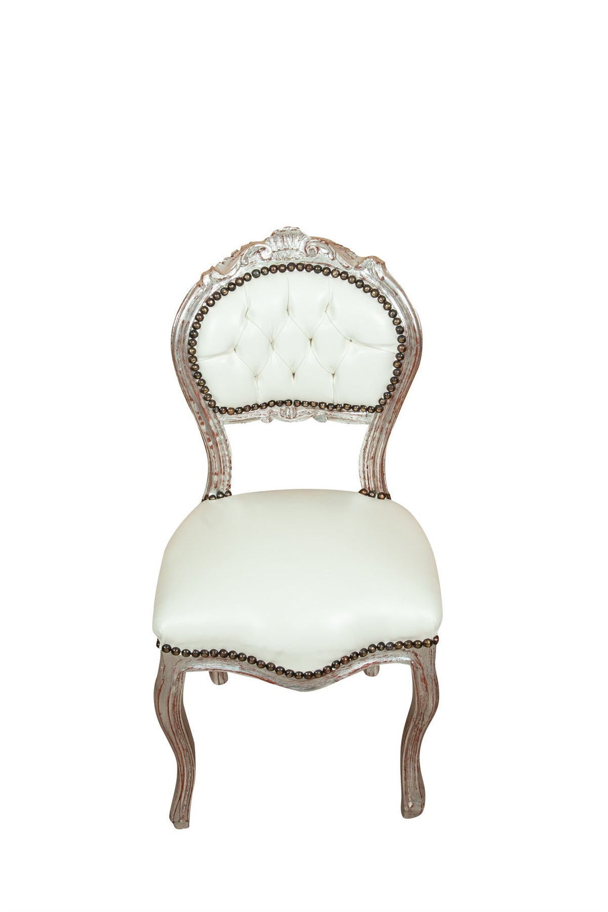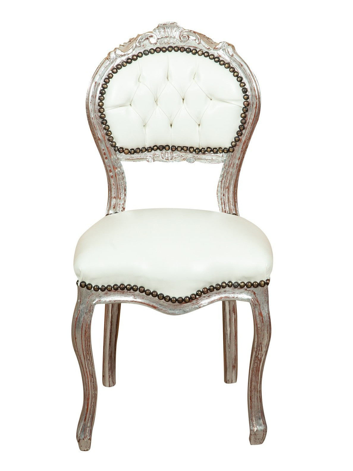 Sedia poltroncina stile francese Luigi XVI, in legno massello di faggio, intagliate a mano di dimensioni larghezza 45 cm, profondità 42 cm, altezza 90 cm. Finitura argento anticata. Seduta e schienale imbottiti artigianalmente in pelle.