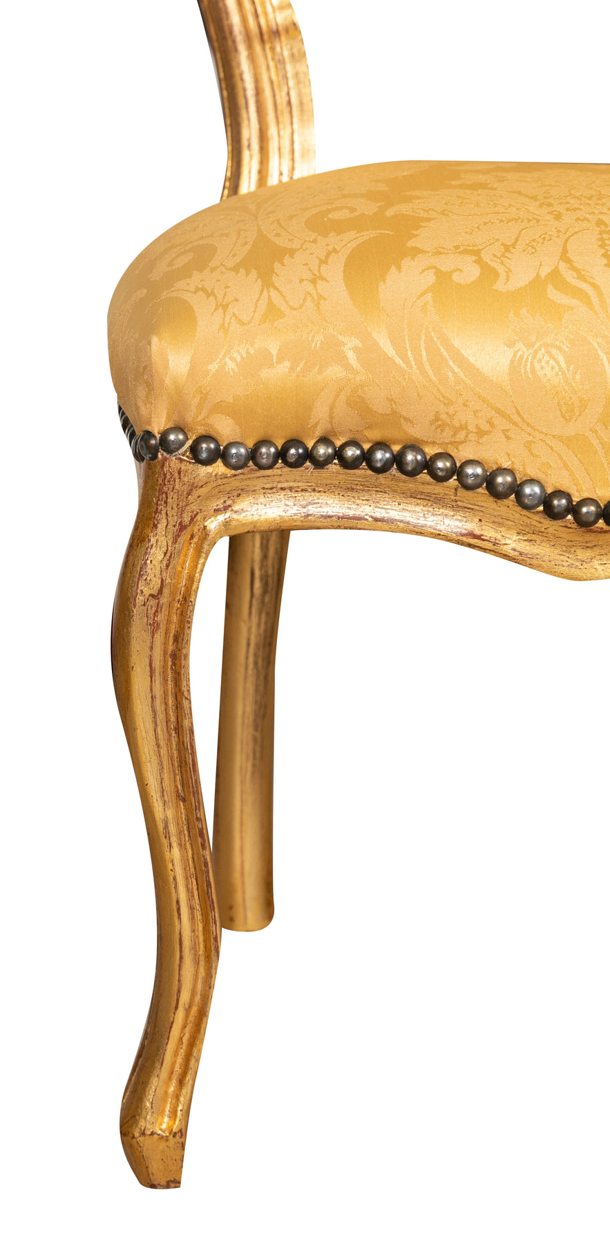 Sedia poltroncina stile francese Luigi XVI, in legno massello di faggio, intagliata e finita a mano con patina in foglia oro e seduta oro anticato di dimensioni larghezza 45 cm, profondità 42 cm, altezza 90 cm. Seduta imbottita artigianalmente.