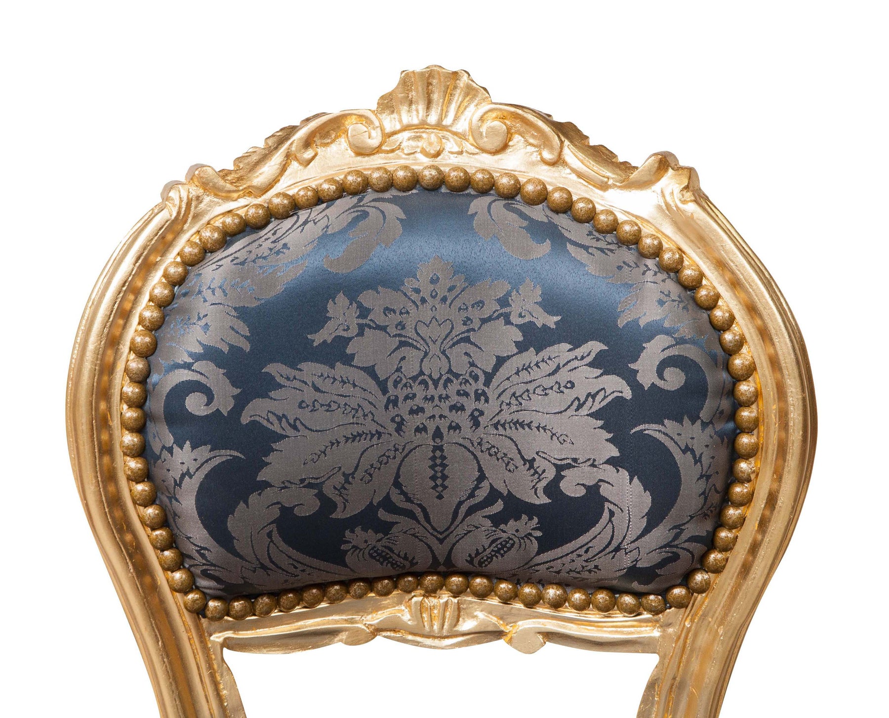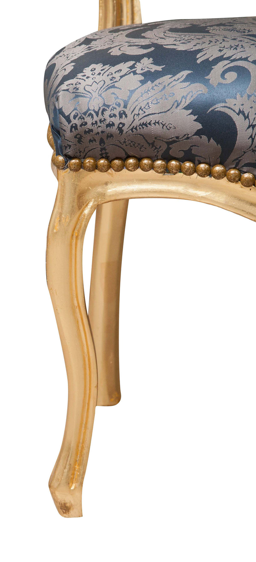Sedia poltroncina stile francese Luigi XVI, in legno massello di faggio, intagliata e finita a mano con patina in oro anticato di dimensioni larghezza 45 cm, profondità 42 cm, altezza 90 cm. Seduta imbottita artigianalmente.