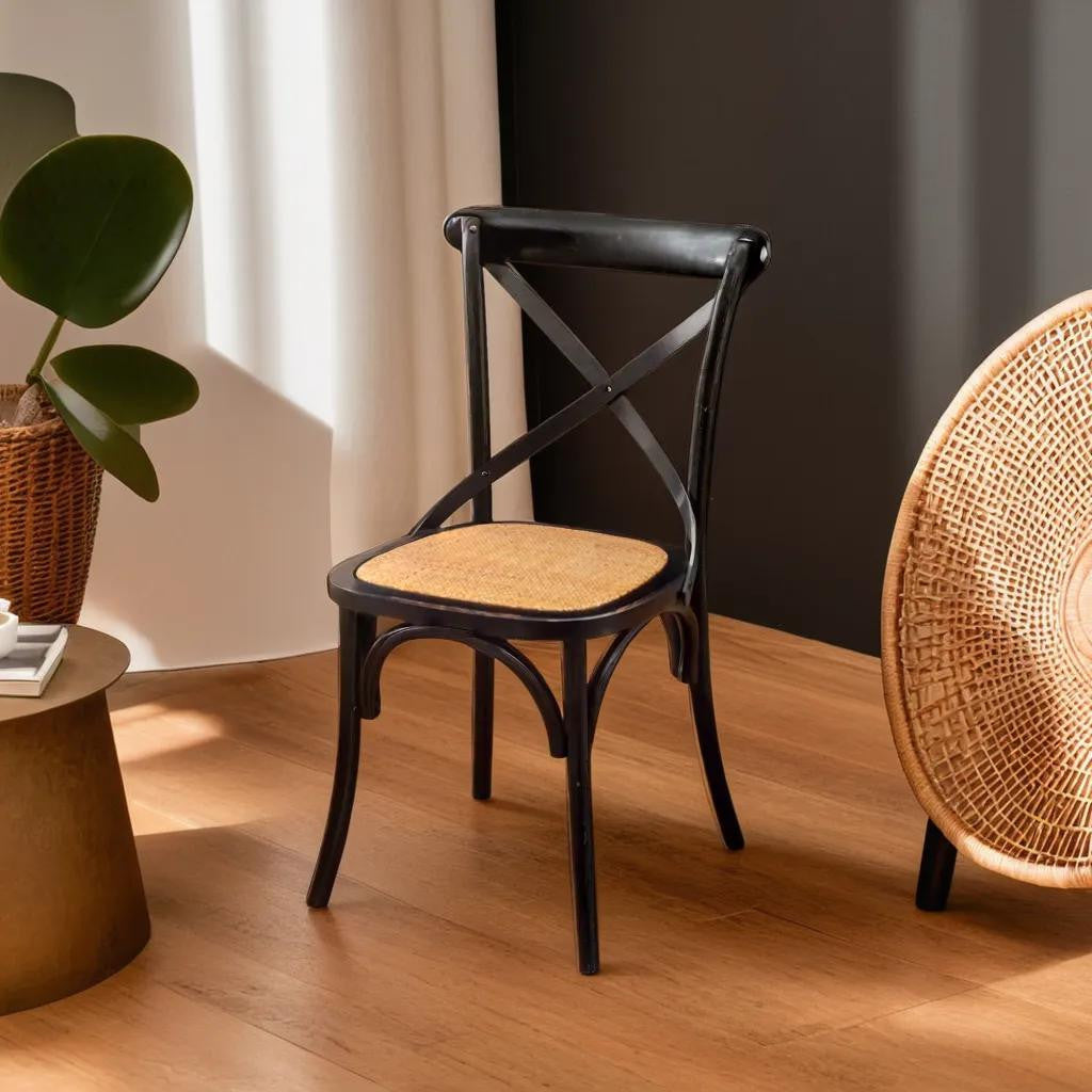 Sedia larghezza 48 cm, profondità 52 cm, altezza 88 cm in stile Thonet realizzata in massello di frassino con schienale incrociato e seduta in fibra di rattan intrecciata. Grazie al loro design da bistrot è ideale per arredare in stile vintage qualsiasi ambiente o locale, senza rinunciare alla comodità.