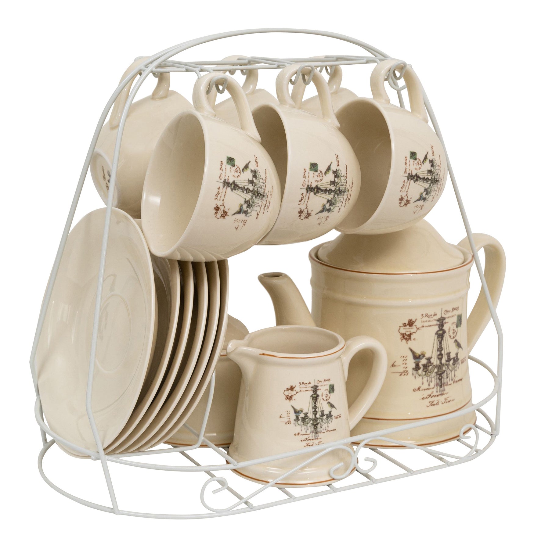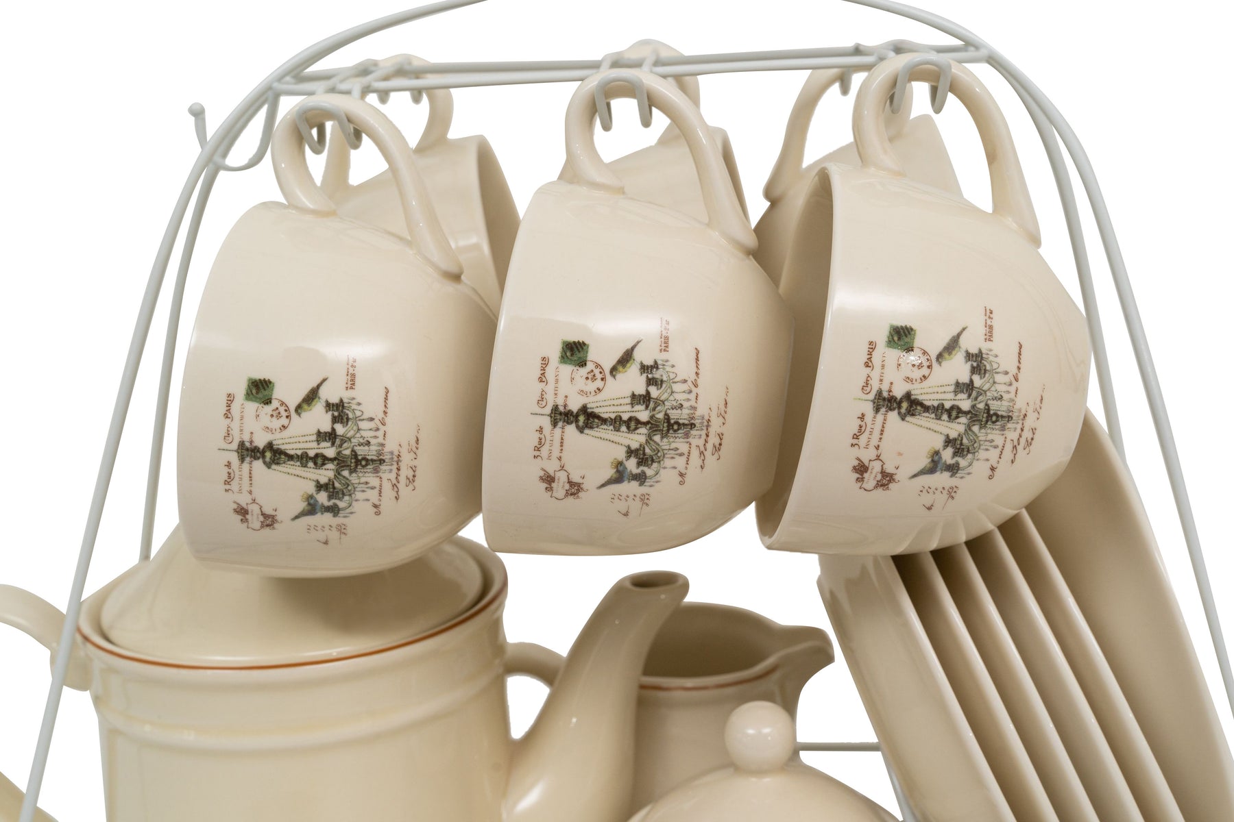 Set colazione in porcellana, composto da 15 pezzi finemente decorati: 6 tazze (L9xPR9xH7 cm cad.), 6 piattini (L16xPR16xH1 cm cad.), teiera (L23xPR14xH20 cm), lattiera (L12xPR7xH9 cm), zuccheriera (L7,5xPR7,5xH7 cm). Il tutto è racchiuso in un comodo stand in metallo che lo rende ideale per ottimizzare gli spazi a disposizione.