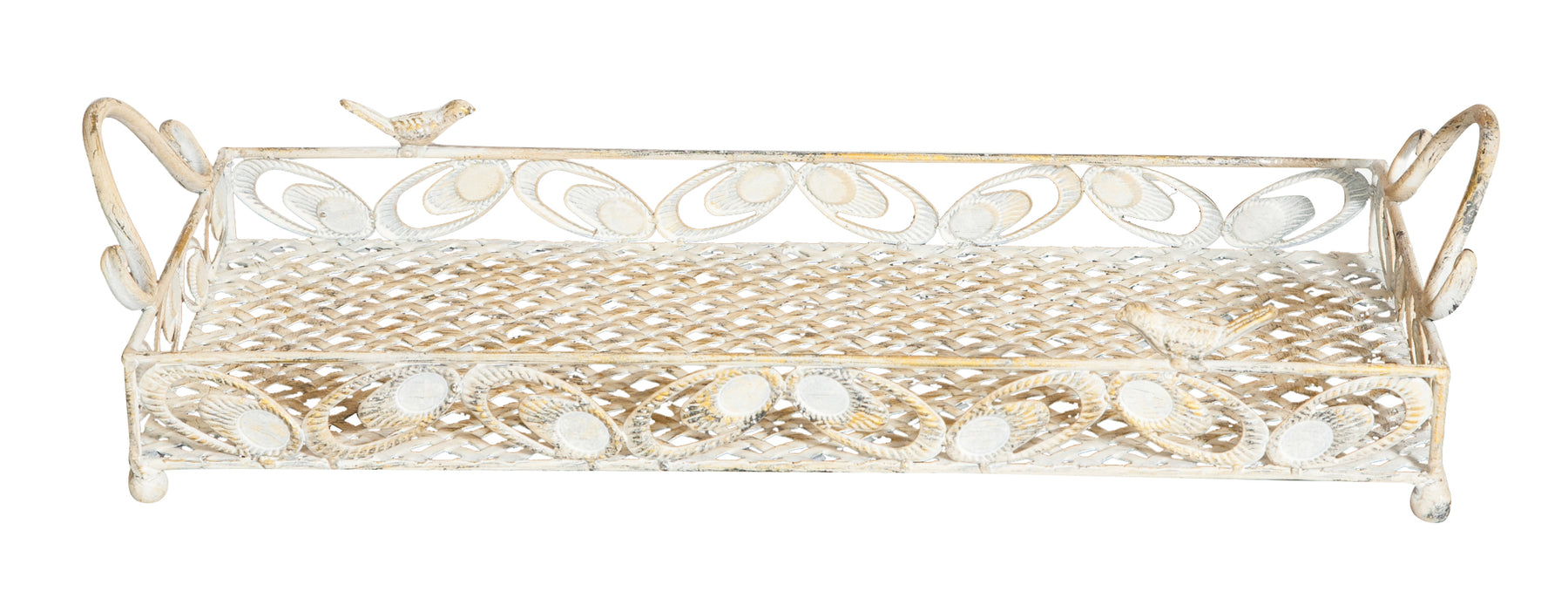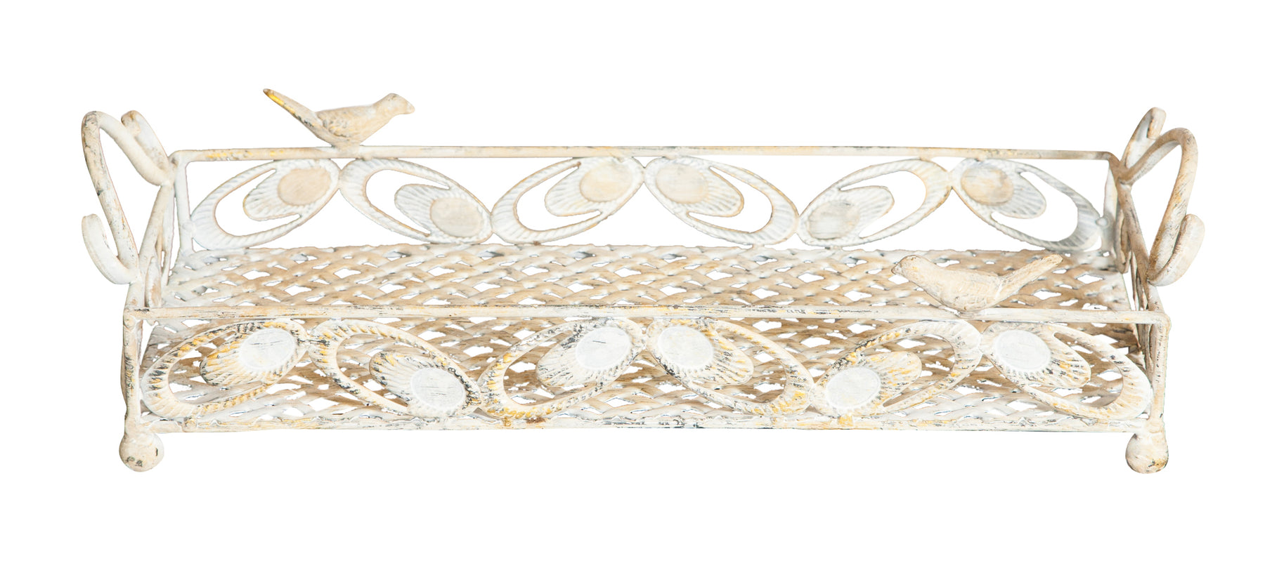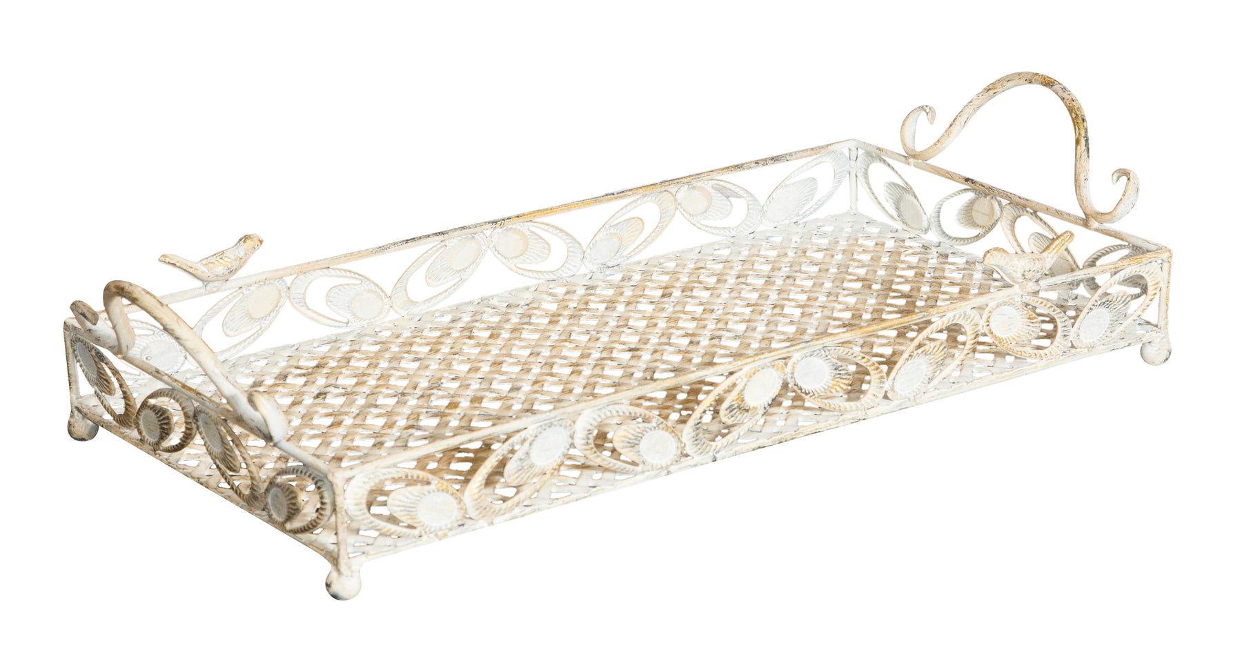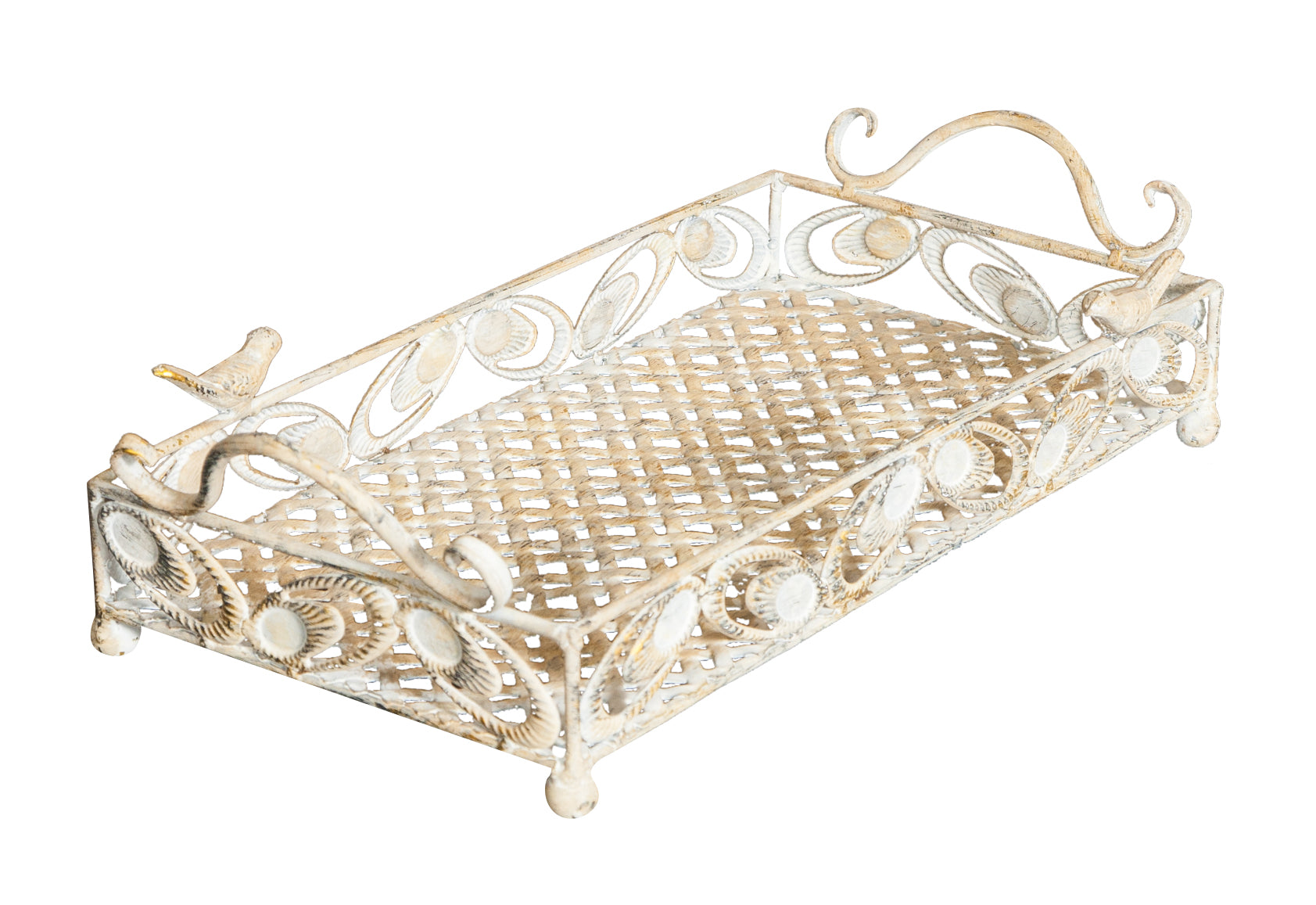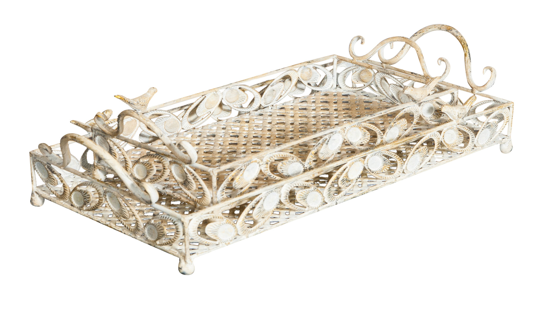 Set di due vassoi in ferro lavorato completamente a mano, con curata finitura bianca anticata. Misure L57XPR26XH12 cm + L43XPR19XH10 cm. Ideali anche come contenitori per esterni ed interni.