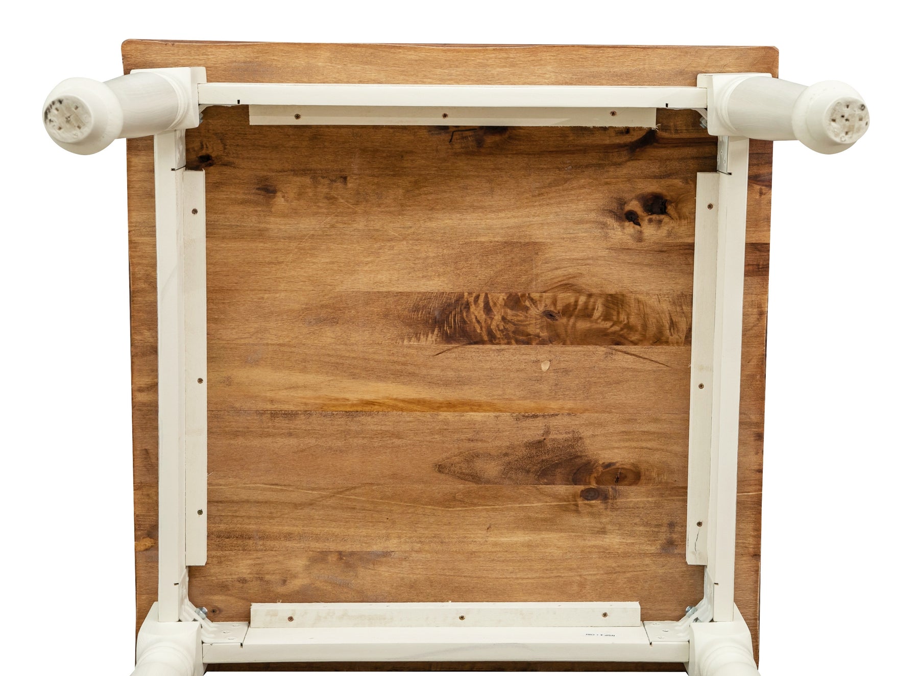 Tavolo quadrato interamente in legno massello di tiglio. Qualità estetiche e solidità nel tempo sono garantite dalla accurata lavorazione artigianale Made in Italy. Il contrasto cromatico tra la struttura bianca ed il piano noce dona un fascino in stile Country ideale completamento per qualsiasi ambiente. Misure: lunghezza 90 cm profondità 90 cm altezza 78 cm.