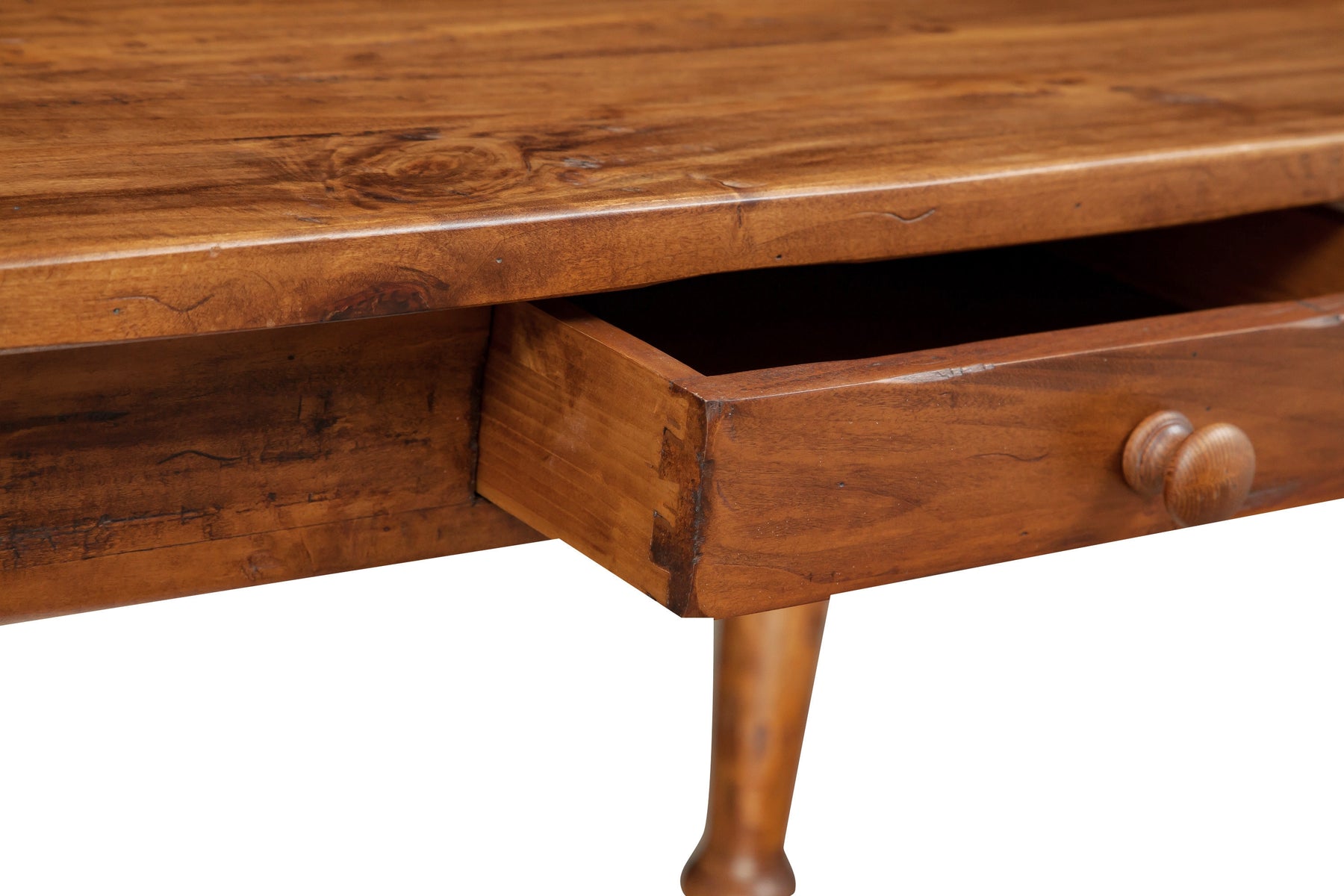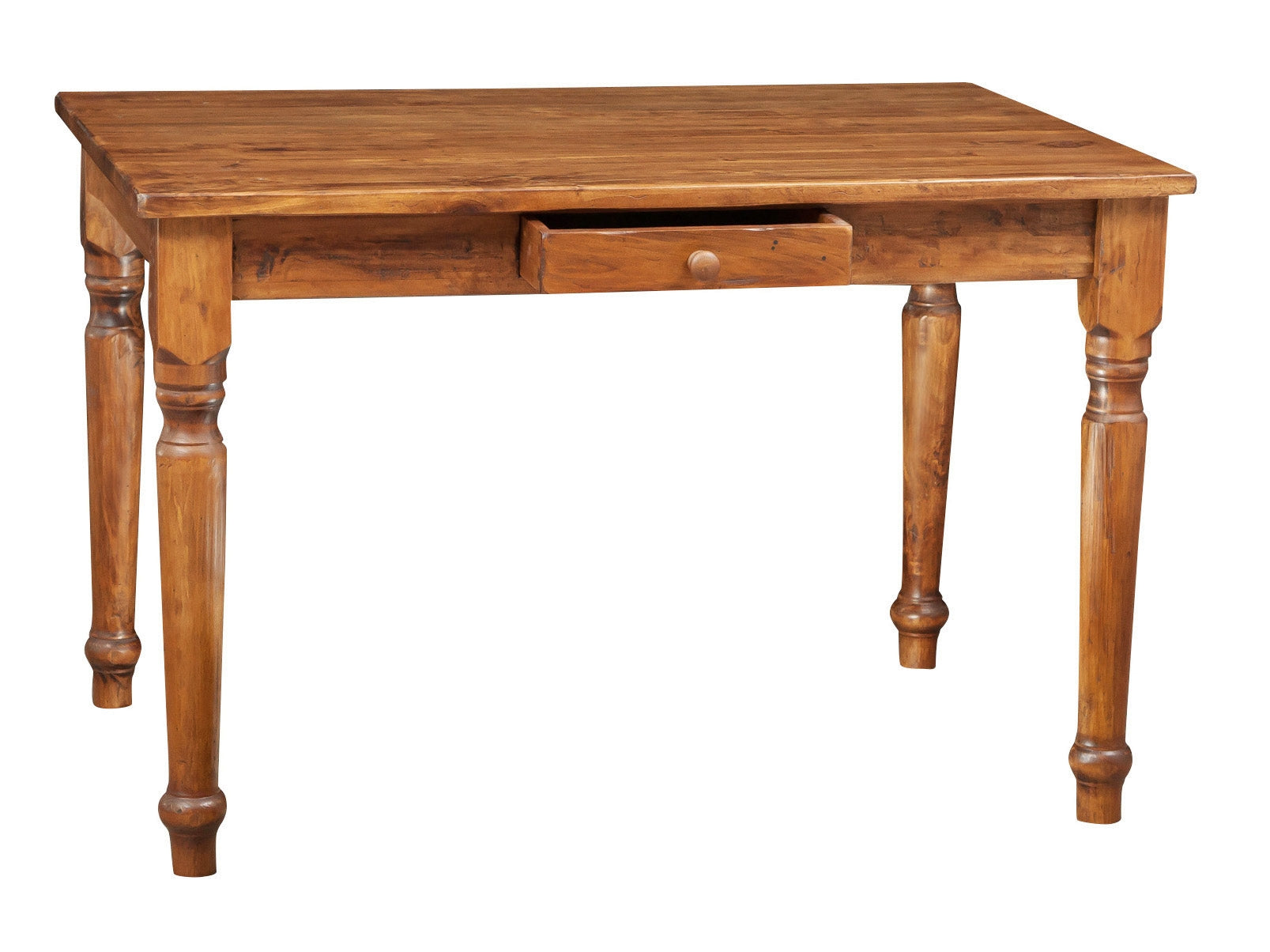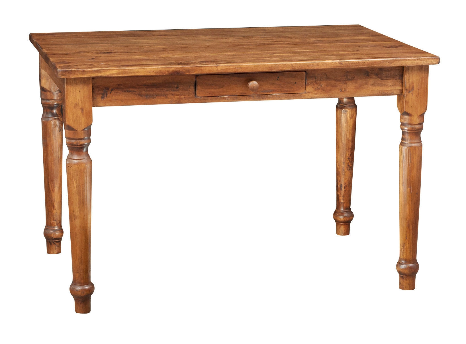 Tavolo rettangolare in legno massello di tiglio, di dimensioni lunghezza 120 cm, profondità 80 cm, altezza 80 cm. Ineguagliabile robustezza e resistenza nel tempo, sono garantite dalla scrupolosa lavorazione artigianale Made in Italy. Il pratico cassetto centrale realizzato con incastri a coda di rondine e pomello in legno, unito al design classico lo rendono abbinabile a qualsiasi ambiente con un tocco di stile Country.