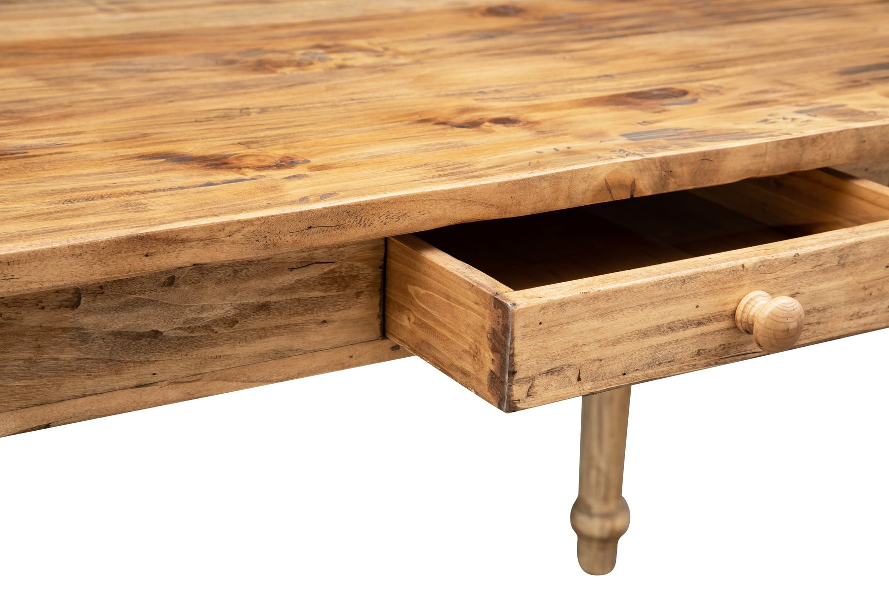 Tavolo rettangolare in legno massello di tiglio, di dimensioni lunghezza 120 cm, profondità 80 cm, altezza 80 cm. Ineguagliabile robustezza e resistenza nel tempo, sono garantite dalla scrupolosa lavorazione artigianale Made in Italy. Il pratico cassetto centrale realizzato con incastri a coda di rondine e pomello in legno, unito al design classico lo rendono abbinabile a qualsiasi ambiente con un tocco di stile Country.