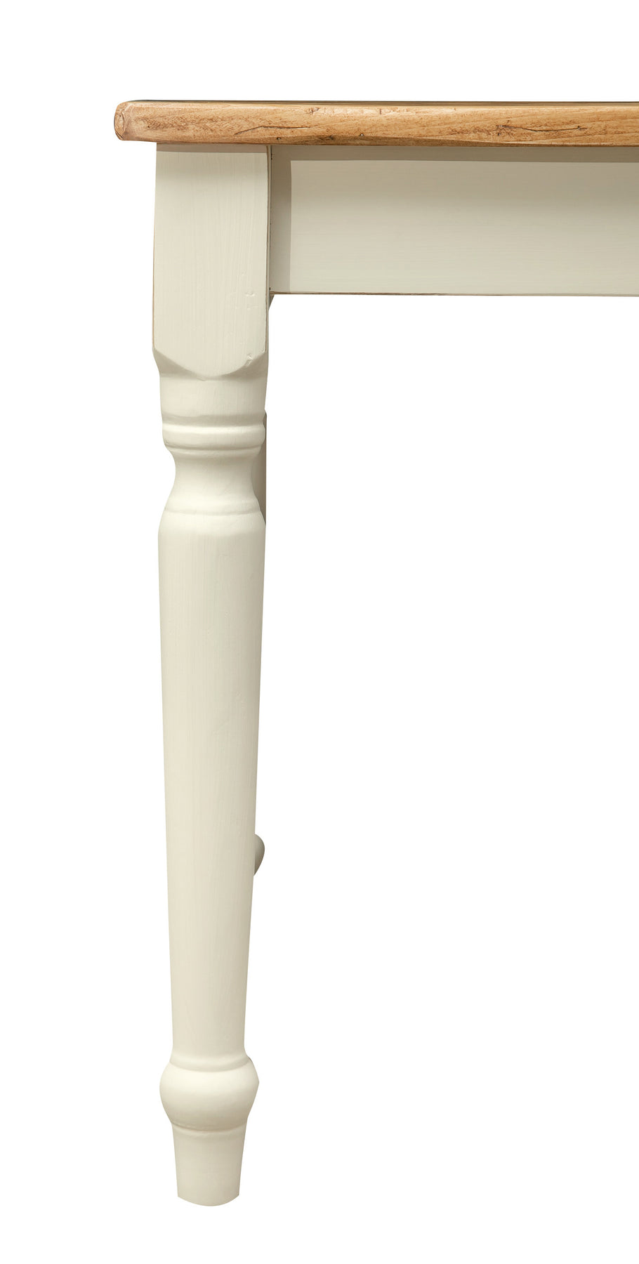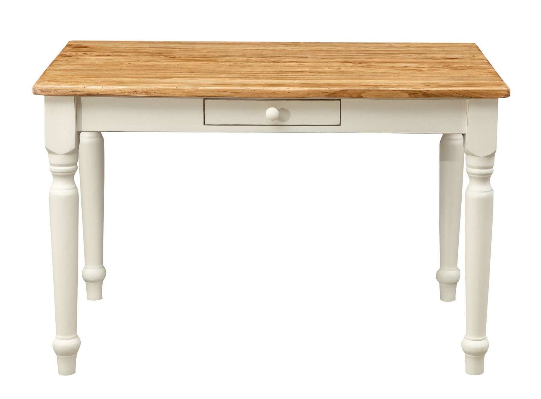 Tavolo rettangolare in legno massello di tiglio, di dimensioni lunghezza 120 cm, profondità 80 cm, altezza 80 cm. Ineguagliabile robustezza e resistenza nel tempo, sono garantite dalla scrupolosa lavorazione artigianale Made in Italy. Il pratico cassetto centrale realizzato con incastri a coda di rondine e pomello in legno, unito al design classico lo rendono abbinabile a qualsiasi ambiente con un tocco di stile Country.