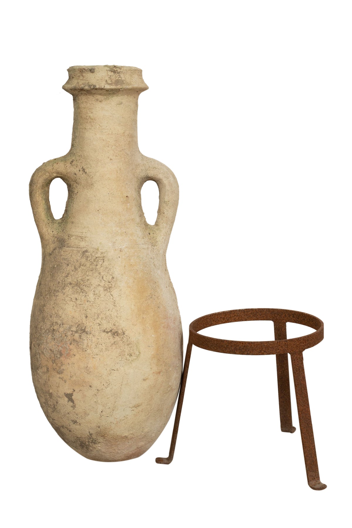 | Vecchia anfora a due manici di dimensioni diametro 28 cm, altezza 63 cm, realizzata in terracotta. Anticamente utilizzata come contenitore per il trasporto dell'acqua, differendo misure e tonalità di colore, ogni pezzo è un pezzo unico. Venduta insieme alla base portavaso in ferro battuto forgiato a mano non trattato di dimensioni diametro 21 cm e altezza 21 cm. La lavorazione interamente fatta a mano rende ogni articolo un pezzo unico. Tutte le misure si riferiscono all'ingombro massimo dell'articolo. |