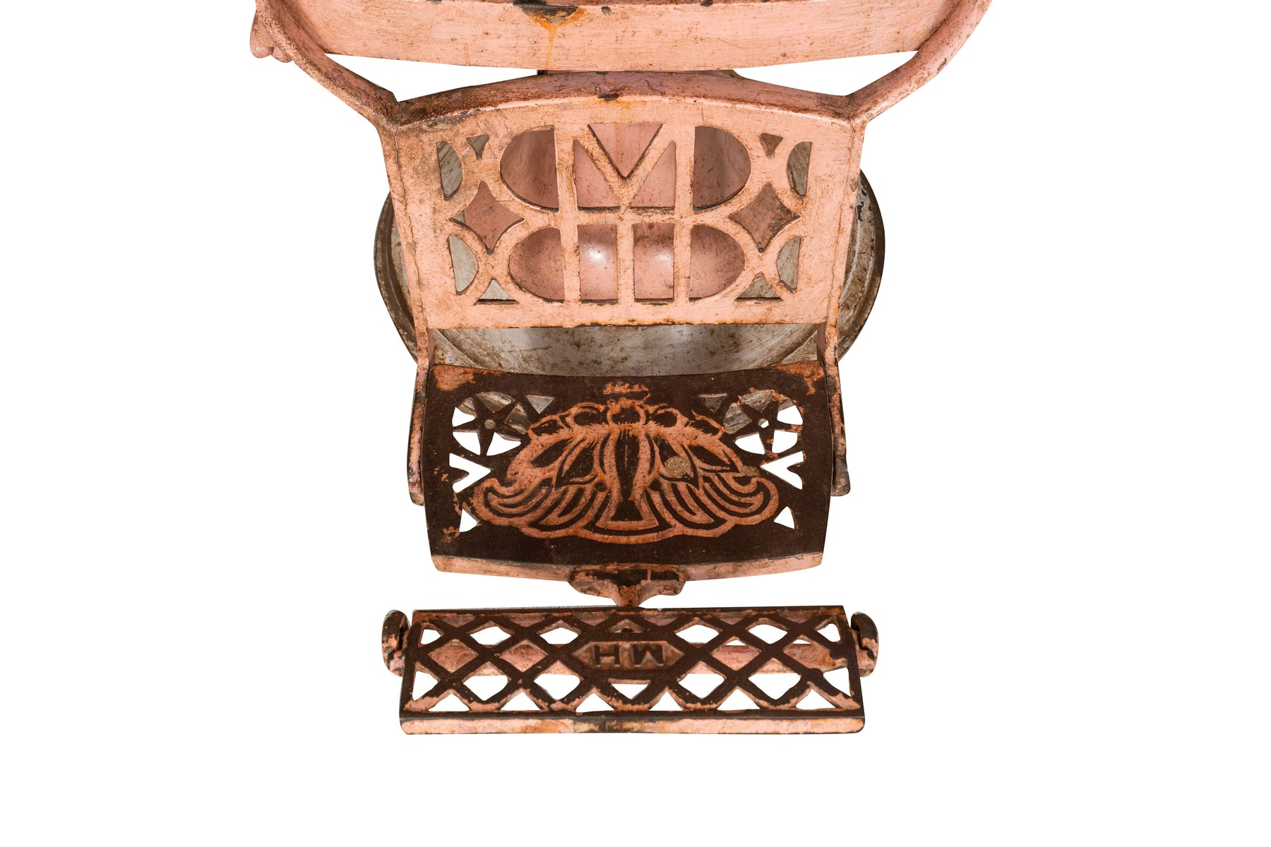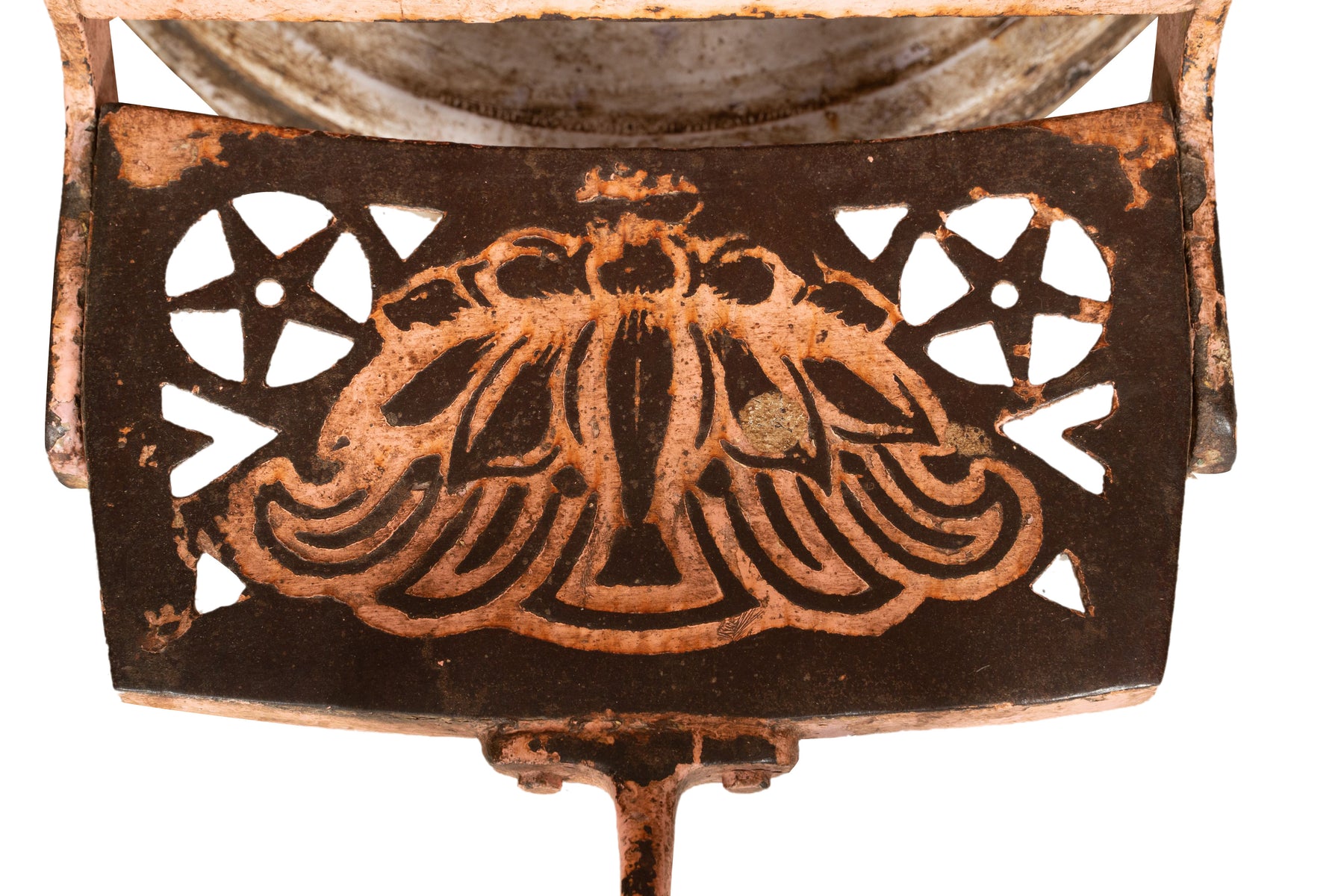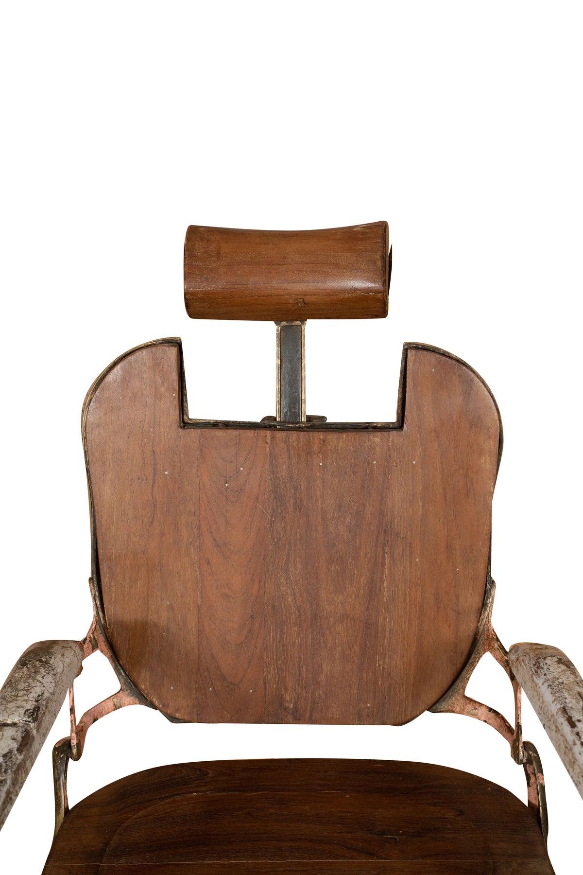 Antica seduta da barbieri di dimensioni larghezza 58 cm, profondità 110 cm, altezza 110 cm. Questa poltrona è una originale poltrona anni ‘800 finemente restaurata in ferro e ghisa, seduta e spalliera rivestita in legno.
