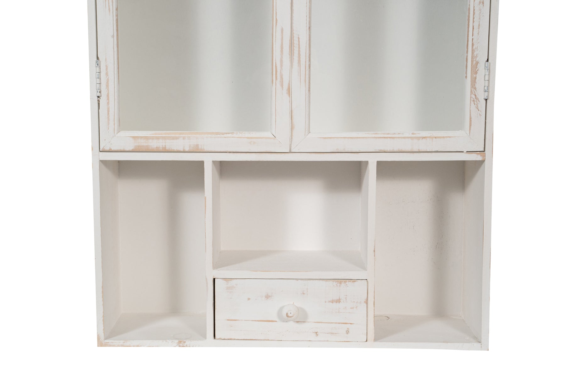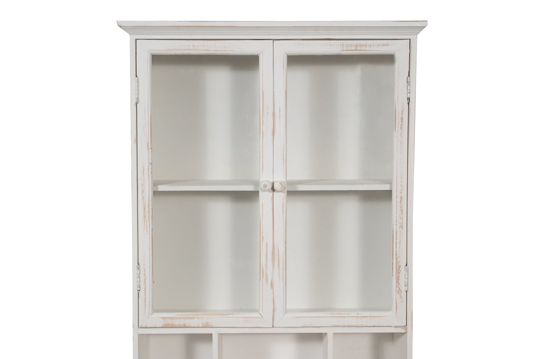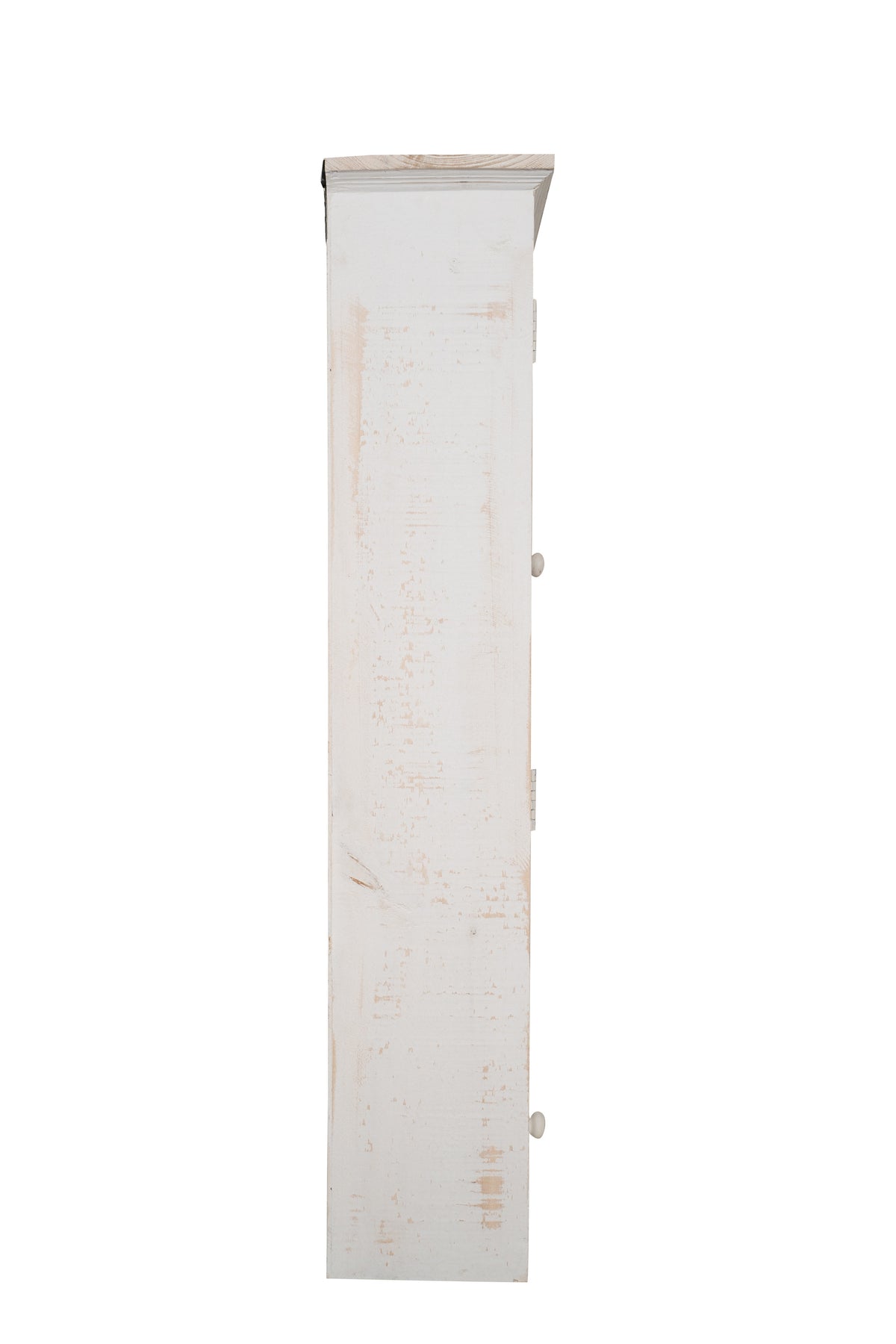 | Vetrinetta in legno finitura bianca anticata di dimensioni lunghezza 60 cm, profondità 18 cm, altezza 89 cm, stile shabby. Tutte le misure si riferiscono all'ingombro massimo dell'articolo. |