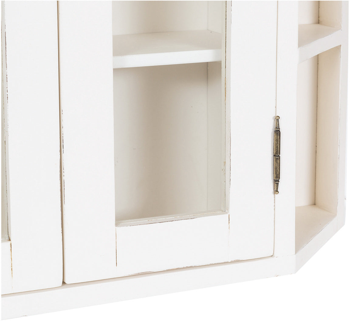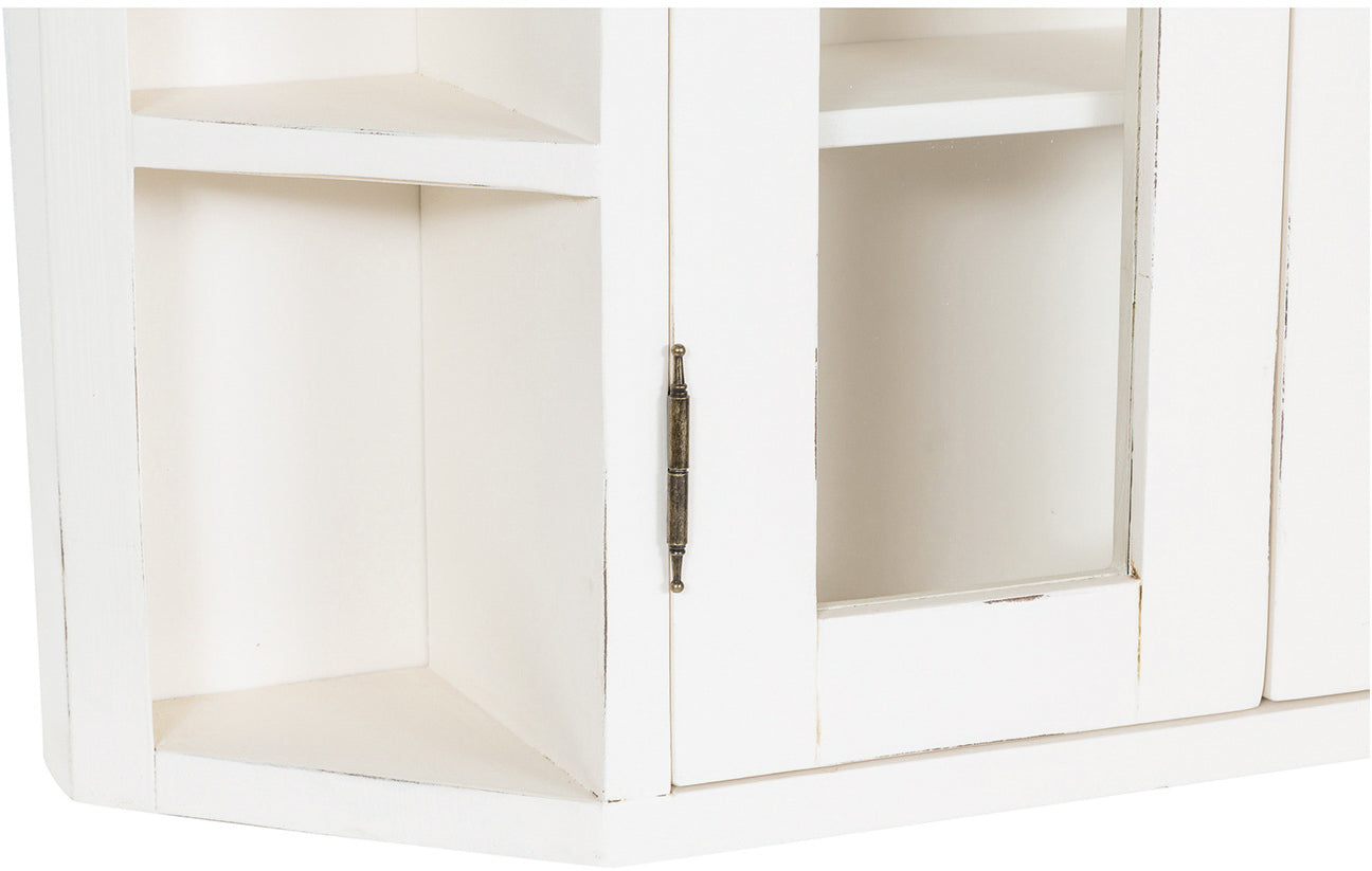 Vetrinetta scantonata da appendere L86xPR21xH75 cm in legno massello di tiglio. È dotata di tre capienti ripiani protetti da due ante a vetro con pomelli in legno e due funzionali vani a giorno laterali. Resistente e solida, curata nei mini dettagli grazie alla lavorazione artigianale Made in Italy, vanta un design originale che la rende perfetto per qualsiasi ambiente e stile.