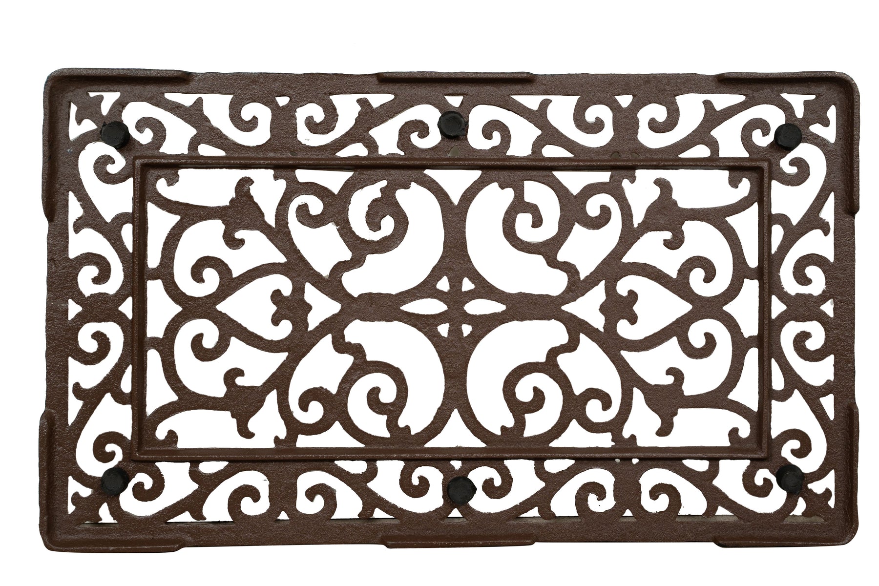 Zerbino rettangolare di dimensioni L58xPR34xH1,5 cm realizzato in ghisa. Finemente decorato, è completo di piedini in gomma. Dal disegno classico, per dare un tocco di eleganza alla vostra casa o all'ingresso del vostro terrazzo