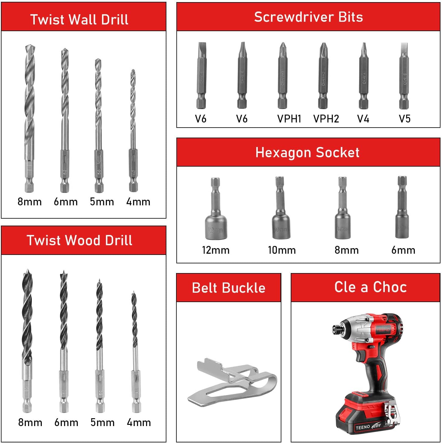 - Regalo ideale: 1 cacciavite universale da 20 V, 1 batteria da 2,0 Ah, 1 caricabatterie, 1 borsa per attrezzi, 4 trapani da parete attorcigliati, 4 punte per legno intrecciate, 4 punte esagonali, 6 viti a vite, 1 fibbia per cintura, 1 manuale d'uso.