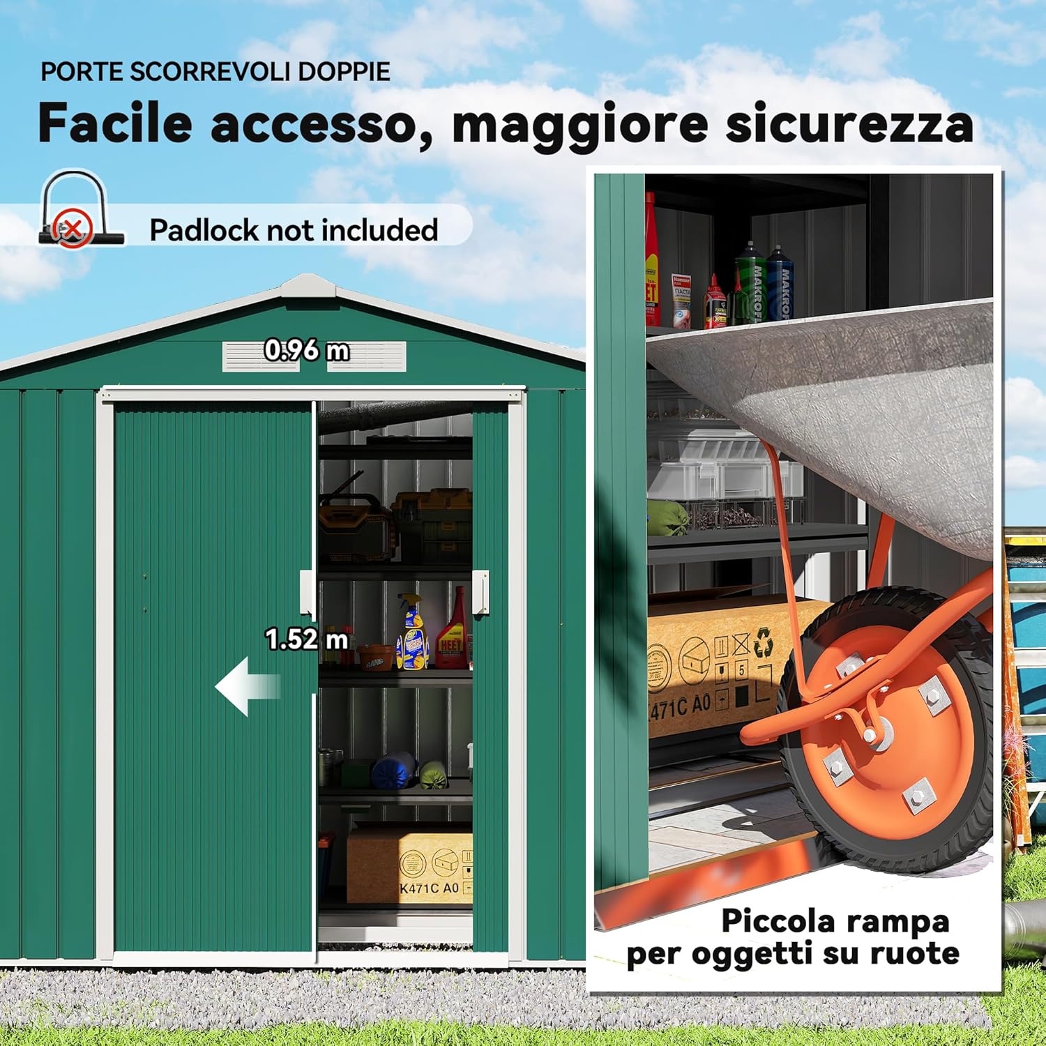 - DESIGN PRATICO: Il capanno porta utensili dispone di 2 porte scorrevoli per una accesso facilitato. Le porte proteggono i tuoi oggetti dalla polvere e possono essere chiuse con un lucchetto (non incluso) per la massima sicurezza. Il tetto inclinato evita l'accumulo di pioggia.