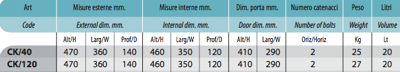 Nome: cassaforte a mobile armadio portachiavi serie “SECRET-CK” con chiave a doppia mappa Dotazioni di serie: n° 1 cassaforte a mobile Caratteristiche del prodotto: corpo monoblocco saldato e molato con sistemi automatici robotizzati; serratura di sicurezza con 6 leve asimmetriche e indipendenti con chiave a doppia mappa; estrazione della chiave impossibile a catenacci rientrati; protezione al meccanismo della serratura con piastra in acciaio al manganese; ganci metallici, completi di numerazione adesiva; verniciatura a polvere termoindurente con essiccazione a forno - cassaforte a mobile portachiavi composta da 40 ganci - frontale e porta mm. 8 - corpo mm. 3 - 4 fori di ancoraggio sullo schienale e tasselli di fissaggio in dotazione ­- catenacci in acciaio nichelato, girevoli, diametro mm. 22 - taglio laser Dimensioni esterne (LXPXH) cm.: 36x14x47h Colore: grigio come da foto Installazione: monoblocco Conformità: UNI EN 14450; UNI EN 1143-1; ISO 9001 Tempi di approntamento: affidato al corriere in 5-10 gg. lavorativi circa Tempi di consegna del corriere: 2-5 gg. lavorativi / 7 gg. lavorativi per Isole dall'affidamento al corriere Destinazione d’uso: interno, hotel Informazioni utili: possibilità di scegliere la composizione con 120 ganci con bandiera interna, all'interno del menù a tendina   Dettagli aggiuntivi o richieste dovranno essere inserite nelle NOTE dell’ordine o inviate ad info@castellanishop.it