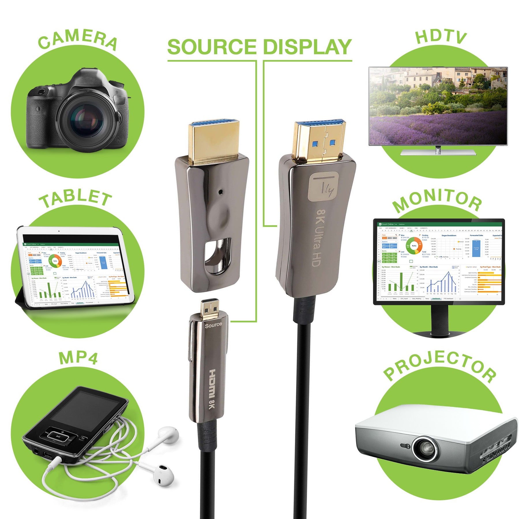 Il cavo HDMI™ ibrido, o cavo in fibra ottica attivo Active Optical Cable (AOC), consente la trasmissione di segnali video e audio ad alta qualità su lunghe distanze senza perdita di qualità. I segnali provenienti da fonti come il Blu-ray, lettori multimediali, DVD, SAT etc. vengono ricevuti da TV UHD e FullHD e proiettori con una risoluzione fino a 8K@60Hz.