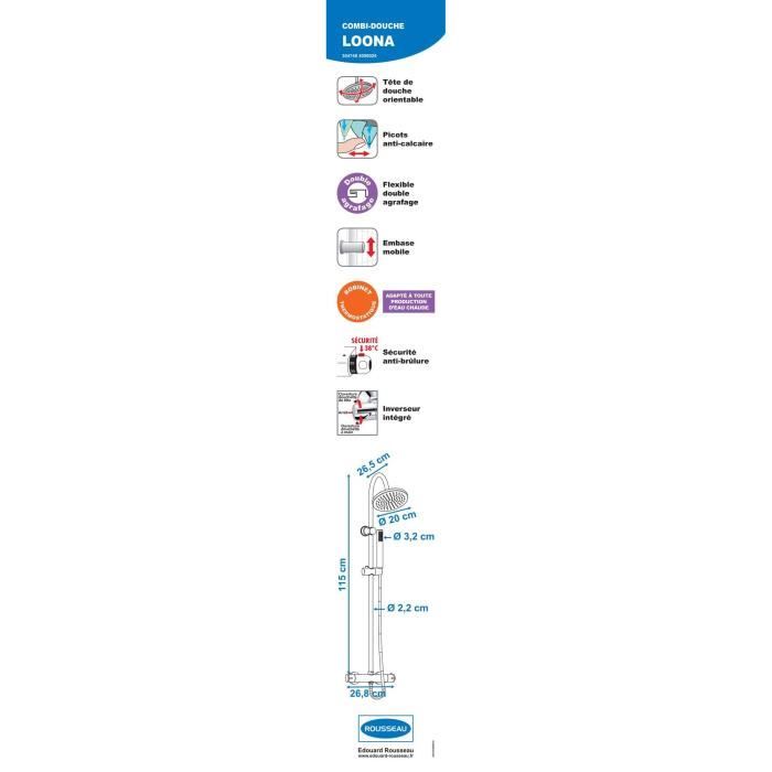 ROUSSEAU termostatico Combi-doccia LOONA cromo - Garanzia del produttore 2 anni - Repellent - Doccia supporto della testina: Tilt - Crossover: dischi in ottone e ceramica - la doccia: 3 getti (pioggia, massaggi, bolle) - Valvole: termostatica + testa in ceramica - di sicurezza della temperatura : 38 °.