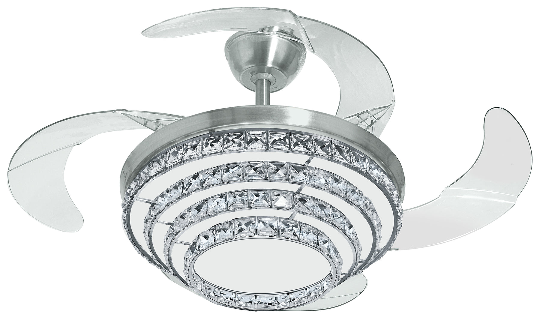 Johnson ChandelierCHANDELIER è il ventilatore da soffitto elegante, adatto per ogni ambiente.Con Chandelier l’aria non viene mossa piacevolmente solo dall’alto verso il basso, ma anche l’illuminazione è garantita graziea un potente pannello a led.Quando il ventilatore è spento, le 4 pale si ripiegano sul corpo.Quando si accende il ventilatore le pale si spiegano gradualmente e cominciano a creare una fresca brezza.Grazie al suo design elegante, pale in abs trasparente e corpo in acciaio inox, copertura lampada con inserti in cristalloCHANDELIER da un tocco di lusso ad ogni stanza, che sia salotto, sala da pranzo, camera da letto o ufficio. Il funzionamento di lampada e ventilatore avviene comodamente per telecomando. Dati tecnici:Ventilatore a soffitto con pale retrattiliPotenza 70 WØ aper to 1 07 cm, Ø chiuso 48 cmStruttu ra in acciaio con inseti in cristallo3 velocità, timer 1-7h4 pale in ABS trasparenteFunzione reverse da telecomandoComando a distanza a radiofreqenza con displayLuce a LED da 36 W con tre tonalità (calda, fredda e neutra)Asta 12 cm e 25 cmAlimentazione 220 – 240V~ 50/60 Hz