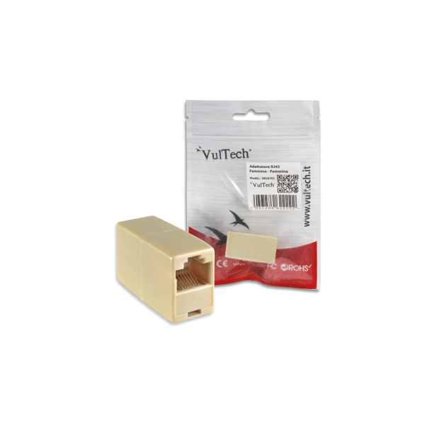 L’adattatore permette di unire due cavi Rj45 appartenenti alla stessa categoria: Cat5-Cat5, Cat6-Cat6.