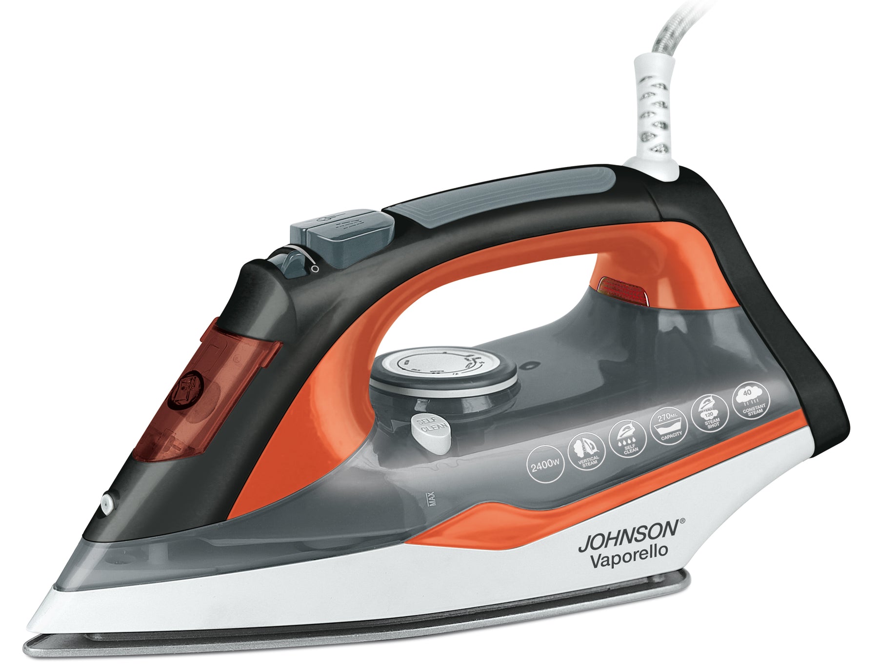 Più vapore, stiratura perfetta. Il ferro da stiro a vapore VAPORELLO pratico ed efficace.Mai più nessuna piega grazie al potente getto di vapore e all’ottima piastra rivestita in Teflon multi fori ad alta scorrevolezza.Vaporello è dotato di un sistema di regolazione del vapore per stirare velocemente e perfettamente ogni tipo di tessuto, dalla seta al jeans.La sua leggerezza lo rende comodo, maneggevole e facile da usare.Inoltre, la funzione vapore in verticale è ideale per avere tende sempre perfette. Il ferro da stiro è dotato dello speciale sistema autopulente self-Clean.Dati tecnici:• Piastra in teflon• Potenza: 2400 W• Temperatura regolabile• Super vapore (anche in verticale)• Vapore regolabile• Colpo di vapore• Serbatoio trasparente• Spray acqua• Tasto auto pulizia