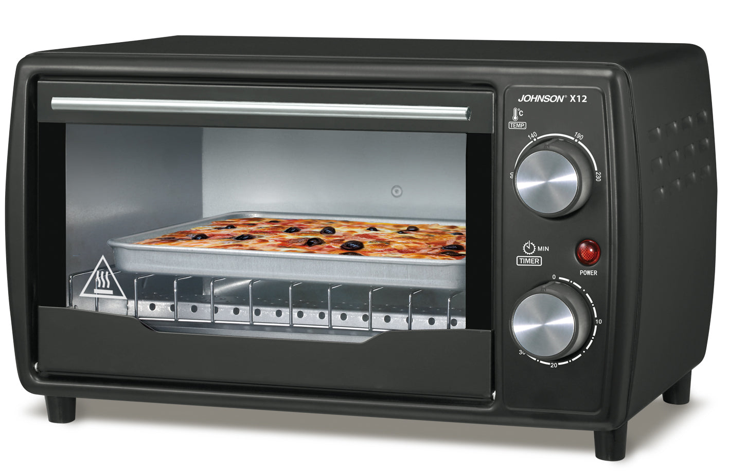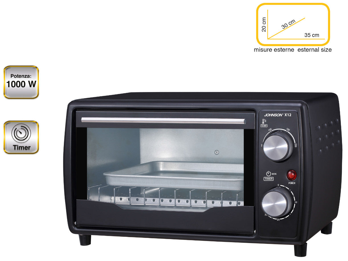 Johnson X12X12 è un forno elettrico compatto di piccole dimensioni ideale per single o piccole famiglie. Può grigliare, cuocere e tostare.Ha una potenza di 1000W con due elementi riscaldanti, uno superiore ed uno inferiore per una cottura omogenea ed uniforme.La temperatura può essere regolata fino ad un massimo di 230°C, il timer selezionabile fino a 30 minuti con segnalatore acustico di fine cottura.Spia luminosa di funzionamento, griglia e vassoio completano gli accessori in dotazione.Dati tecnici:Potenza 1000 WStaticoAccessori: griglia e tegliaManiglia termoisolataConforme alla normativa A 13Sportello con doppi vetri e pareti termoisolateRegolatore della temperatura da 90°C a 230°CTimer 0-30 min. con indicatore luminoso e sonoro di fine cotturaAlimentazione 220/240V~ 50/60 Hz