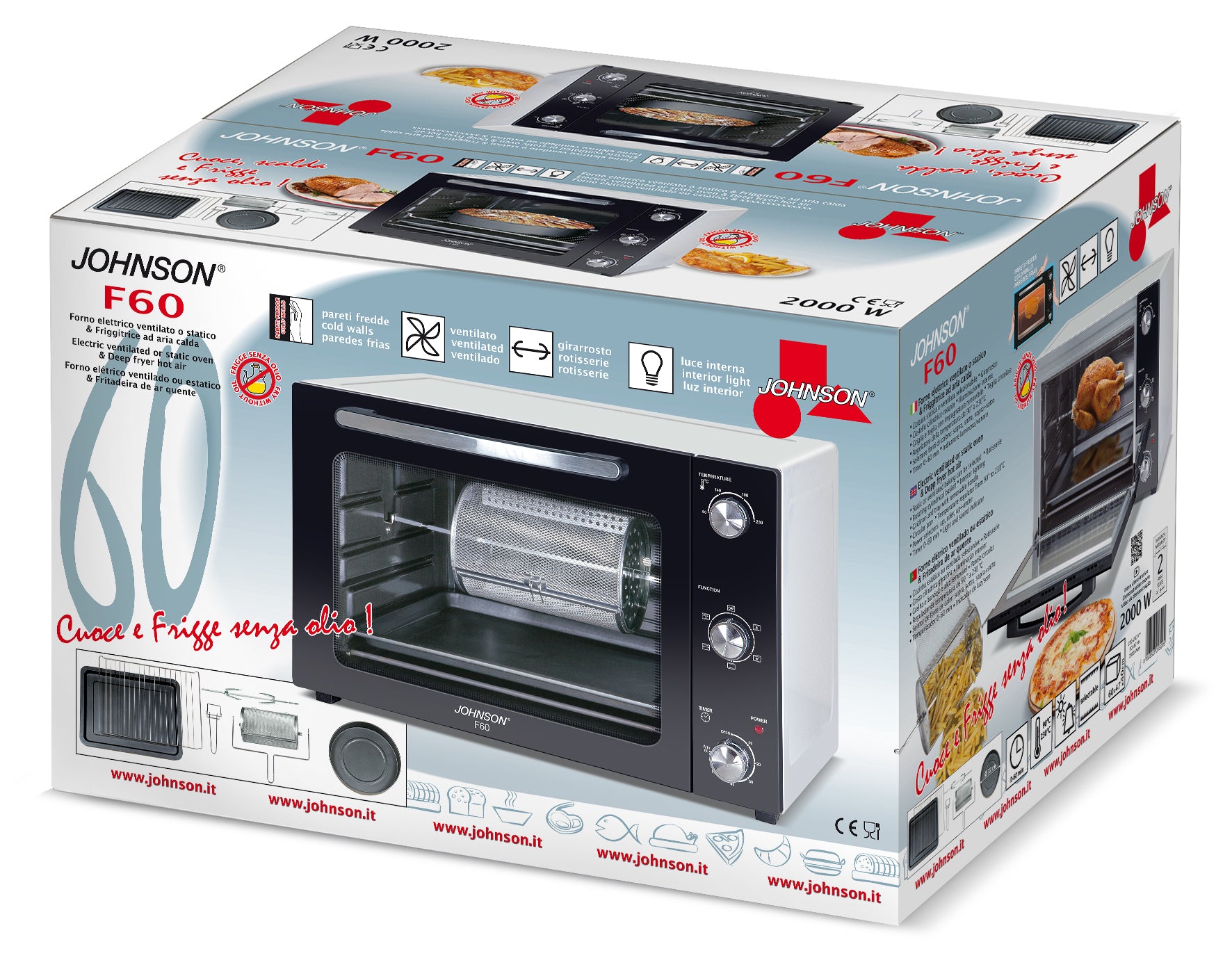 Johnson F60F60 di JOHNSON ELETTRODOMESTICI è il nuovo forno elettrico con funzione anche di friggitrice ad aria a pareti fredde della capacità di 60L.Con le sue 4 resistenze per un totale di 2000w può essere utilizzato in modalità statico o ventilato ed è l’ideale per cucinare per tutta la famiglia, oltre alla griglia e la teglia rettangolare ha in dotazione la teglia rotonda per poter cucinare la pizza, il girarrosto per cucinare allo spiedo otre al cestello che permette di friggere ad aria senza l’utilizzo di olio per una cucina più salutare.F60 dispone di un timer 0 – 60 minuti, luce interna, selettore delle fonti di calore per diverse modalità di cottura e grazie alle pareti interne ceramicate le pareti esterne rimangono sempre fredde. DATI TECNICI:Potenza: 2000WPareti freddeTimer 0 – 60 minutiStatico o ventilatoTemperatura regolabile 90 C° – 230 C°Selettore fonti di calore per diverse modalità di cotturaLuce internaTeglia rettangolare e circolareGrill, cestello, pinza e grigliaColore: BiancoSpina SHUKO con terra